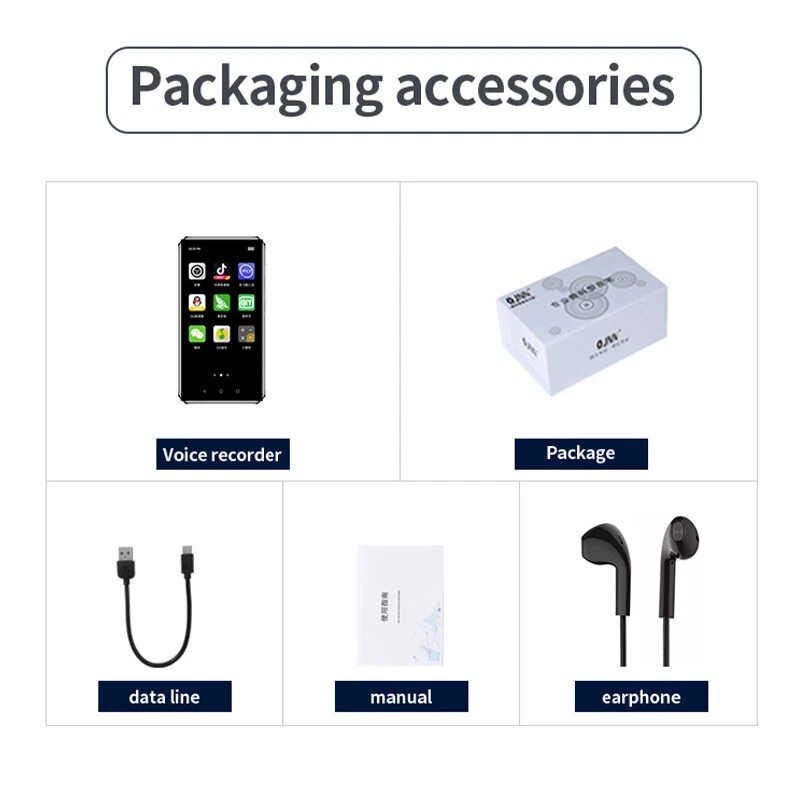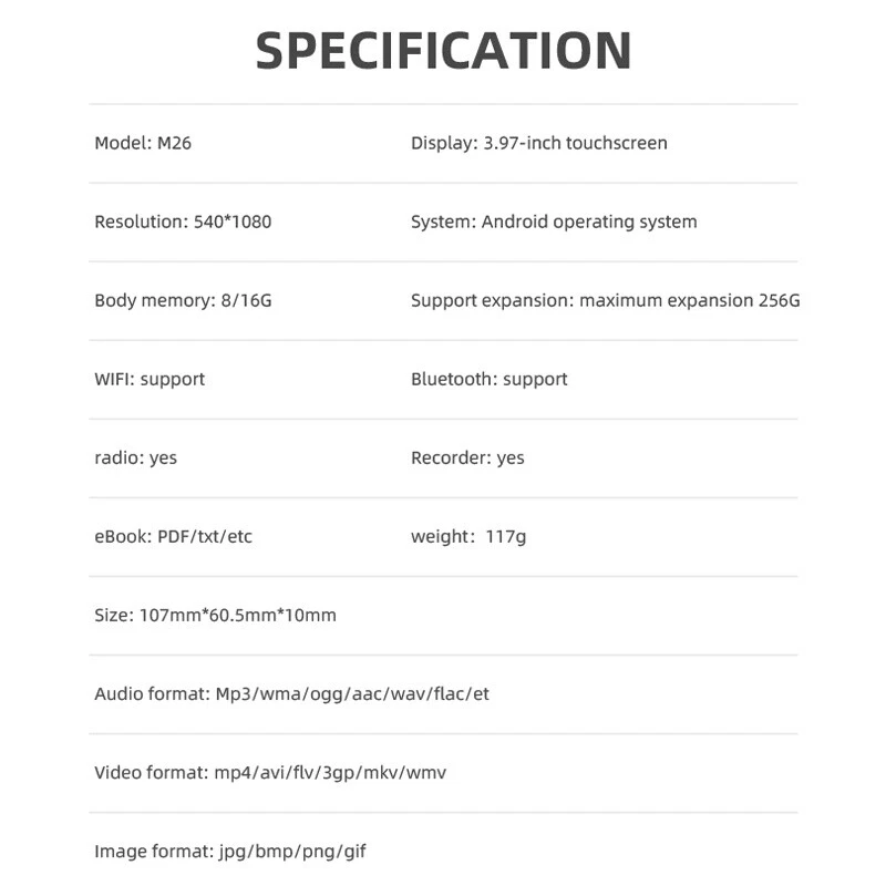 SAFE & SECURE SHOPPING 100% SATISFACTION GUARANTEED FAST SHIPPING Voice Recorder 3.97" Full Touch Screen WiFi Android MP4 Player Audio Player FM Product Description If you have any questions, please contact customer service first, do not open disputes easily, thank you! Features: 1. Bi-directional Bluetooth 5.: 0 Say goodbye to wired tangle, efficient compatibility, easy pairing, HD transmission. 2. Expand as you like: support expansion, movies, music, novels download local more smoothly. 3. Super wide angle IPS: touch screen, wide angle IPS HD touch screen, the picture is more colorful, delicate, picture restoration more realistic. 4. type-c interface: positive and negative blind plug not loose, resistant to unplugging, fast filling does not hurt the machine. 5. Fast connection WIFI: connect to the network to listen to songs / read novels / brush video, to achieve the same as the phone connected to the network. Specification: Model: M26 Display: 3.97-inch touch screen Resolution: 540*1080 System: Android operating system Body memory: 8/16G E-book: PDF/TXT/ETC Weight: 117G Size: 107MM*60.5MM*10MM Audio format: MP3/WMA/OGG/AAC/WAV/FLAC/ETC Video format: MP4/AVI/FLV/3GP/MKV/WMV Image format: JPG/BMP/PNG/GIF Package Included: 1*Host 1*Headphone 1*Data Cable 1*Manual 1*Warranty Card 1*Packing Box Note: 1. Due to manual measurement, please allow 1-3mm error. Please make sure you don't mind before ordering. 2. Please allow 1-3 grams of weight error. Please make sure you don't mind before ordering. 3. Due to different lighting of photos and differences in monitors, the pictures may not reflect the actual color of the object. Please make sure you don't mind before ordering, thanks! About Us About Us We accept all payments authorized by eBay. Copyright © 2022 Tongtool