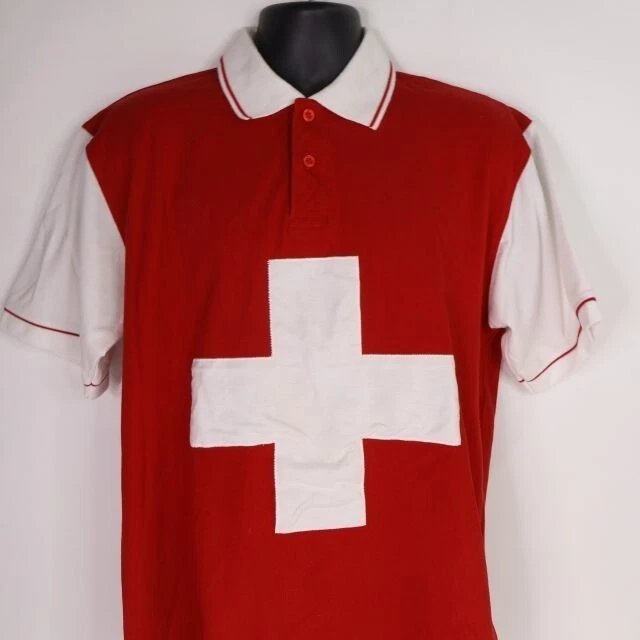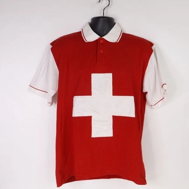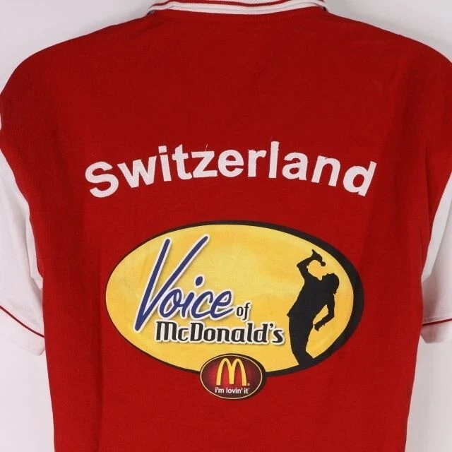 Up for your consideration is a rare shirt for the Switzerland competition for Voice of McDonald's. This competition was open to McDonald's crew members and managers in 188 countries. It started approx. 2006 and ended in 2020. The tag states the size is XL but please see my last photo for additional measurements. It seems like it runs a bit small. The average measurements for an XL is 24" from underarm to underarm with a length of 31". This shirt is 22" from underarm to underarm with a length of 28". Pre-owned and overall in good condition. There is spotting on the back as shown in the photo. The white cross is attached at the edges and is somewhat puffy from extra fabric.