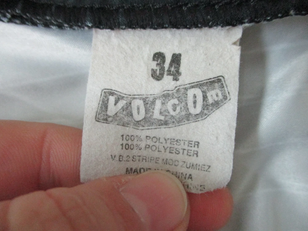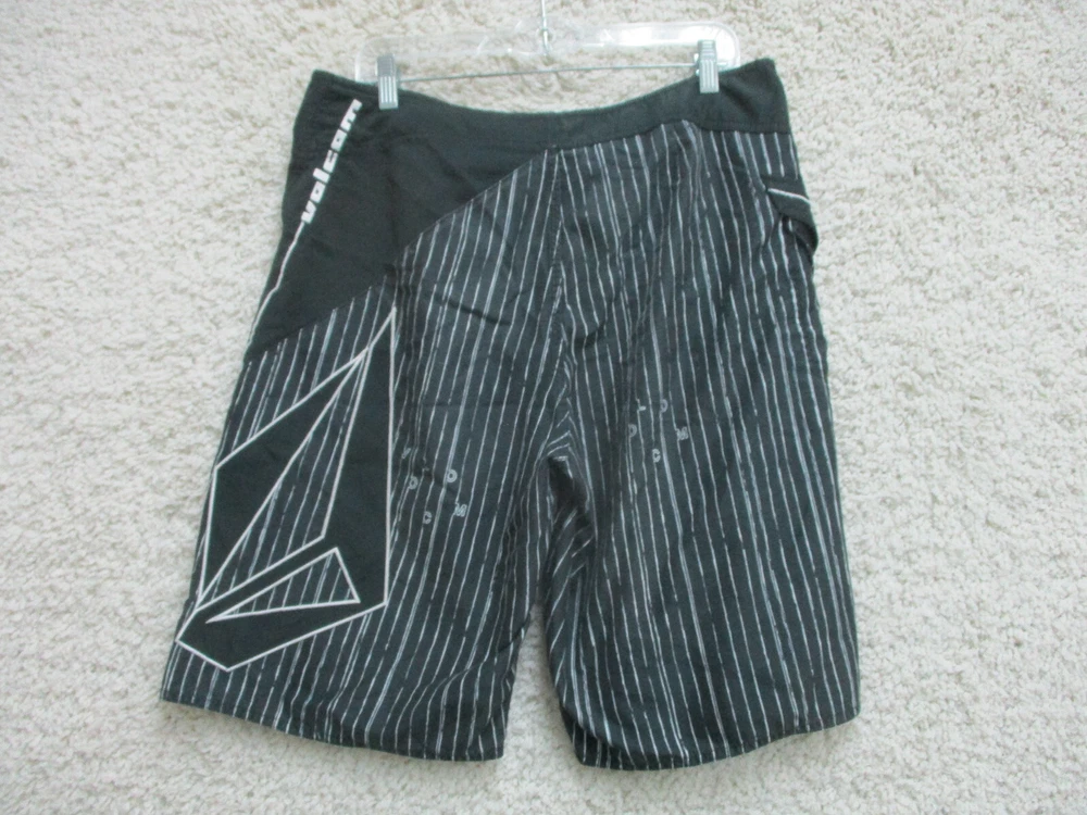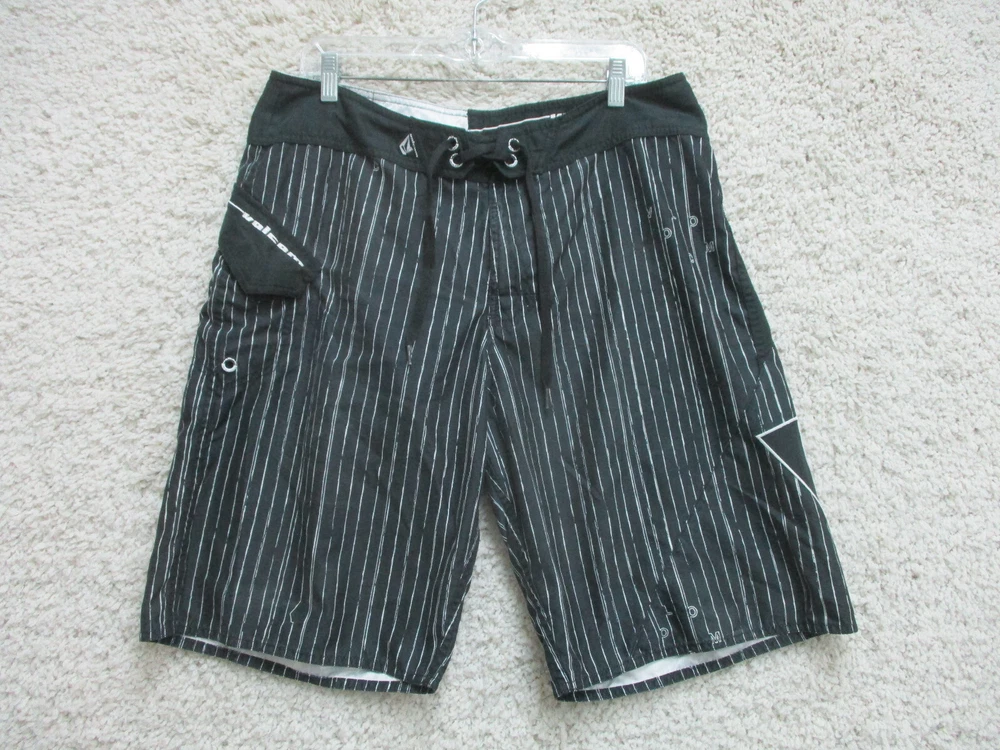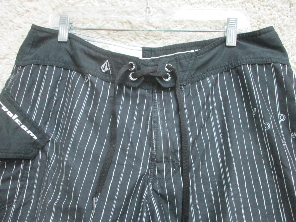 Size: 34 Vintage: Yes Seller Notes: “Very Good Used Condition. Please, See Pictures for Full Condition and Measurements.” Brand: Volcom Swim Bottom Style: Board Shorts gtin13: Does not apply Country/Region of Manufacture: China Material: Polyester Theme: Logo Features: Comfortable Fit, Drawstring, Pockets Department: Men Size Type: Regular UPC: Does not apply Garment Care: Machine Washable Fabric Type: Blended Fabric Lining Material: Polyester Type: Bottom Pattern: Pinstripe Performance/Activity: Competition, Lifeguard, Recreational, Surfing, Training, Water Polo Color: Black