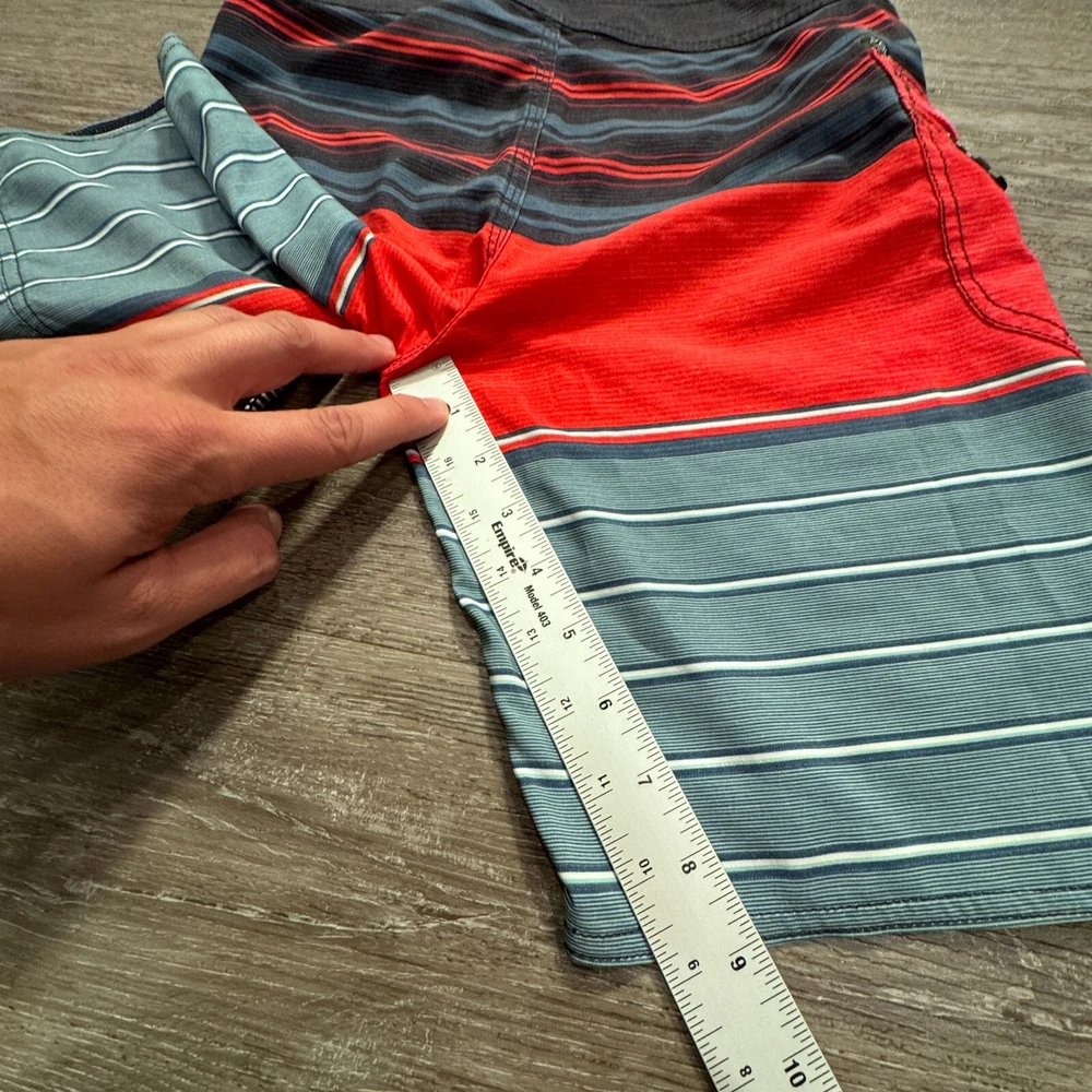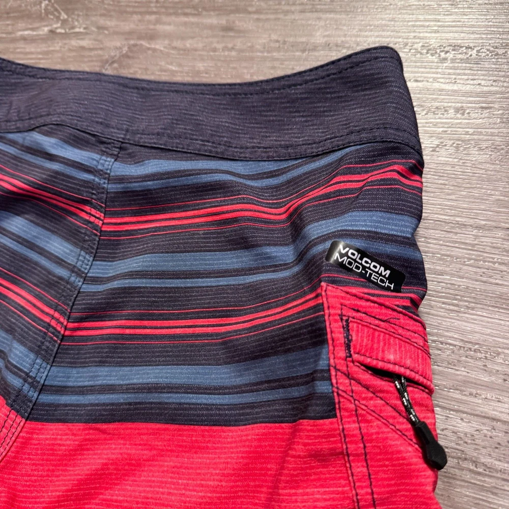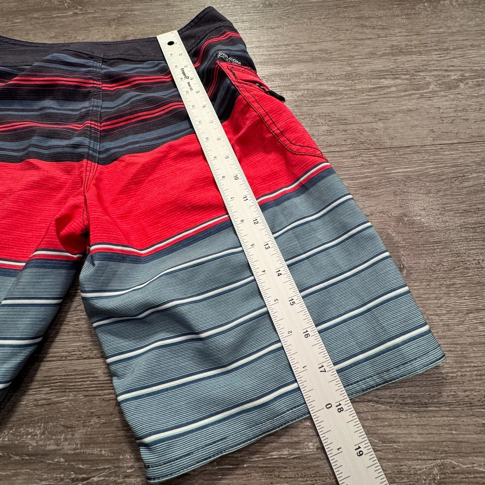Color: Multicolor Features: Stretch Size Type: Regular Closure: Drawstring Inseam: 9 in Fabric Wash: Dark Theme: Beach, Outdoor, Sports Department: Men Rise: Mid (10-12 in) Occasion: Casual Material: Polyester, Elastane Waist Size: 26 in Size: 26 Style: Board Brand: Volcom Pattern: Geometric Front Type: Flat Front