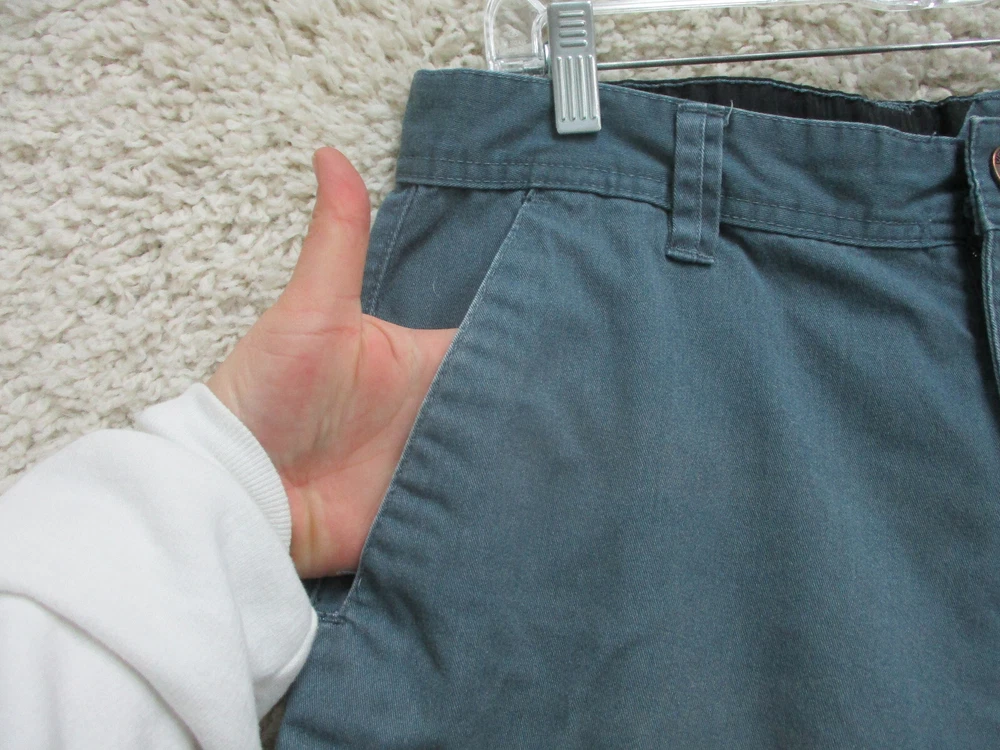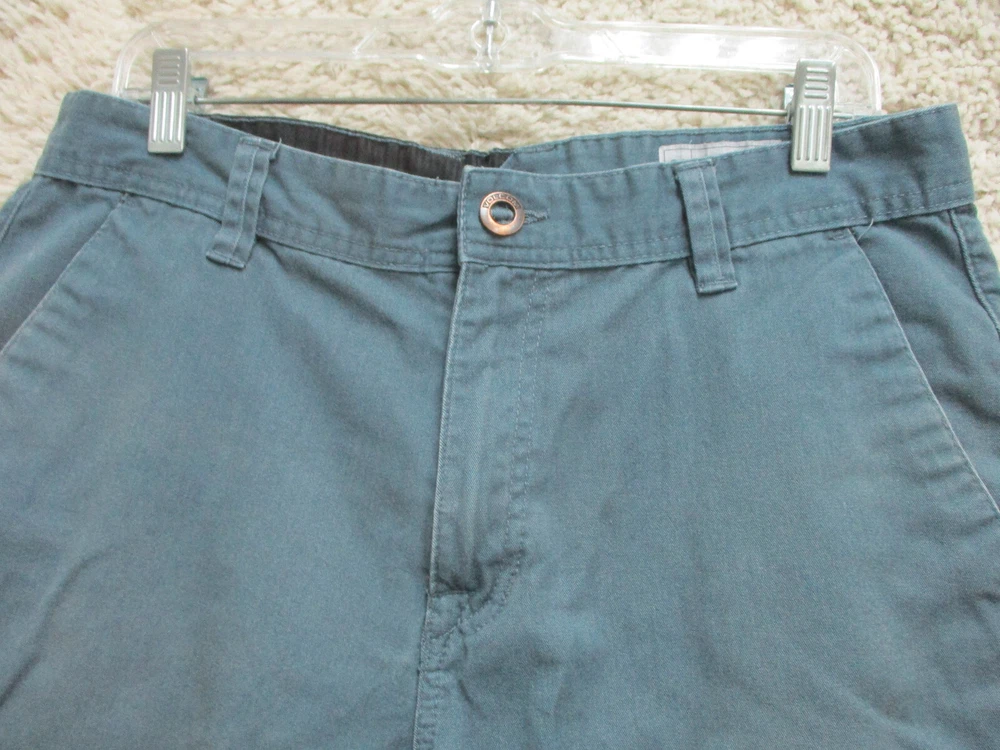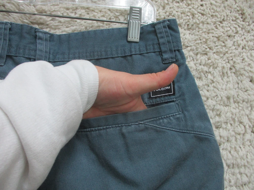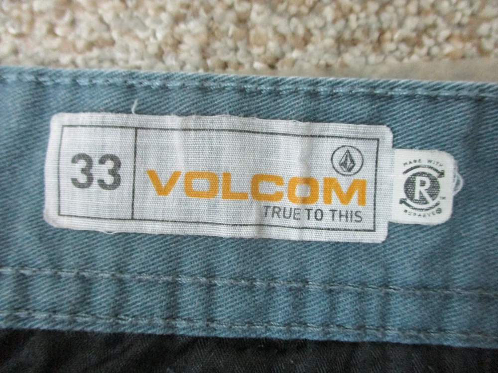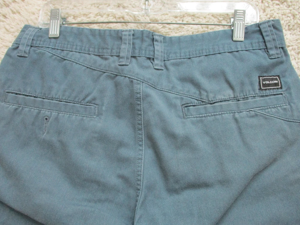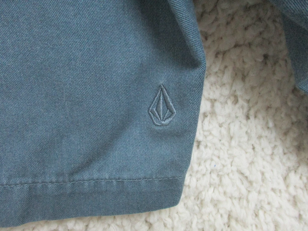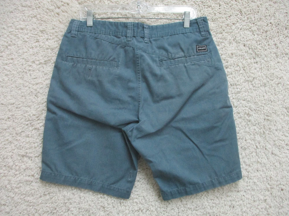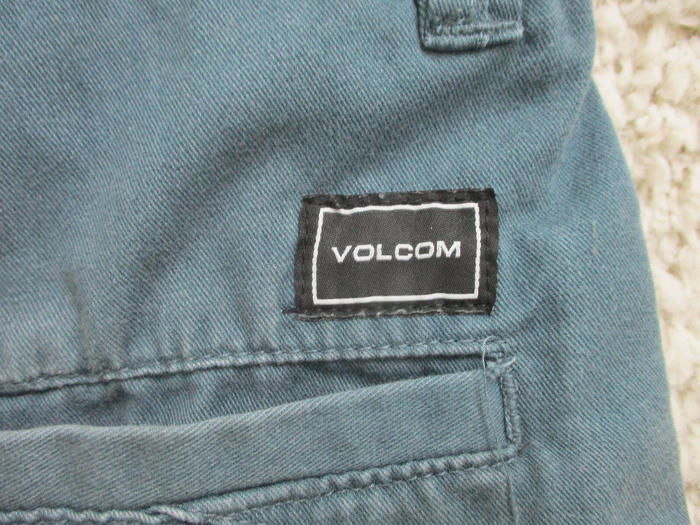 Brand: Volcom Size Type: Regular Occasion: Casual Pattern: Solid Country/Region of Manufacture: Mexico Style: Chino Garment Care: Machine Washable Color: Blue Closure: Zip Fabric Wash: Dark Accents: Button, Logo Fit: Regular Seller Notes: “Very Good Used Condition. Please, See Pictures for Full Condition and Measurements.” Rise: Mid (10-12 in) Pocket Type: Slash Pocket Material: Cotton, Cotton Blend Department: Men Features: Easy Care, Pockets Waist Size: 33 in UPC: Does not apply Front Type: Flat Front Theme: Logo, Modern, Outdoor Inseam: 10 in Season: Fall, Spring, Summer, Winter Size: 33 gtin13: Does not apply