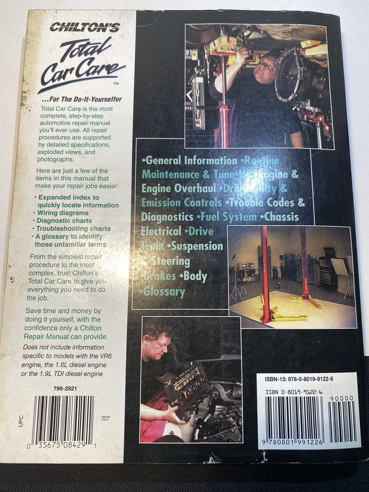 This trade paperback book titled "Ch Volkswagen Golf Jetta Cabriol 1990-98" by Haynes is a comprehensive guide for the repair and maintenance of your vehicle. The book includes detailed information on the car's make, model, and year, as well as its symptoms and diagnosis. The illustrator has done an excellent job of providing clear and accurate images to help readers understand the repairs. The book is a part of the "Total Car Care Repair Manuals Ser." series and has a publication year of 2000. It is in English language and has 352 pages. The book is not personalized, inscribed, or vintage. It is not signed or ex libris. The item weighs 16.4 Oz and has dimensions of 10.9 in x 8.2 in x 0.7 in. This book is an excellent resource for anyone looking to repair their Volkswagen, Golf, Jetta, or Cabriolet.