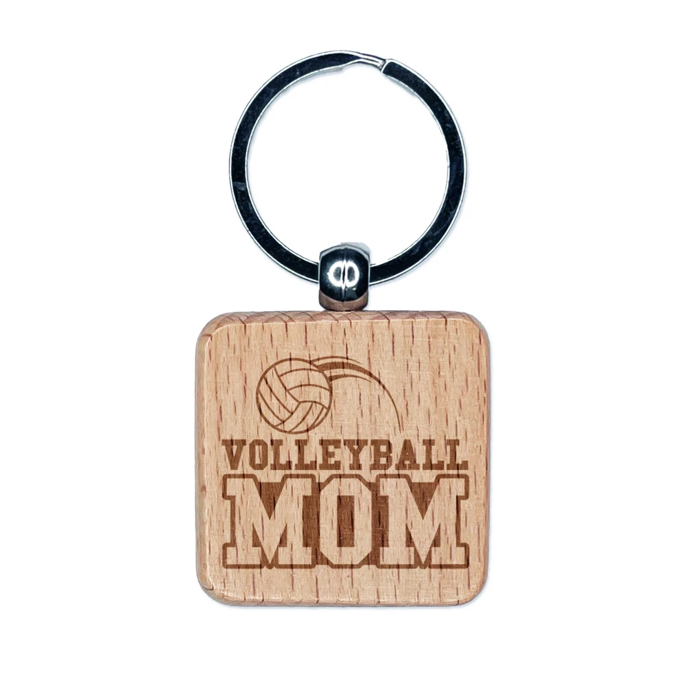 Volleyball Mom Text with Ball Engraved Wood Square Keychain Tag Charm