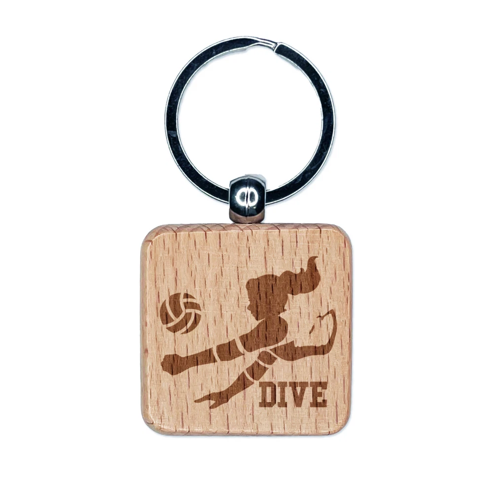 Volleyball Woman Dive Sports Move Engraved Wood Square Keychain Tag Charm