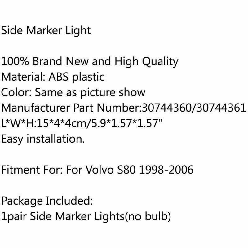 Side Marker Light 100% Brand New and High Quality Material: ABS plastic Color: Same as picture show Manufacturer Part Number:30744360/30744361 L*W*H:15*4*4cm/5.9*1.57*1.57" Easy installation. Fitment For: For Volvo S80 1998-2006 Package Included: 1pair Side Marker Lights(no bulb) -About US Founded in 2012, VIPJQ have professional development and sales, and are involved in various products, providing customers with various high-quality products. Since its establishment, VIPJQ has always adhered to the service concept of "customer first" and the management concept of "pursuit of quality", and is committed to providing customers with high-quality original designs. We commit to provide you the best innovative, quality products & professional services with competitive prices. We value every customer, and we look forward to providing solutions for your business needs to help your business achieve its goals, please contact us immediately! We are all about you! We are a Japanese seller,but with large warehouse in USA. We are profesional on Auto Parts,Car Parts,Motorcycle Parts,3C,other hot sale items and so on. We aim to provide to customers high quality product and best service. -About Shipment&Returns The item usually will be dispatched within 3 days after you ordered.All are free shipping. And it usually takes 3-10 working days to delivery depends on buyers' address or other majeure on the way. If you are not satisfied with the items and want to return the item,we hope you could message us first,we will give you the return details, we think we could give you the best service to save your time and money.Thank you. -About Feedback&Customer Service If you are enjoy your shopping here,not only enjoy the items but also the service,we are appreciate you could give us a 5-star feedback. If you are not satisfied with the item,before you give us the negative feedback,we hope we could give you the best solution through our commutication. We think we could do it if you give us the chance.Thank you.