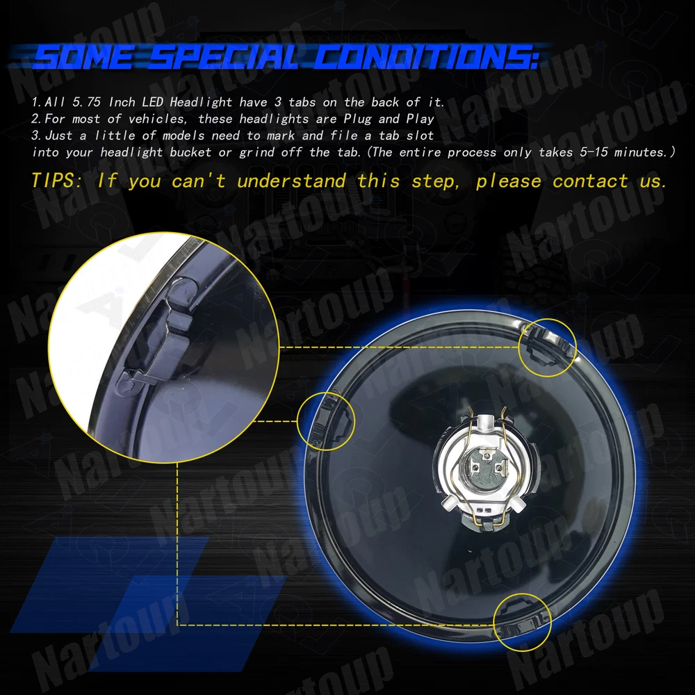 5-3/4"5.75 Round Stock Style H4 Conversion Headlights with Super Bright White LED Light Bulbs. Keep the Classic Look with Modern Light Brightness! Plug And Play! This listing is for a new set of 5 3/4" stock style glass lens - metal back headlight bulbs. This set includes (4) low/high beam headlights with high intensity LED light bulbs (no wiring or bucket modification needed). These have the original shaped prongs on the back so they will plug right into your original wiring harness plugs. These will fit any car or truck that has 4 round glass headlights. Will fit into stock buckets. Each bulb is 5 3/4 inches in diameter. These are glass and we will take extra care in packaging. DOT SAE approved Set Of 4 - 5-3/4" Stock Headlights w/ Led Bulbs Stock Style Glass Lens / Metal Backside 6000K High Intensity Led Bulbs (4) Low/High Beam Headlights Fits Directly Into Stock Buckets No Modifications Needed - Plug And Play Part Number Interchange: H5006 / H5001 Or 4000 / 5001 DOT / SAE Approved LED LIGHT BULB Specifications and Features: Bulb Size: 9003 / H4 / HB2 Application: Headlight High Beam And Low Beam LED replacement bulbs are engineered for superior performance, exceptional looks, and increased safety. 3570 CSP LED chip high power 100W per bulb Color Temperature: 6000K White Lumens: 6000 lumens per bulb,no blind zone Working Voltage: DC 9-32V ( Fit 12V,24V Vehicle ) No delay to light up, Faster on/off response time Lifespan: 50,000 working hours, stable quality, long service life Aluminum heat sink design,built-in automotive circuit to prevent electronic interference. The model is the same as factory light, no need to change car wire rute,just Plug and Play, NO modification required Energy saving, environmental protection, Stable performance, through strict test, Use safer driving in the car High quality Aluminum heat sink ensures proper temperature regulation. Lower Power Consumption than bulb. Vibration proof design. 50,000 Hour Lifespan Easy installation, Plug and Play, No modification required Material: ABS Housing, PC Lens Uses 55% less power than or HID bulbs 2 times brighter than stock bulbs OBC Error free operation Dramatically improves visibility at night Interchange: H5006 / H5001 or 4000 / 5001 Package Included: 4pcs 5-3/4" headlight Housing 4pcs H4 led Bulbs 4X H4/9003 to H13/9008 Connectors Cable Adapters Harness Note: Without mounting bracket, some models may need mounting bracket! After service Notification: If you are satisfied with our product and service please leave us a positive feedback,if there is any problem when you received the package,please feel free to contact us,we will be definitely give you a satisfying solution,when you choose the return reason .please choose the reason"i don't like it". by this option we will accept your return immediately and provide return label for full refund. the others reason to return will take both of us many troubles to handle. If you have any questions, please feel free to contact us, we are happy to answer them for you. Hope you will have a good shopping experience~