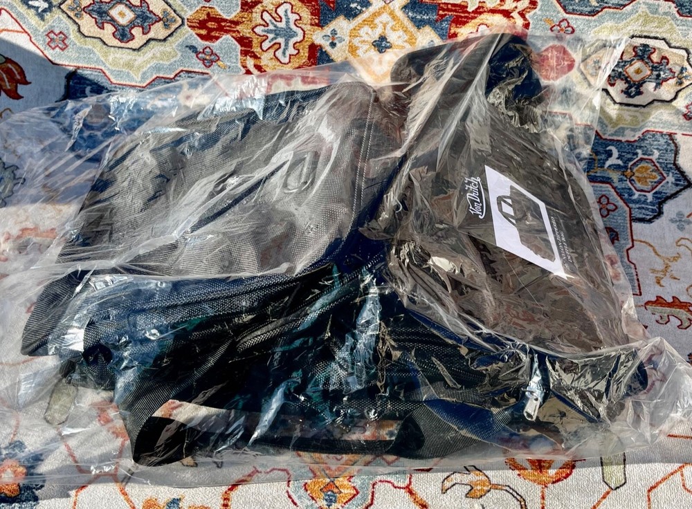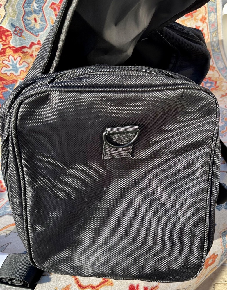 This is a Von Dutch duffle bag in black color made of nylon material. It has a zipper closure and measures 20" long, 10" tall, 9" deep. The bag features an adjustable Shoulder Strap and 2 padded handles. There are an additional 2 side zipper compartments. It is brand new with tags.