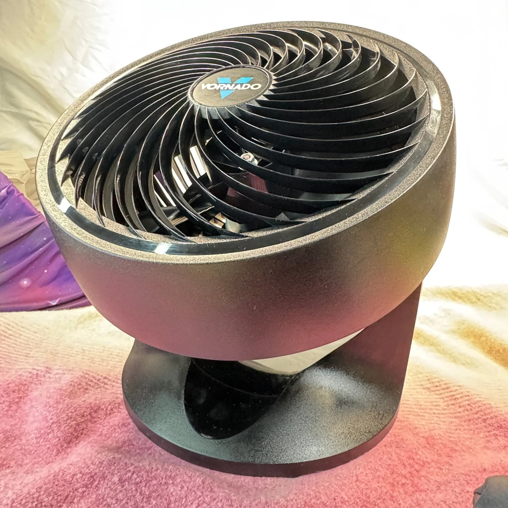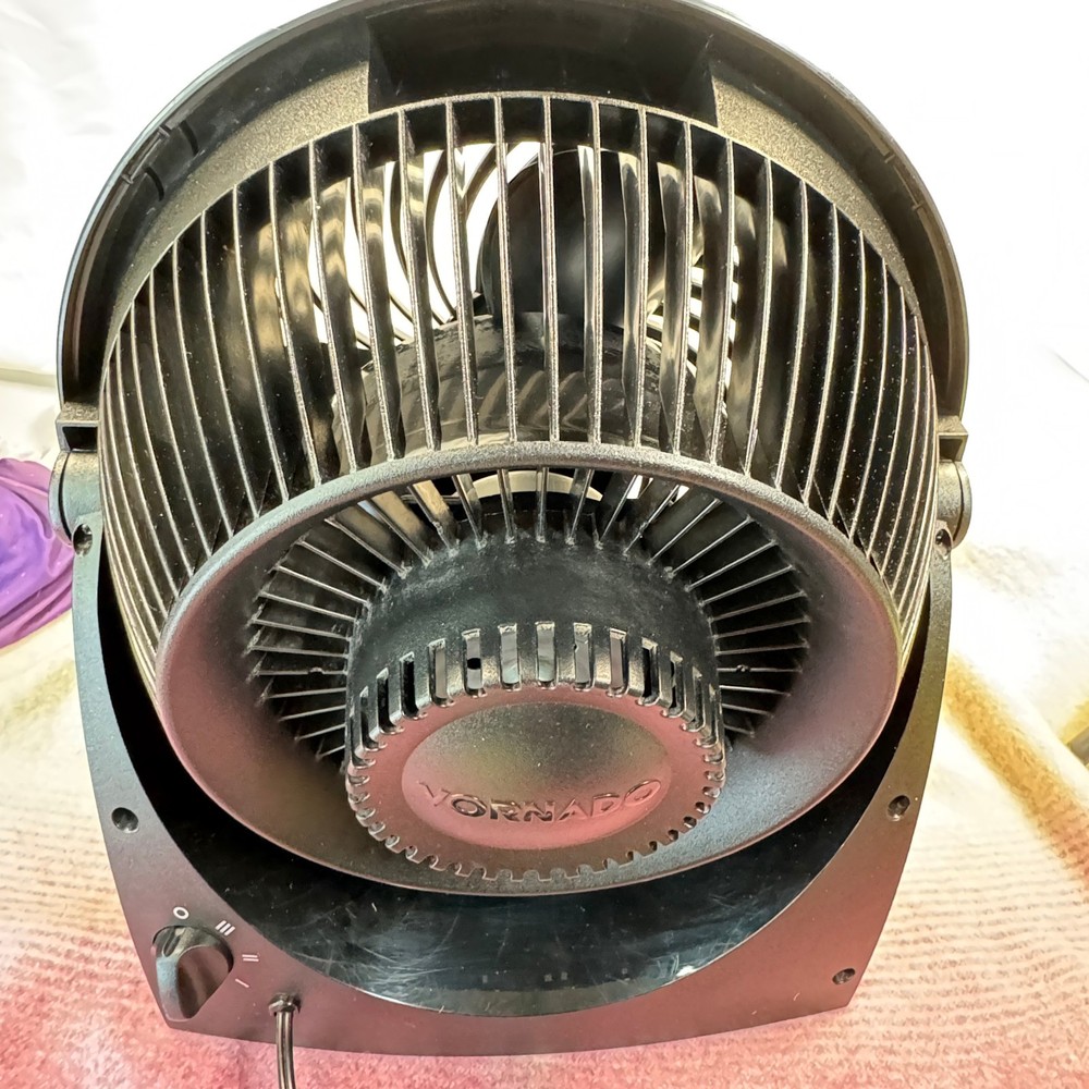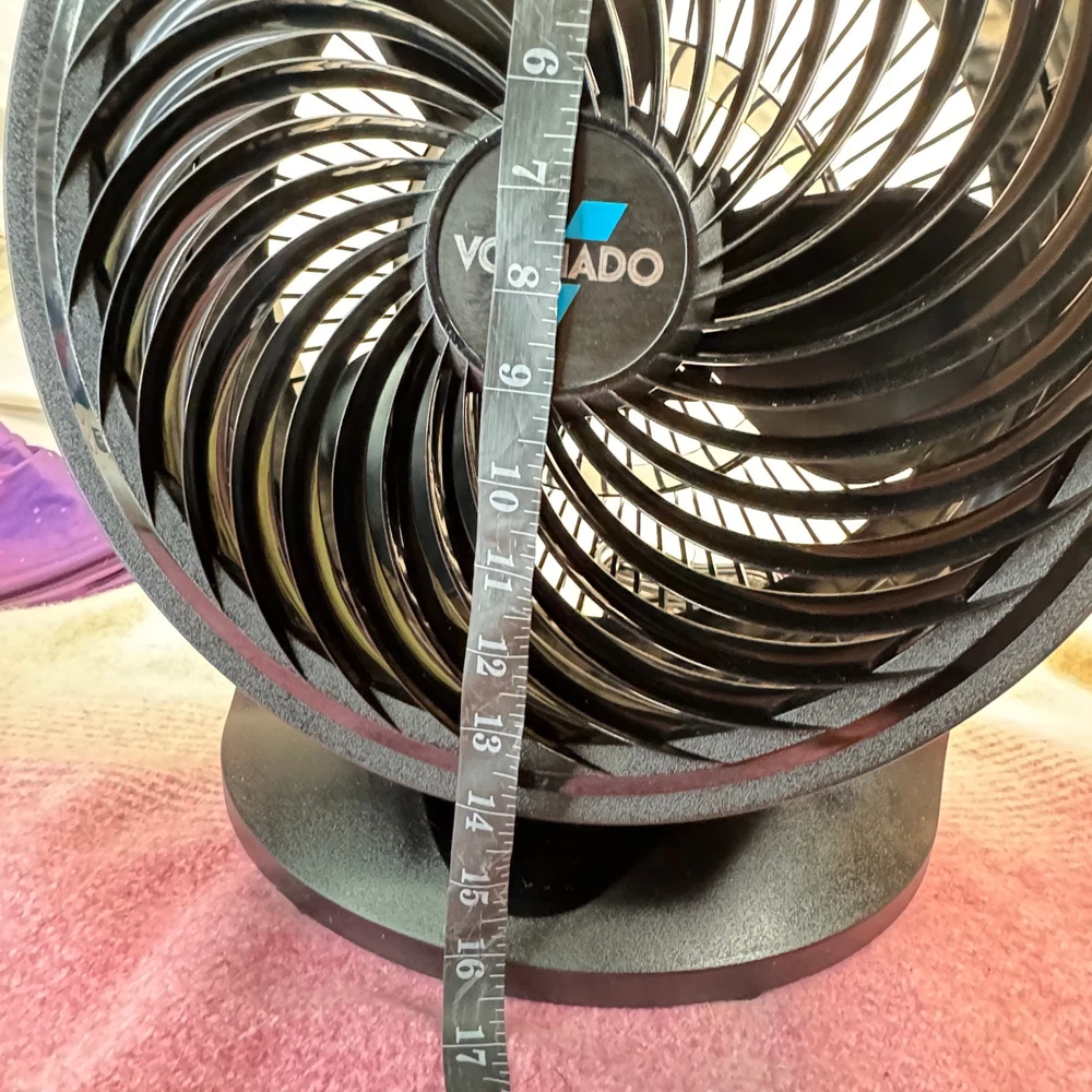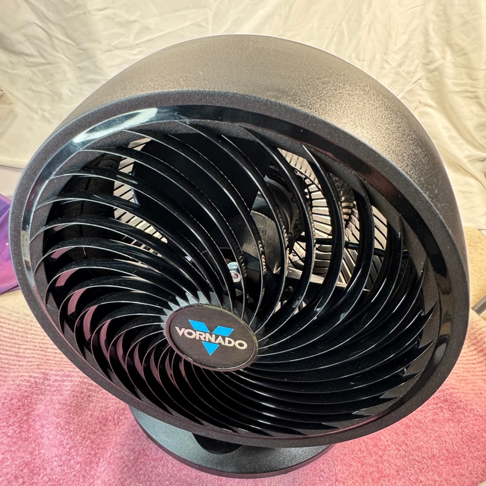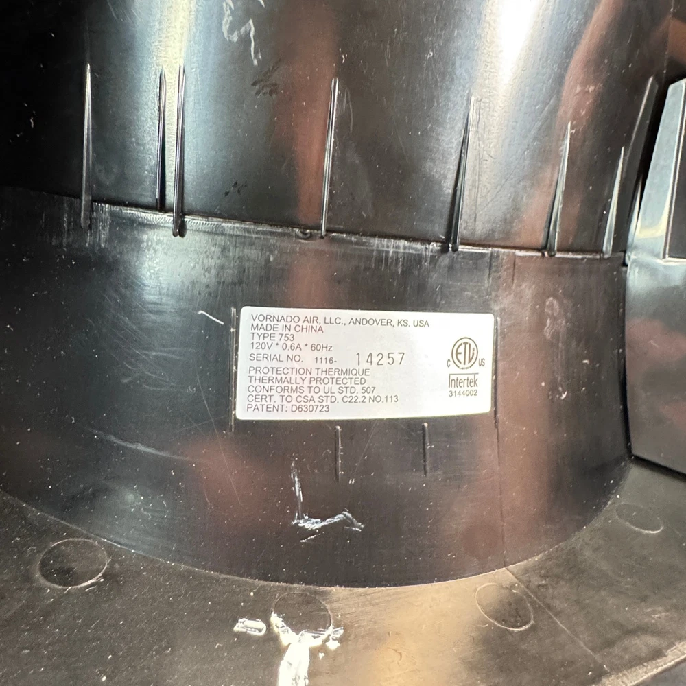 Model 753 full-size Vornado whole-room air circulator Deep-pitched blades & Vortex design move air up to ~100 ft 3-speed rotary control; adjustable tilt base for aiming airflow Built-in carry handle; easy-clean removable grill Approx overall diameter ~14–15" (see photos with tape) Includes fan only (no box/manual). Photos are of the exact unit.