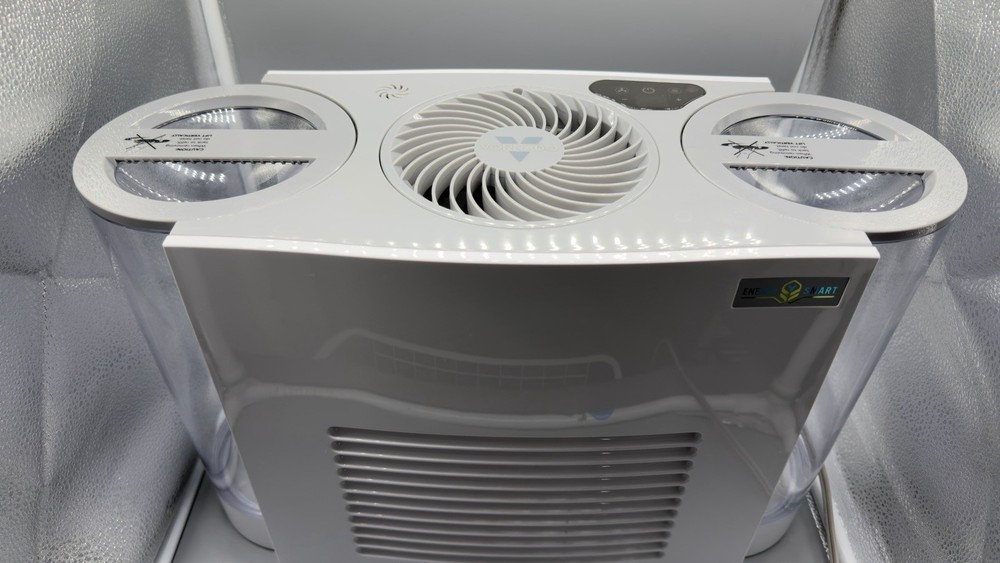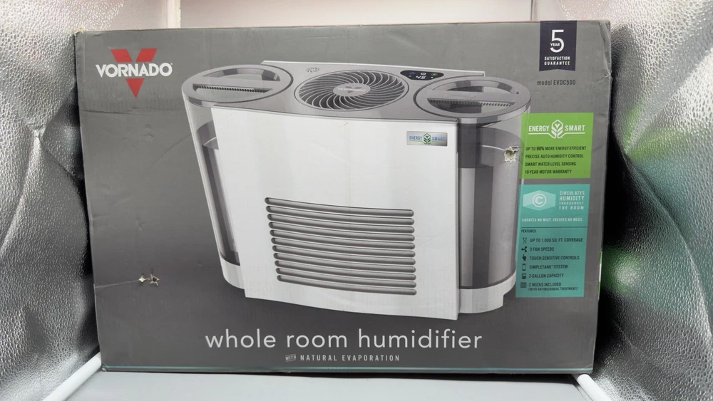 Improve indoor comfort with the Vornado Energy Smart EVDC500 Evaporative Humidifier, designed to deliver consistent, whole-room humidification with energy-efficient performance. Its evaporative system naturally regulates moisture output, helping prevent over-humidification. This unit is used, tested, and fully functional. Key Features: • Model: EVDC500 • Type: Evaporative humidifier • Water Capacity: 2-gallon tank • Coverage: Large room / whole-room humidification (manufacturer rated) • Energy Smart: Efficient operation with variable speed control • Auto Shut-Off: Automatically powers down when water runs out • Control: Easy-to-use electronic controls • Design: Vornado vortex air circulation for even humidity distribution Condition: • Used • Tested and working properly • Normal cosmetic wear from prior use (see photos) • Clean and ready for use