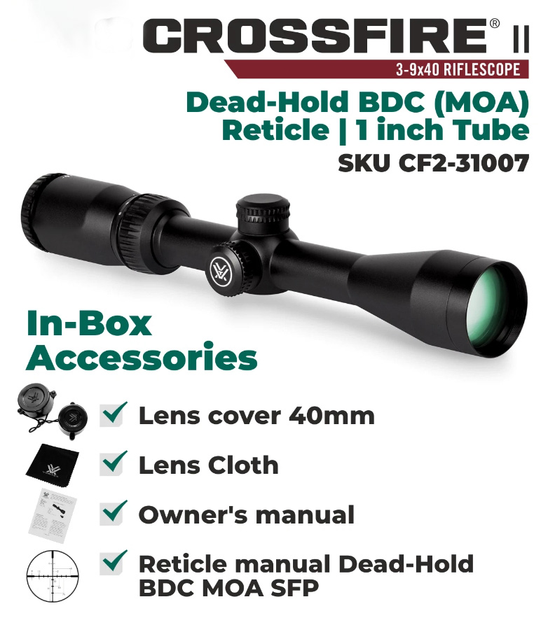 Brand New Vortex Crossfire II 3-9x40 Dead-Hold BDC 1" Riflescope - CF2-31007 The Vortex Crossfire II 3-9x40 Riflescope offers a great magnification range and large objective lens ideas for hunters, all at an affordable price point. Packed with features, your Crossfire scope has fully multicoated optics for bright, clear images, and a fast focus eyepiece to get you on target quickly. Long eye relief makes for comfortable viewing, even when wearing glasses. Designed to withstand the great outdoors, your Vortex Crossfire II scope has a strong, durable single piece aluminum tube that's waterproof and fog proof. Features SPECIFICATION Magnification 3x-9x Objective Lens Diameter, mm 40 Field of View (FOV) @ 100yds, ft 34.1-12.6 Eye Relief, in 3.8" Tube Size, in 1" Turret Style Capped Adjustment Graduation, MOA 1/4 Travel per Rotation, MOA 15 Max Elevation Adjustment, MOA 60 Max Windage Adjustment, MOA 60 Parallax Setting, yds 100 Reticle Dead-Hold BDC Length, in 12" Weight, oz 15