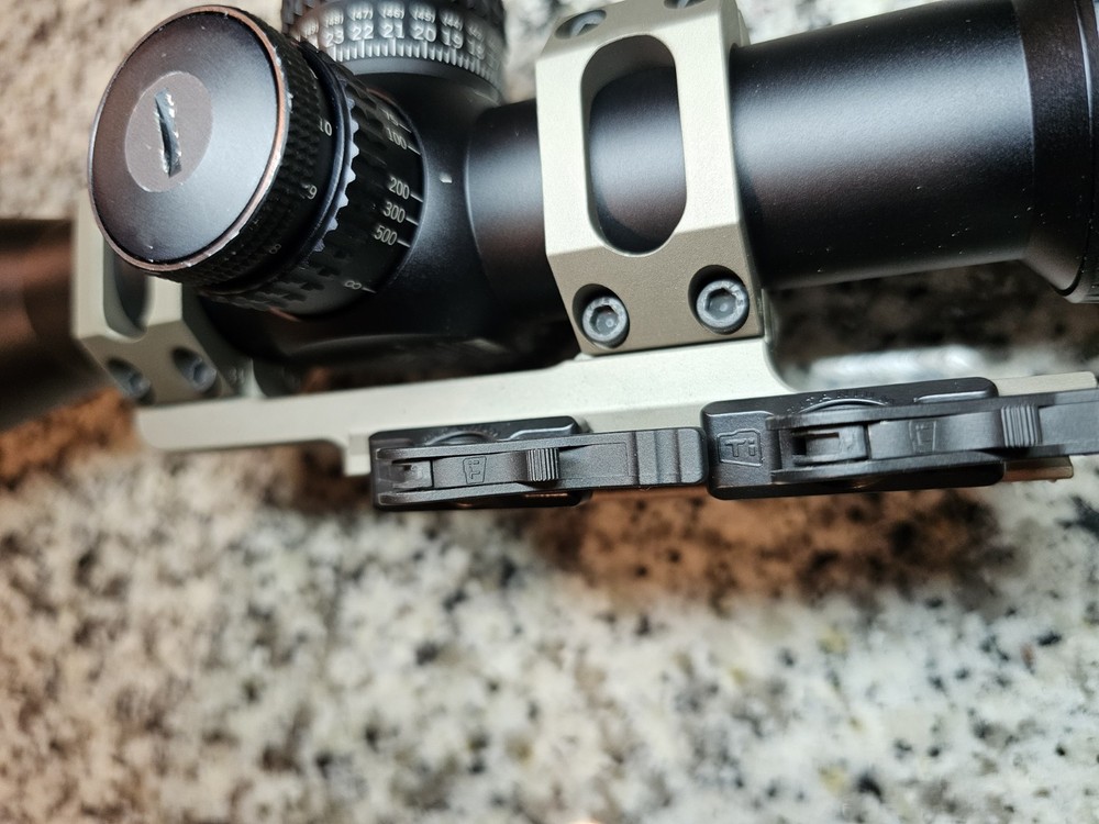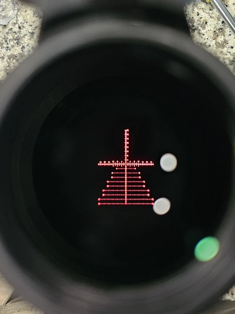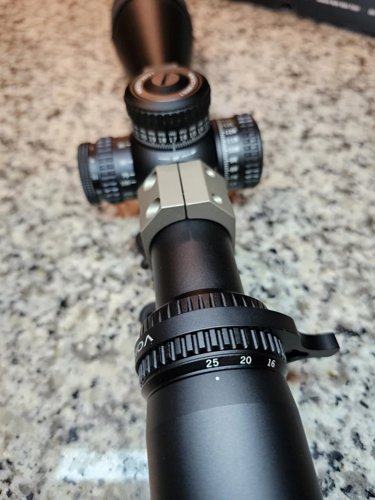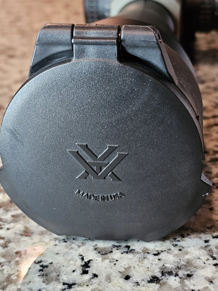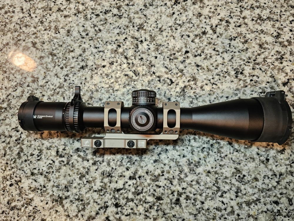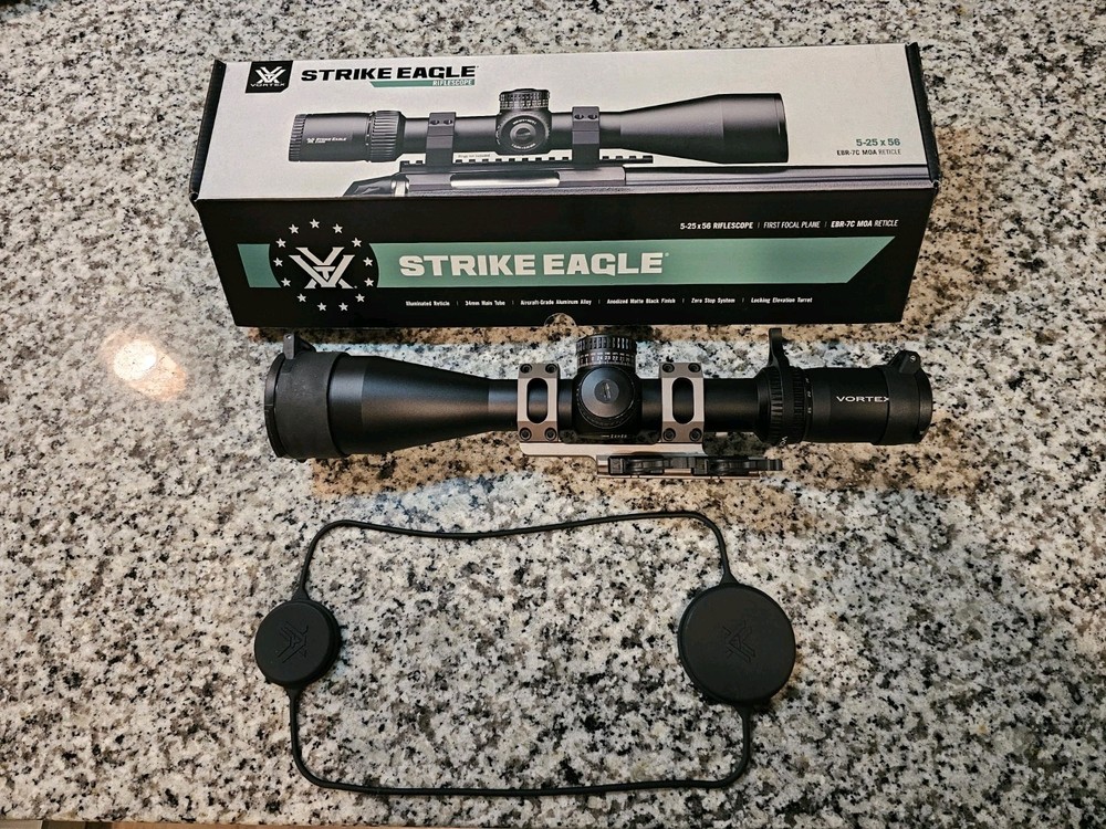 This Vortex strike eagle 5-25x is one of the best scopes for the money I've ever used. I replaced it with a Vortex Razor 6-36x because I wanted to take my rifle further and I didn't realize the performance difference would be so small despite the large price difference. Regardless, it has been sitting in its box every since. It's not cosmetically perfect, with a few scratches on the turret caps, but the scope has seen well under 200 rounds of 6.5 creedmoore on a semi auto rifle. Comes with my favorite scope mount from ADM (tan anodize) that has titanium constructed QD levers. I have 2 of these mounts and they both return to zero perfectly when removing and reattaching the scope. It also comes with both flip up lense covers and a rubber cover in the original box. The ocular lense is sporting a swamp fox cover because it fit tighter than what it came with, but a vortex cover remains on the objective lense. The optic has 1/4 MOA adjustment locking turrets, 11 illumination settings, parallax adjustment, and a removable throw lever. I just put a brand new battery in it same day this is posted. The reticle is a "Christmas tree" design with windage and elevation holds as shown in picture.