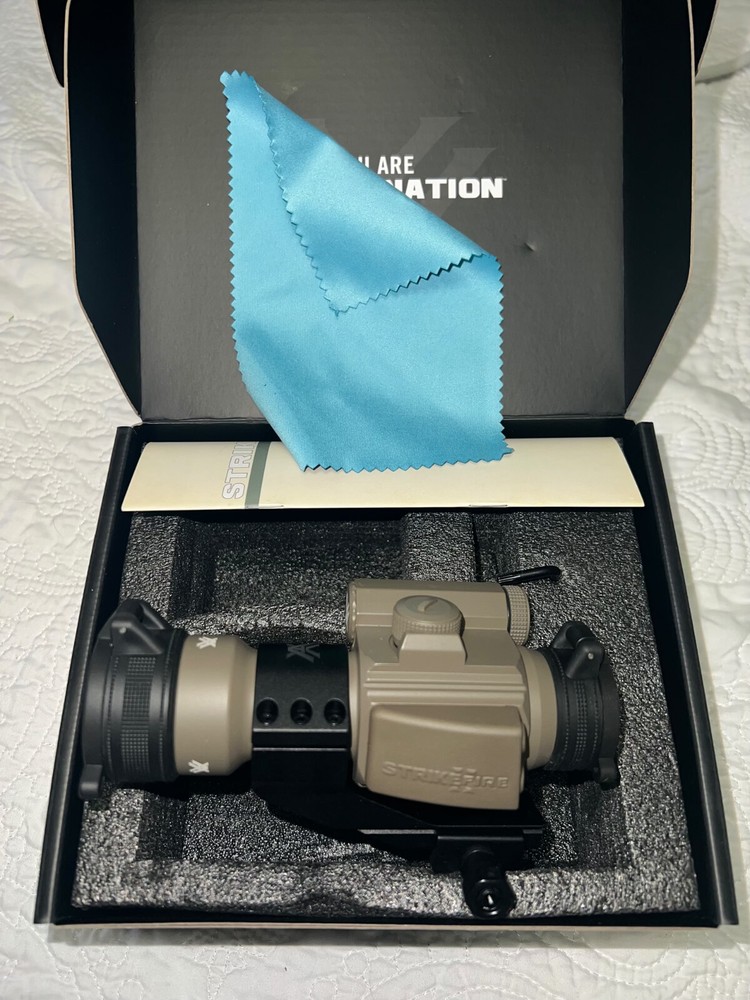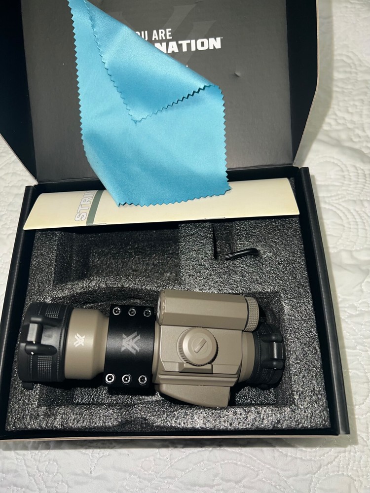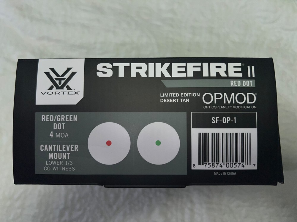 mounted for display but never used to fire live ammo also just so everyone knows the photos of the red and green dot is not what it really looks like the dot is smaller and less blurry it was just to show you have the option of both colors and this has a lifetime warranty Package Contents: Vortex StrikeFire II 1x30mm 4 MOA Red Dot Sight Cantilever ring mount T-15 Torx wrench CR2 battery Flip Cap optic covers Vortex VIP Warranty The Vortex VIP warranty is about you, not us. It's about taking care of you after the sale. VIP stands for a Very Important Promise to you, our customer. We will repair or replace your Vortex product in the event it becomes damaged or defective-at no charge to you. If we cannot repair your product, we will replace it with a product in perfect working order of equal or better physical condition. You see, it doesn't matter how it happened, whose fault it was, or where you purchased it. You can count on the VIP Warranty for all Vortex Optics Rifle Scopes, prism scopes, red dots, rangefinders, binoculars, spotting scopes, tripods, and monoculars. Unlimited Lifetime Warranty Fully transferable No warranty card to fill out No receipt needed to hang on to If you ever have a problem, no matter the cause, we promise to take care of you Note: The VIP Warranty does not cover loss, theft, deliberate damage or cosmetic damage that does not hinder the performance of the product.