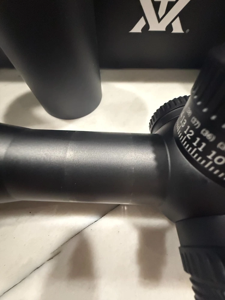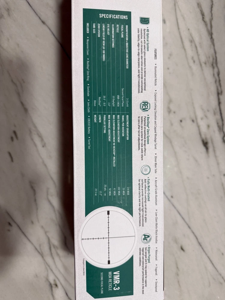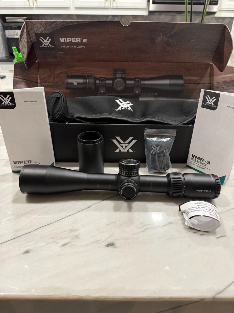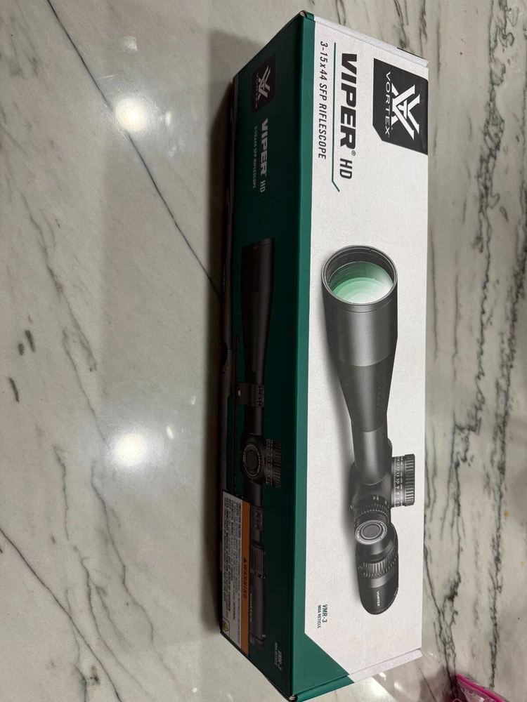 The Vortex Viper HD Riflescope 3-15x44 ILLUMANATED RETICLE. It features a VIPER model with a maximum magnification of 15x and a VMR-3 MOA reticle in the second focal plane (SFP). It is a high-quality riflescope from the Vortex brand, ideal for hunting and sporting activities. I had this mounted, shot 10 rounds and replaced with same scope in MRAD. Slight marks where mounting rings were located, but you will never notice once mounted on rifle (see photos).