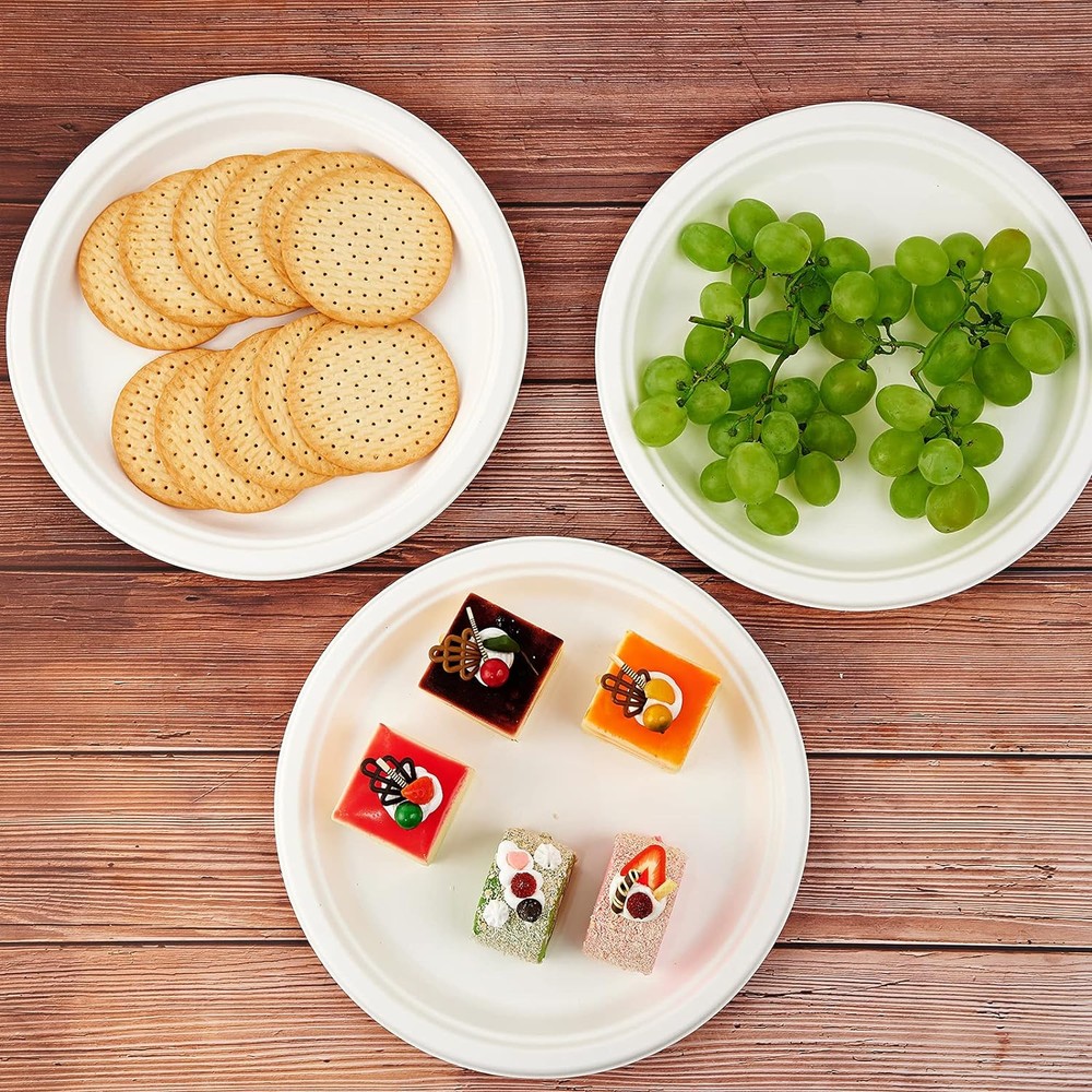Vplus 150 Pack Compostable Disposable 150 Count (Pack of 1), White Plates Product Details Material: Paper Brand: Vplus Color: White Plates Special Feature: Disposable, Biodegradable, Sturdy, Microwave Safe Occasion: Housewarming, Thanksgiving, All Occasions Style: 10 IN Round Plates Shape: Round Seasons: All Seasons Product Dimensions: 10.25"L x 10.25"W x 1"Th Recommended Uses For Product: Pasta, Chicken Number of Pieces: 150 Pattern: Solid Product Care Instructions: Hand Wash Only Size: 150 Count (Pack of 1) Finish Type: [IN] Smooth Item Weight: 1 Pounds Is Microwaveable: Yes Net Content Weight: 1 Pounds Material Feature: compostable, biodegradable, food-safe, plant-based Is Dishwasher Safe: No Product Name: Dinner Plate Reusability: Single-Use Pattern: Round Manufacturer: Vplus Unit Count: 150.0 Count Item Weight: 1 pounds Item model number: VP-GZJP Good For Environment: Made from sustainably sourced sugarcane fibers, these paper plates are 100% biodegradable and suitable for composting for easy disposal,making these plates good for the environment Heavy-Duty Plates:With no plastic or wax lining it's designed with superior strength and is cut-resistant and leak-resistant.Plus, they're also microwave and freezer safe 100% Bagasse Sugarcane Fiber: By reusing the natural fibers of Sugarcane, this material is 100% Sustainable and Renewable for the environment Host Parties With Ease:With its premium quality, this dinnerware is ideal for Family events, Schools, Restaurants, Office lunches, BBQs, Picnics, Outdoor, Birthday parties, Weddings, and more WELCOME TO Vplus We have been focusing on tableware research for a long time and are committed to providing you with better tableware to facilitate your life. In our shop, there is always tableware that can perfectly meet your needs.