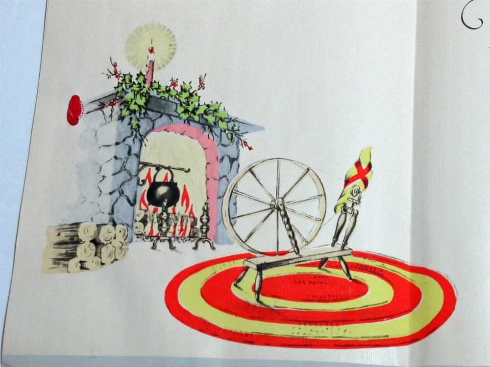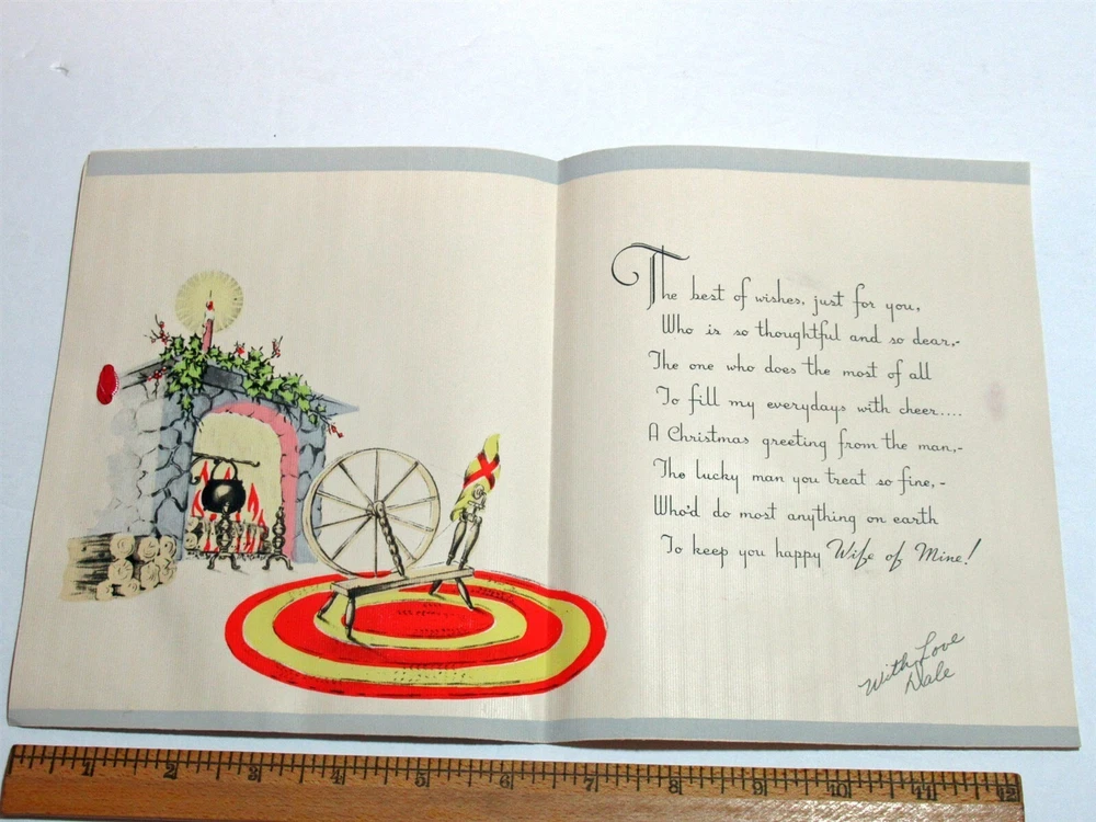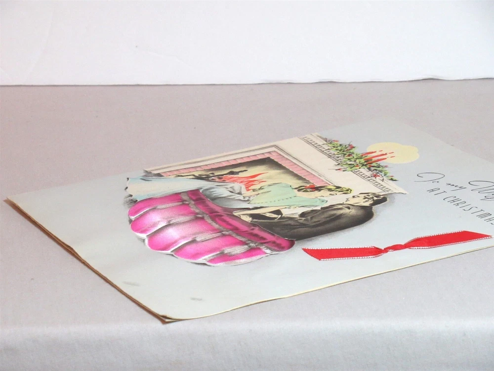 Vtg 1940s 8" Christmas Card husband & wife sitting on pink satin pillow ottoman Here is a vintage 1940s "To my Wife At Christmas" greeting card with lovely design that pictures a husband and wife sitting on a pink tasseled ottoman (printed on satin pillow / pad) in front of the fireplace A real red ribbon bow is tied through the card. Inside has a fireplace and spinning wheel scene. Used, signed inside condition. No envelope. I have placed a ruler in some pictures for size reference. Large size approx. 8" tall. Folder card that opens from the side. Marked on the lower back "Made In U.S.A." This card is in good condition with light wear and aging overall. Light creases and tip rubs. There are 2 small gray smudges on the lower front and some smudges on the back. No musty or smoke odor. Store inventory number 10329. Click here to enter our Store We only sell Internationally using the Ebay Global Shipping Program. Please email with questions. Use the "Pay Now" feature to pay for your item or wait for an invoice. Shipping includes tracking. We strive for 5 Star Service. If I have overlooked something or made a mistake, please email me as soon as the item arrives. We ship promptly within 1 business day. Our home is smoke free, but we do have pets. Powered by SixBit's eCommerce Solution