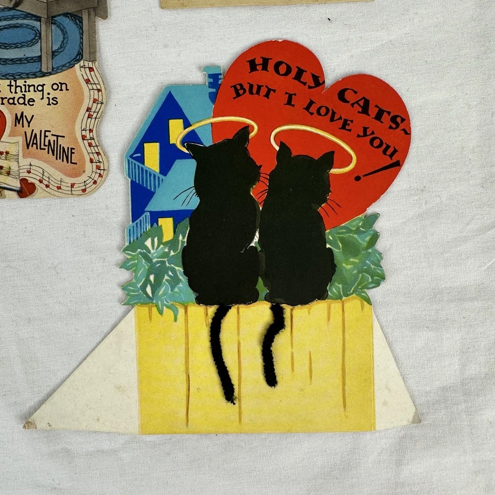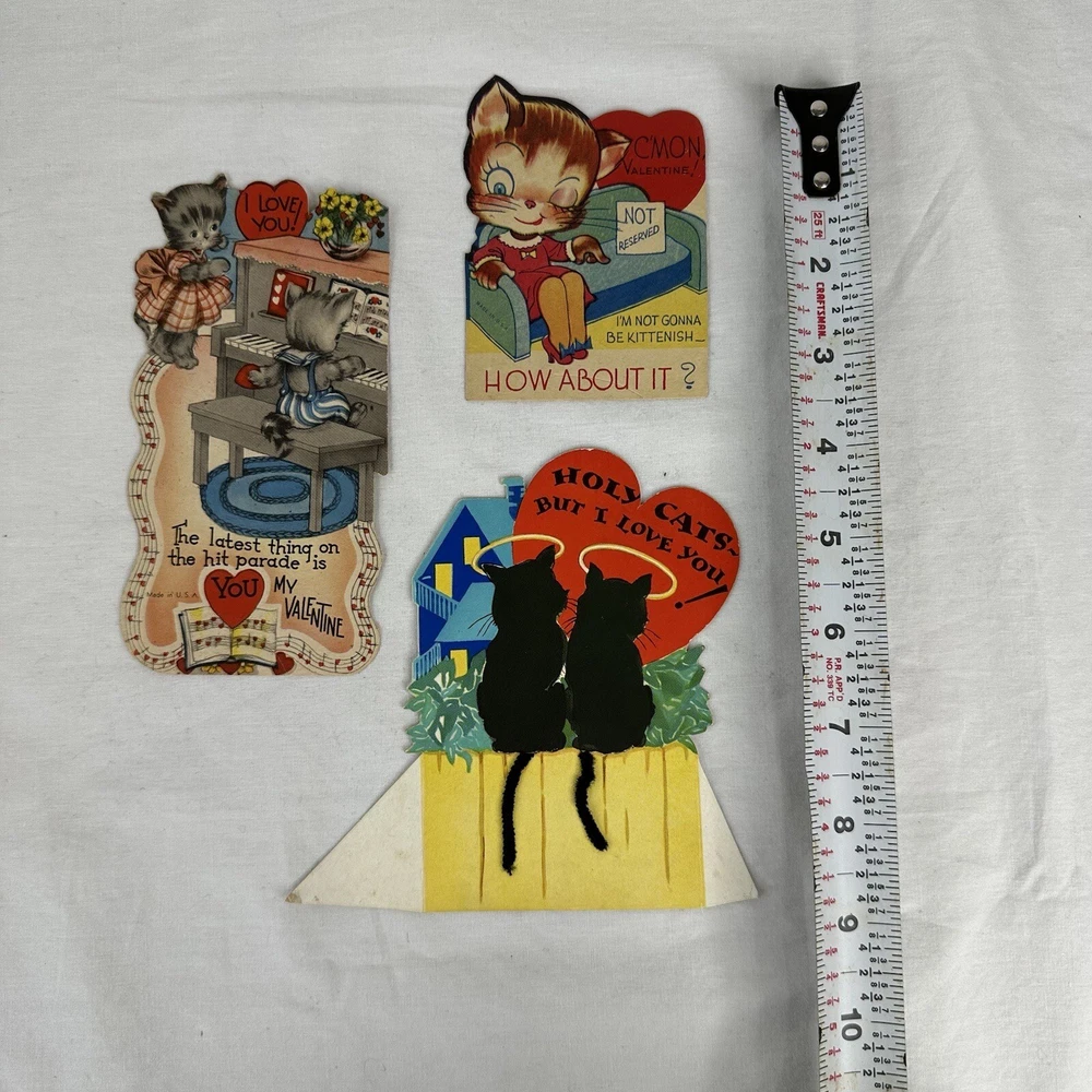 Vtg 1940s Valentine Cards Lot (3) WWII Era Cars Kittens Kittie Kittenish Die Cut These cards have wear and have been written on. See photos for wear and inscriptions. WWII era.