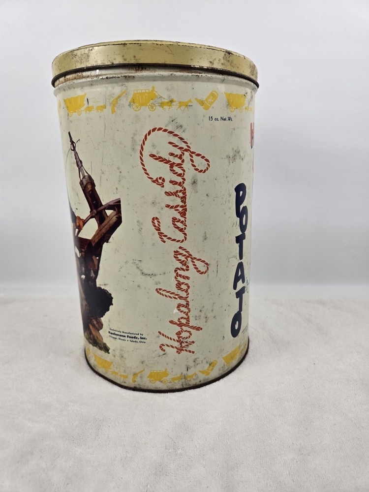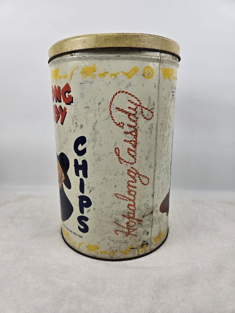 A vintage Hopalong Cassidy potato chip tin . The tin features an image of actor William Boyd as the cowboy hero Hopalong Cassidy, alongside his horse Topper. These tins were produced around the 1950s, a period when Hopalong Cassidy merchandise was highly popular. They were manufactured by companies like Kuehmann Foods in Chicago and Toledo. This tin is pre-owned so please see all the pictures for your consideration. All pictures are considered as part of the description as well. If you should have further questions or concerns please ask Thank you