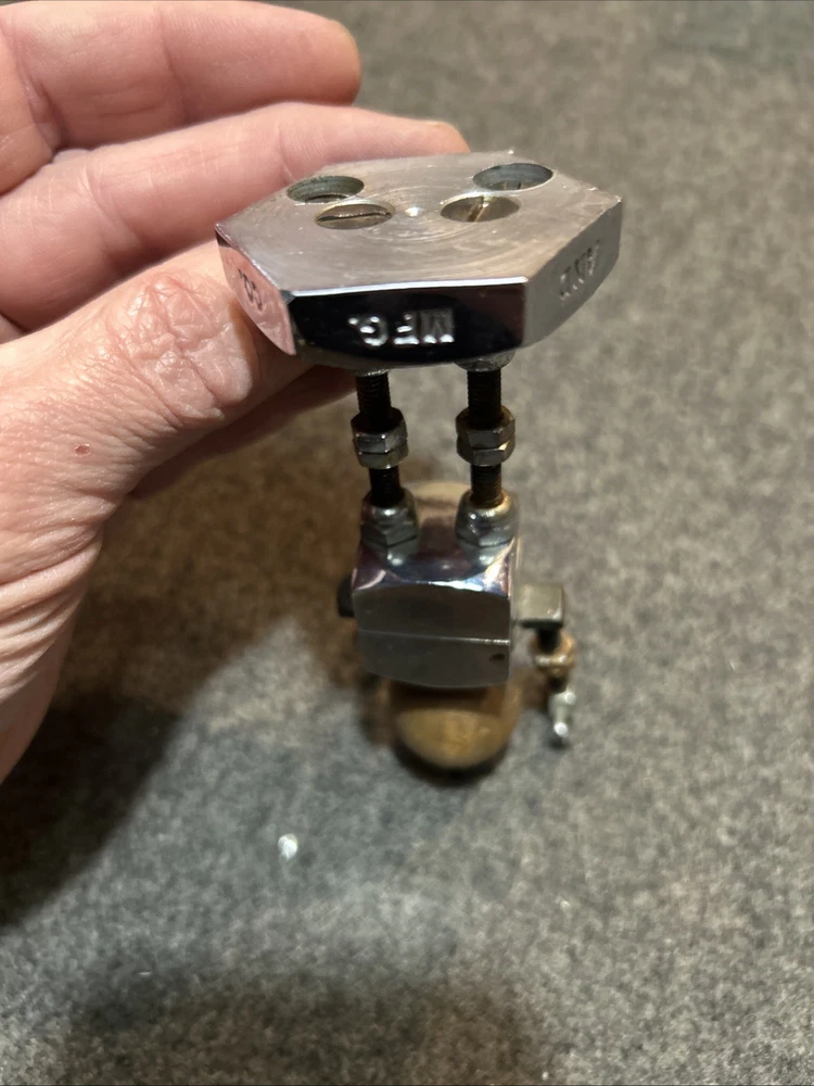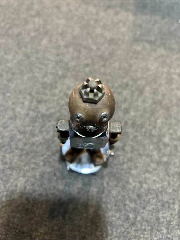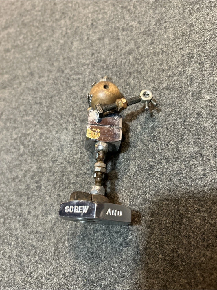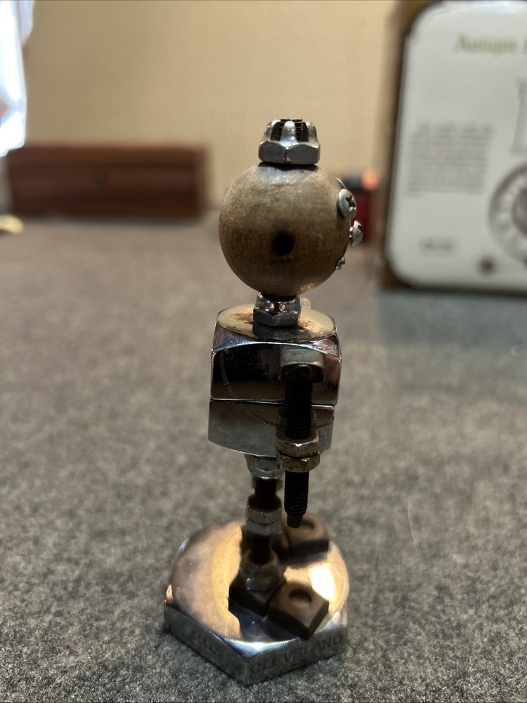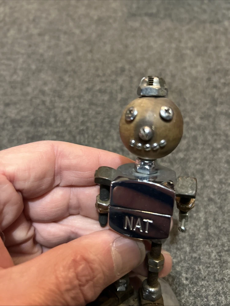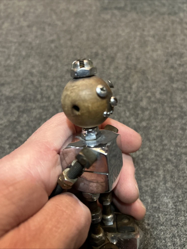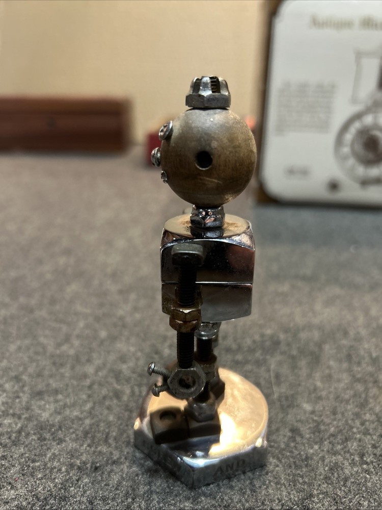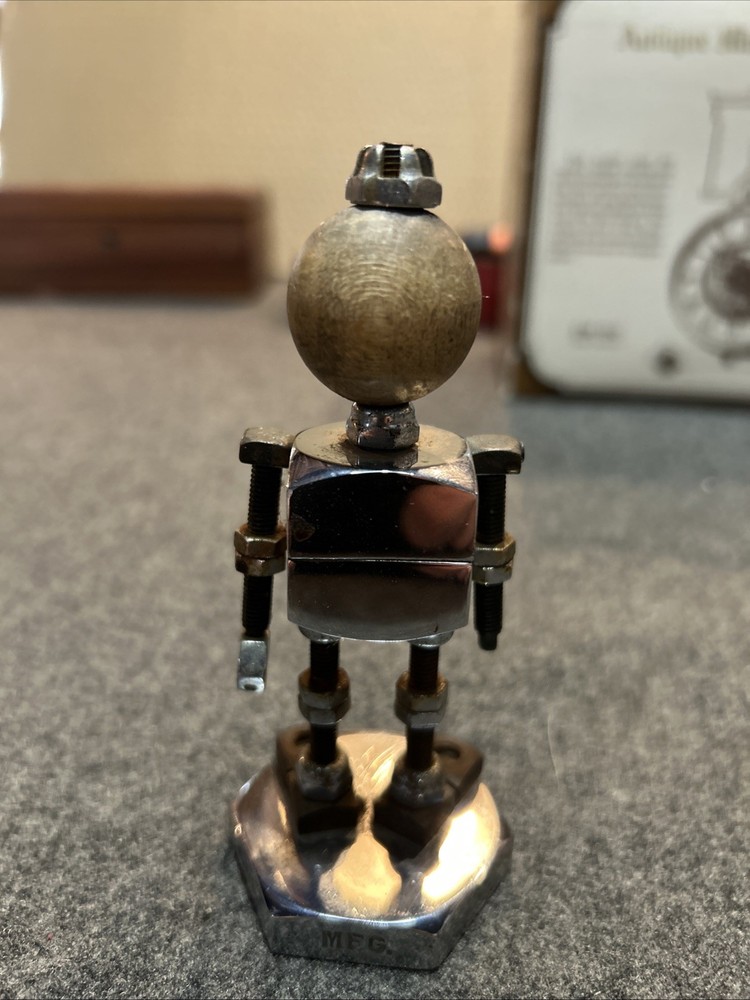 Great looking folk art advertising robot. Missing right hand, some fingers on left and wing nut ears. Little dusty between feet need a lil q-tip action with denatured alcohol. Light surface rust on chrome or nickel plate body transferred from hands at side. I recommend #0000 fine steel wool. I really wanted to dive in and tap a new hand and replace ears, but then I thought I’d be taking that enjoyment away from the new owner. Please send me a pic if you decide to do some work to him or even if you just decide to keep him as is. Next day shipping.