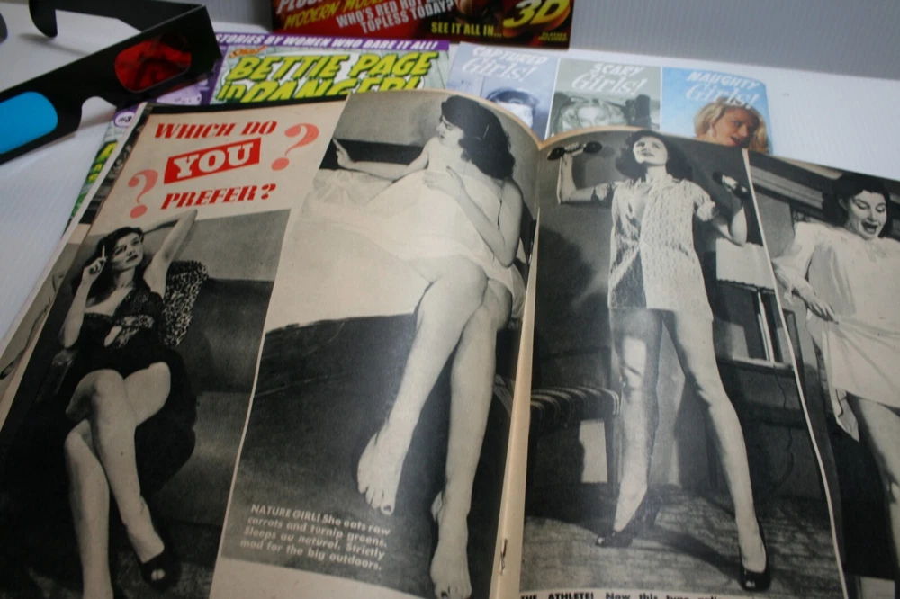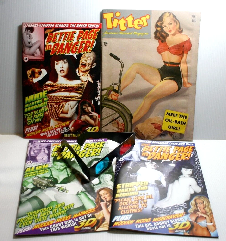 This vintage magazine titled "Titter" is a rare find for collectors of women's interest and men's entertainment. Its publication month was in February of 1951 and it is an English language monthly magazine. The magazine lot also features a photo comic book lot and Bettie Page, the famous pin-up model, graces its pages. The publication was made in the United States and is considered a 1st edition. It is a must-have for anyone interested in vintage magazines and books. It has a 3D photo spread in the back of each issue that is pretty cool. This item is perfect for collectors or those looking for a unique addition to their collection. Winning bidder gets all the books seen in the photos. Also, see our other auctions for more Bettie Page items and vintage pinup mags we are selling from a HUGE collection!