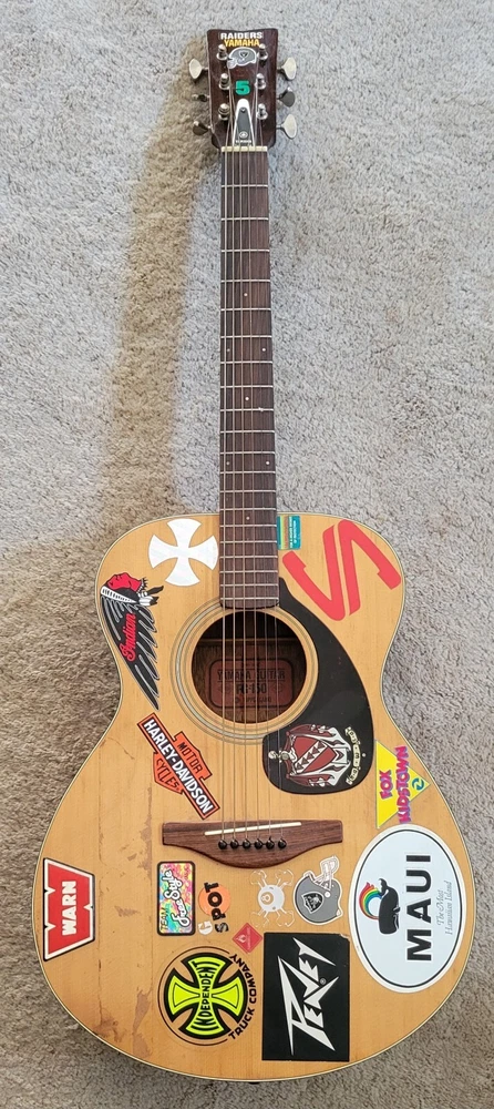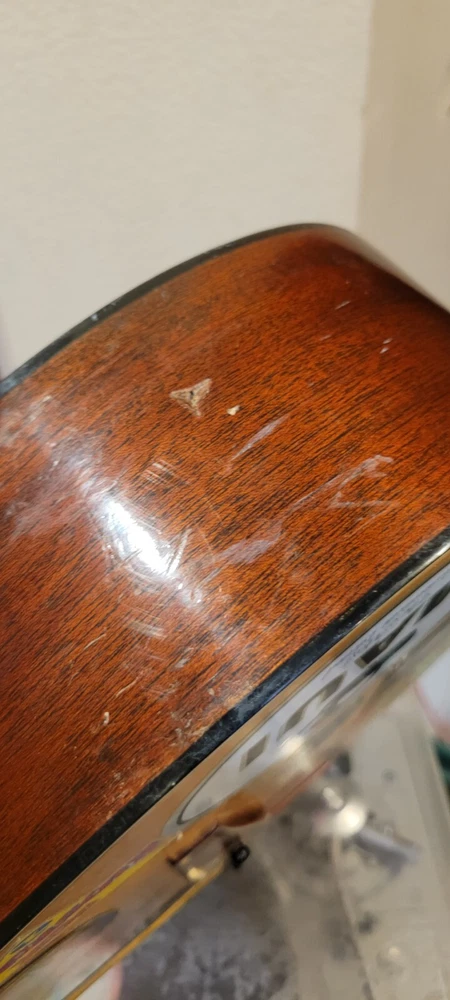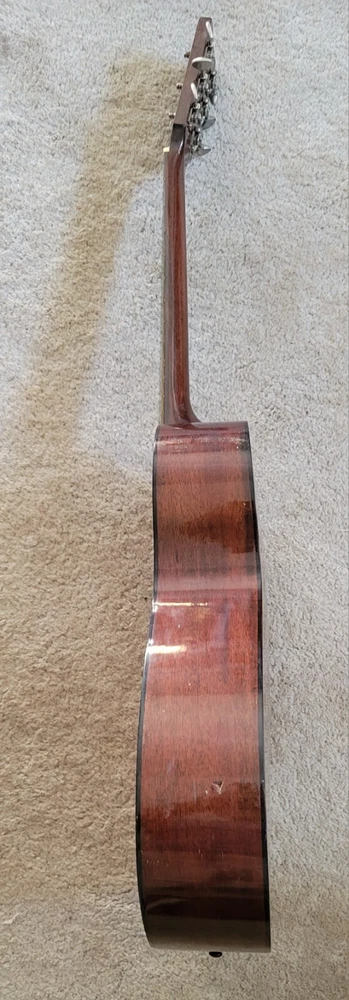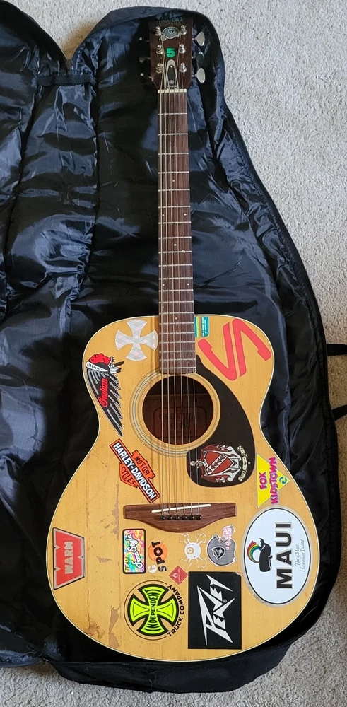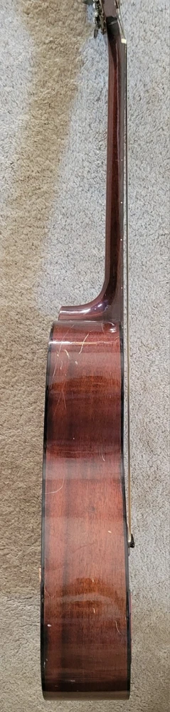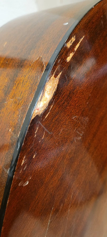 Came from estate of amateur musician. Told he bought it when in college, graduated 1970. As pics show someone later put stickers on it. Have not tried to remove, leave that to professional. And needs repair on back edge. Soft case included.