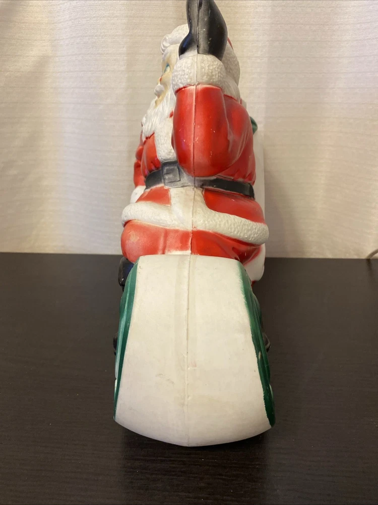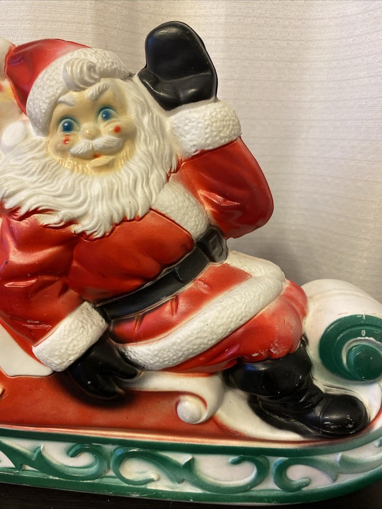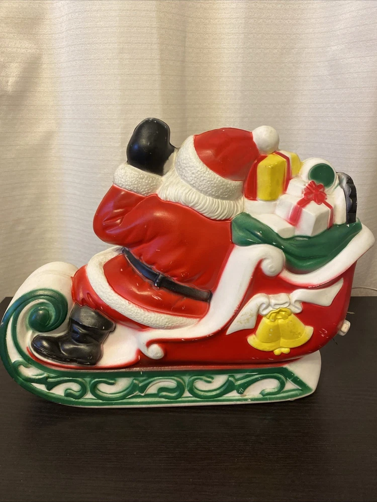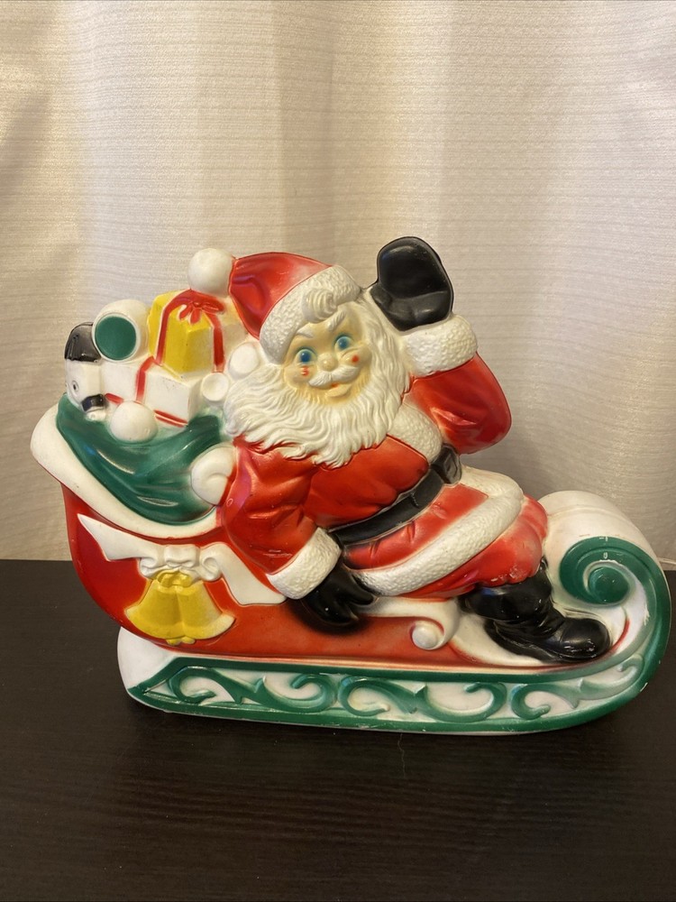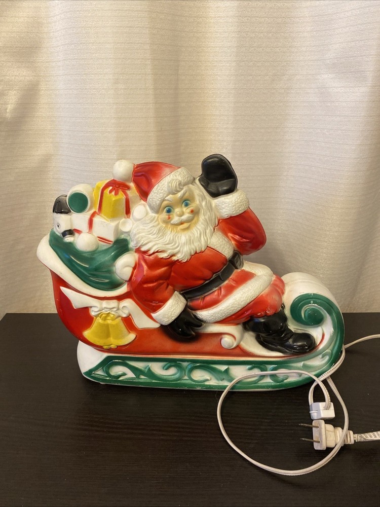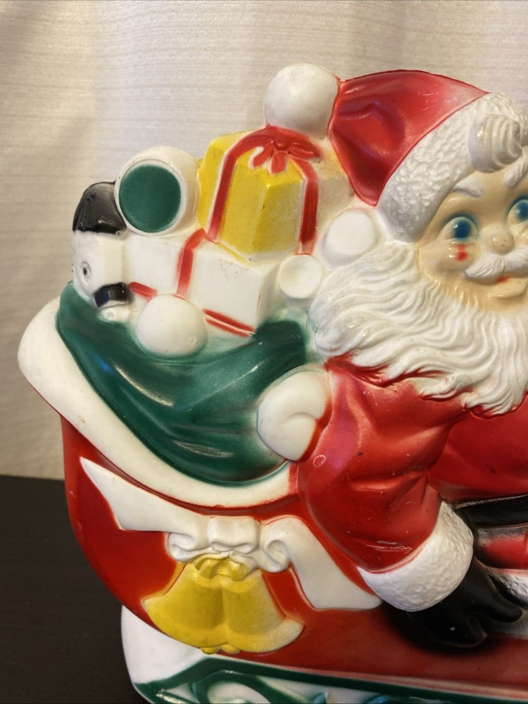 Vintage 1970 Empire Plastics Corp. Santa Claus in Sleigh Blow Mold. Cord included. Measures approximately 10" tall and 13" long. In good condition, some tiny areas of paint wear. Payment due in 3 days. No international shipping.