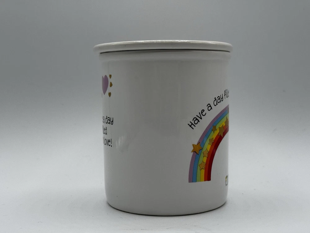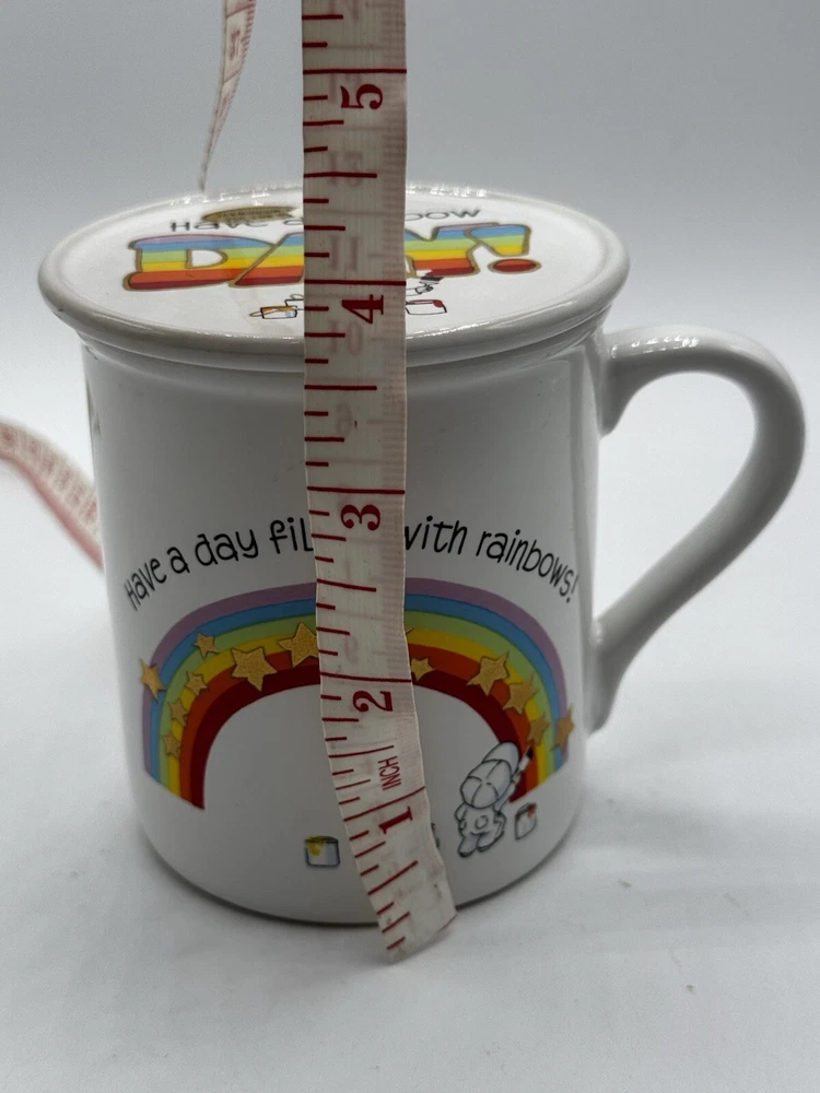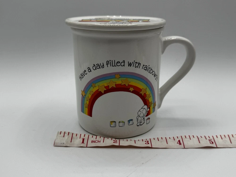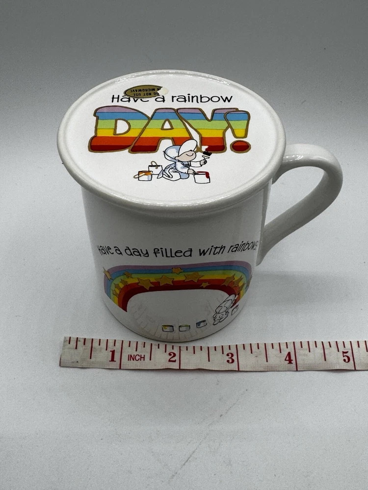 This vintage 1983 Hallmark Mug Mates coffee mug set is a must-have for any collector or fan of the 1980s. The colorful rainbow pattern and round shape of the mug make it perfect for hot or cold beverages, and the small size is great for teens or girls. The set includes a mug and lid/coaster, both made of porcelain with a painted design. The Mug Mates design features a handle and is an original piece from Japan. This mug set is perfect for all occasions and adds a touch of pride theme to your collection. Don't miss out on this rare find from the 1980s.