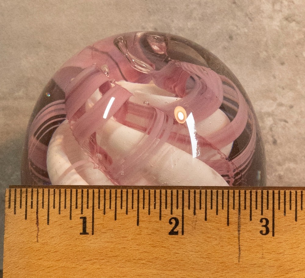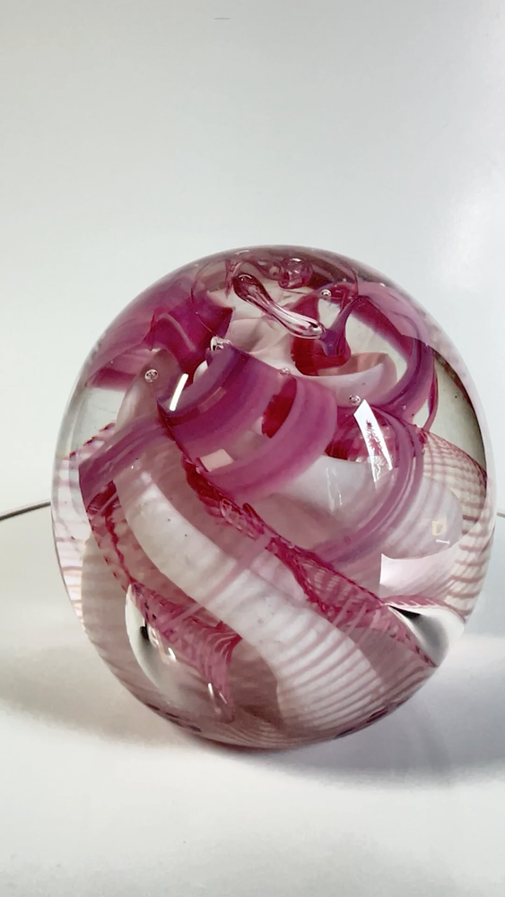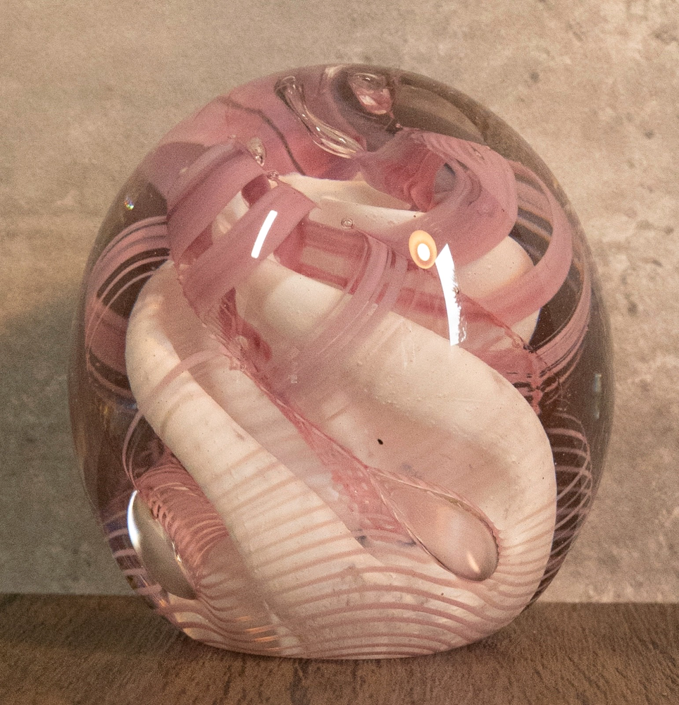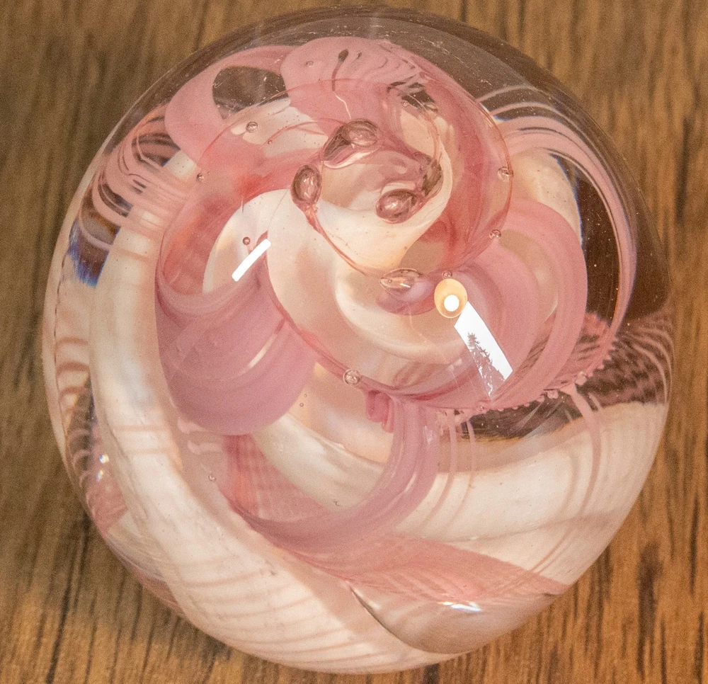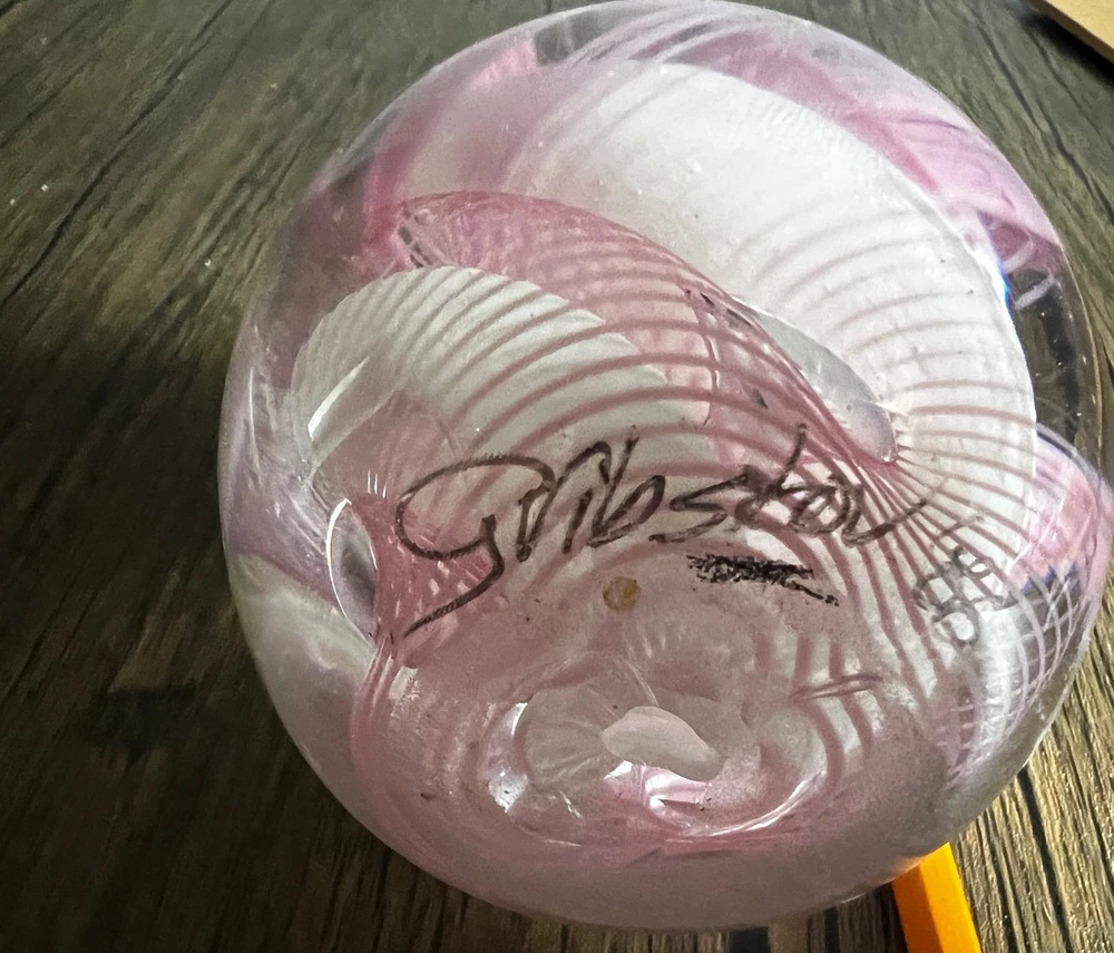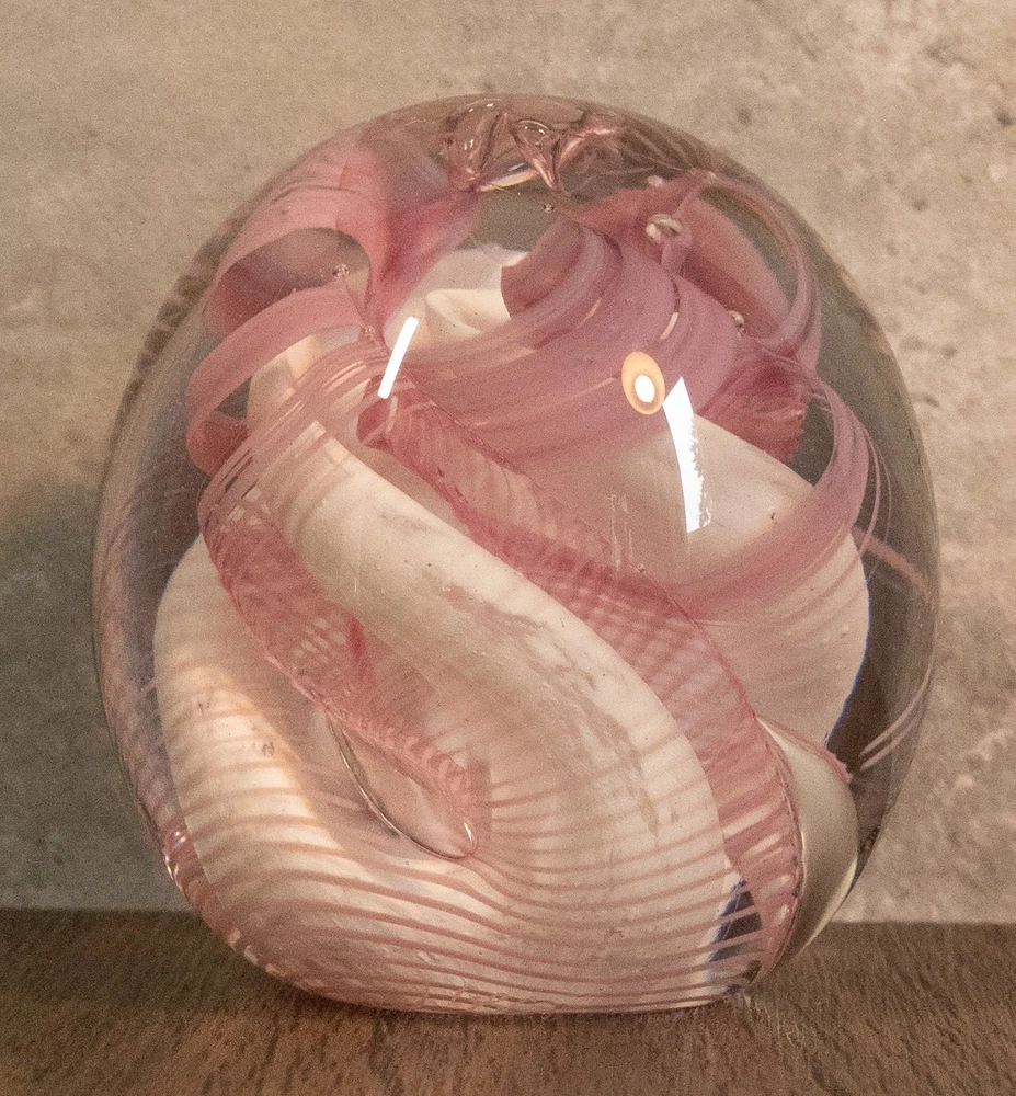 Vtg 1986 Gibson Glass Pink White Free Form Lace Controlled Bubble Paperweight Beautiful paperweight to ass to your collection or to start one . Looks like lace and controlled bubbles . Weight is in perfect condition . Please note the signature was filled with pencil so it could be read easier but has been cleaned off . I will pack with care and get it to you ASAP Thanks for looking !