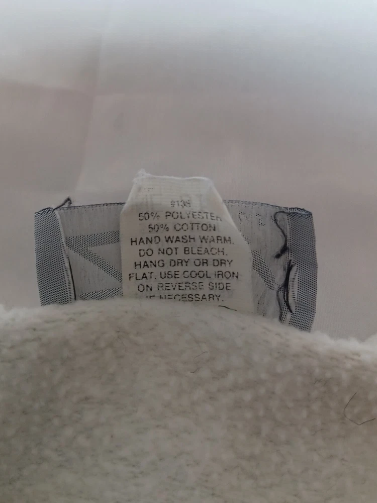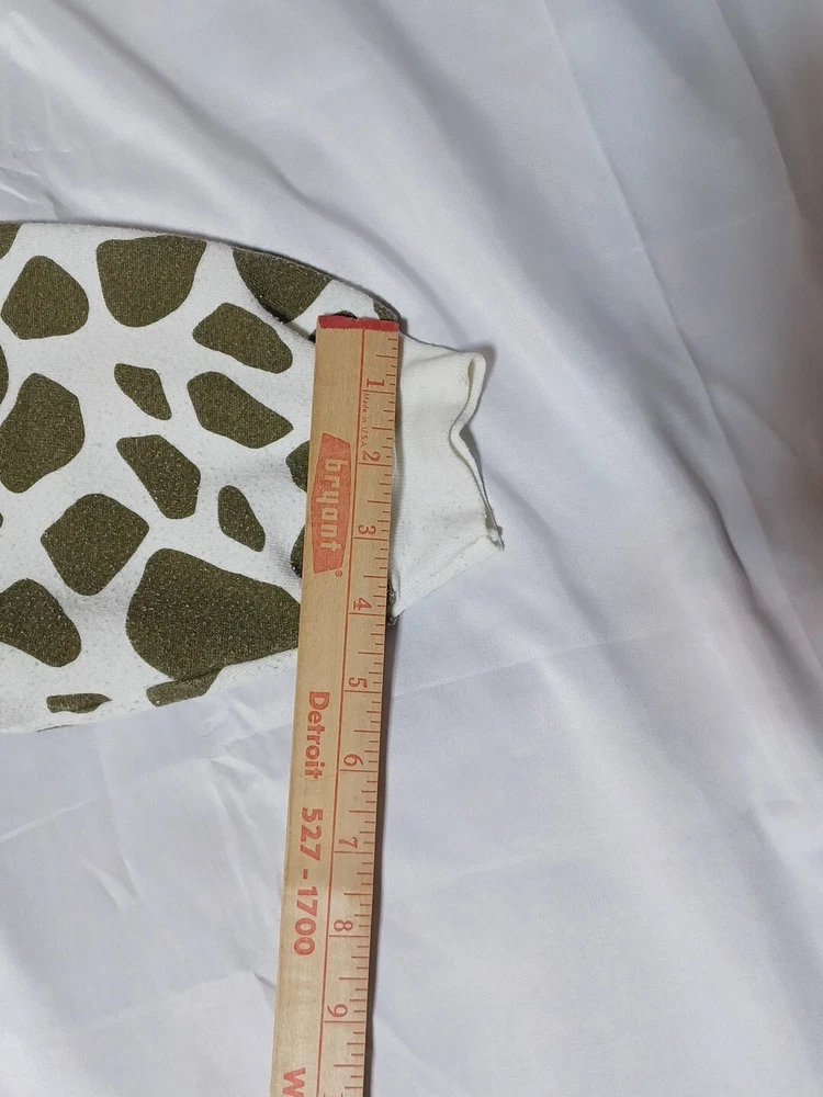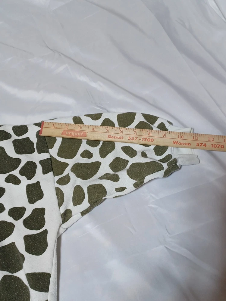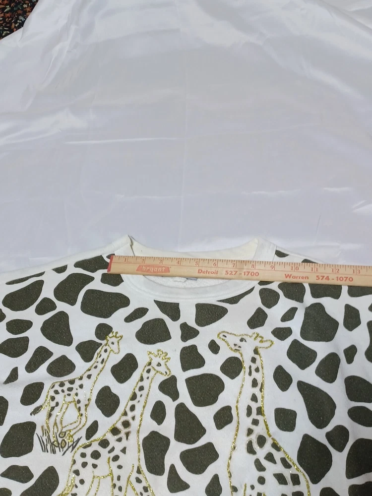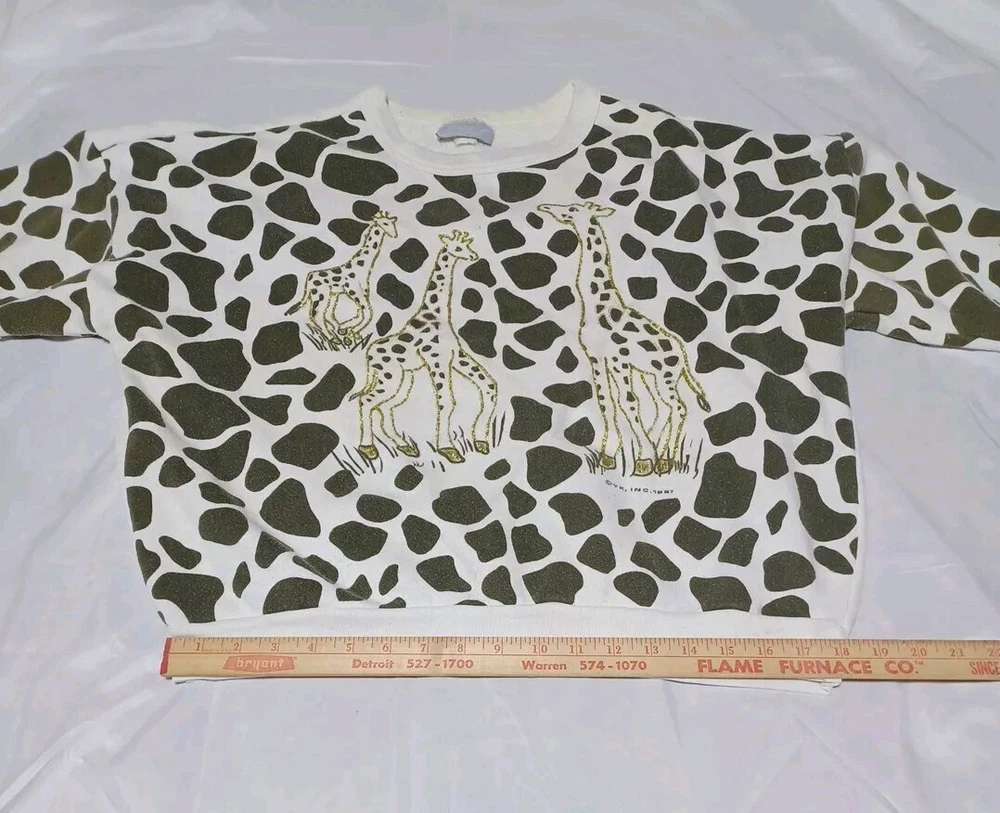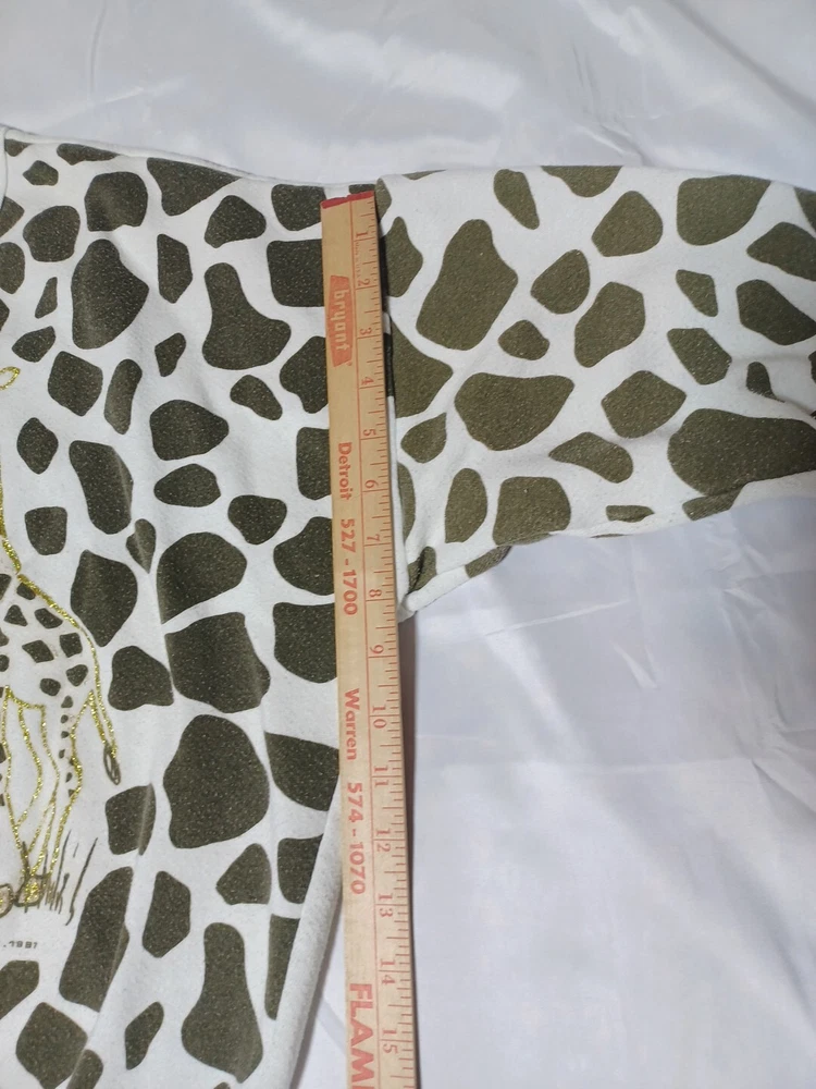 Cotton polyester blend. This is from the 80s. There is some discoloration on the neck. It says one size on it please see measurements in pictures. Might work as a crop top. The chest size seems short. There is glitter to outline the giraffes. Please see pictures for better details. If you have questions feel free to ask.
