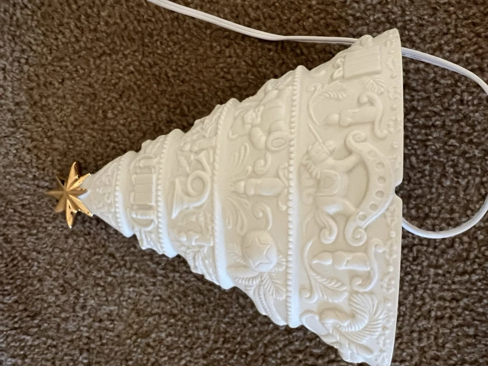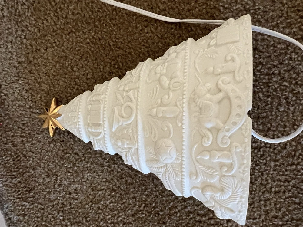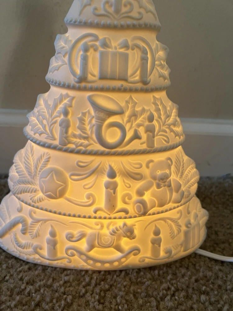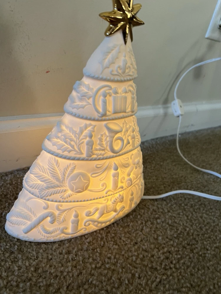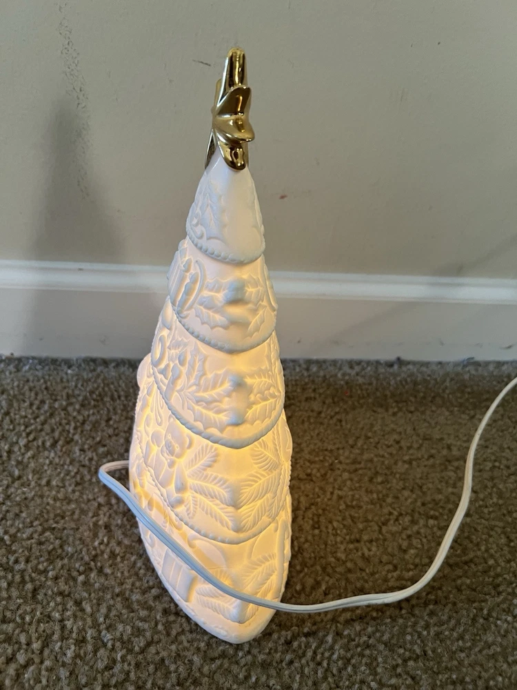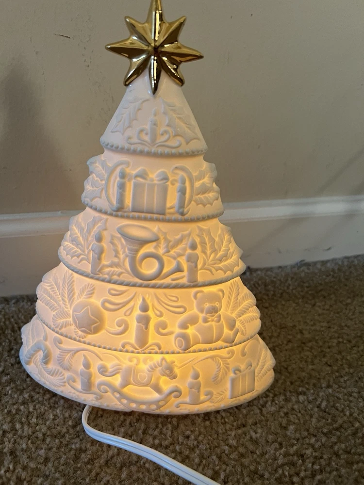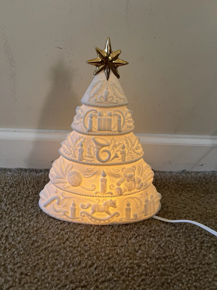 Adorn your space with the serene glow of this vintage 1998 White Christmas Tree Night Light. Designed as a delightful wall decor piece, it features a charming gold star porcelain bisque that exudes a timeless elegance. Perfect for creating a festive atmosphere in any room, this artificial tree serves as a subtle, yet enchanting, reminder of the holiday season all year long. Crafted with care, this unbranded night light is a testament to the holiday's lasting allure. Whether it's lighting up your nursery or adding a touch of whimsy to your living space, this porcelain tree is a sweet addition to your home decor collection, ready to bring a bit of Christmas cheer to your everyday. Used