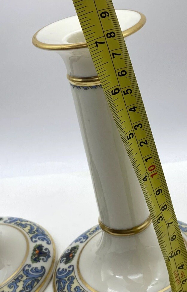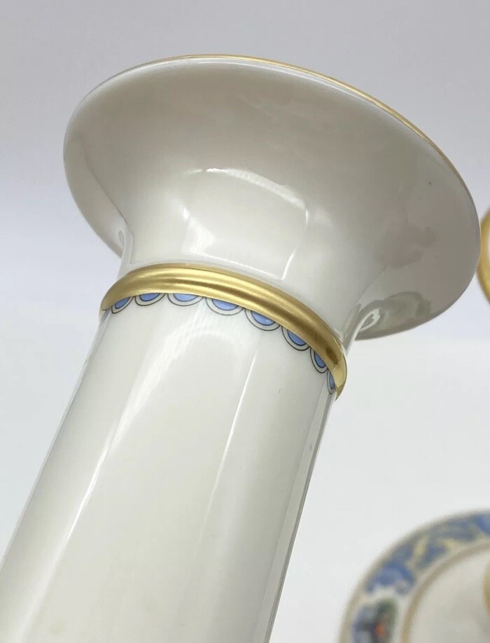 Elevate your space with the vintage charm of Lenox porcelain, adorned with a touch of elegance from the Autumn Column Candlestick collection. Crafted in the 1990s, this set includes two medium-sized, ivory candle holders that boast a hand-painted design, meticulously embellished with 24-karat gold accents. Their asymmetrical shape and abstract style reflect a timeless aesthetic, making them a sophisticated addition to any room. Designed for adults and suited for all occasions, these candle holders embody the essence of the Jewel Collection theme. Originating from the United States, each piece features a glossy finish that captures the light to enhance the overall ambience. Whether displayed on a mantle or as the centerpiece of a table setting, these Lenox creations are sure to impress.