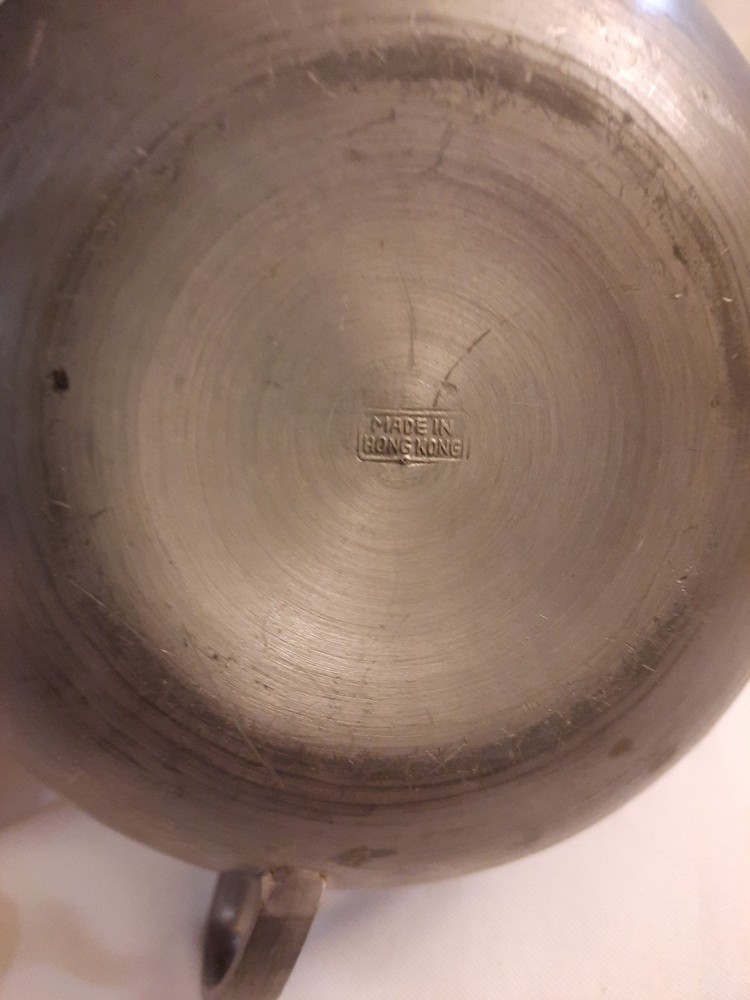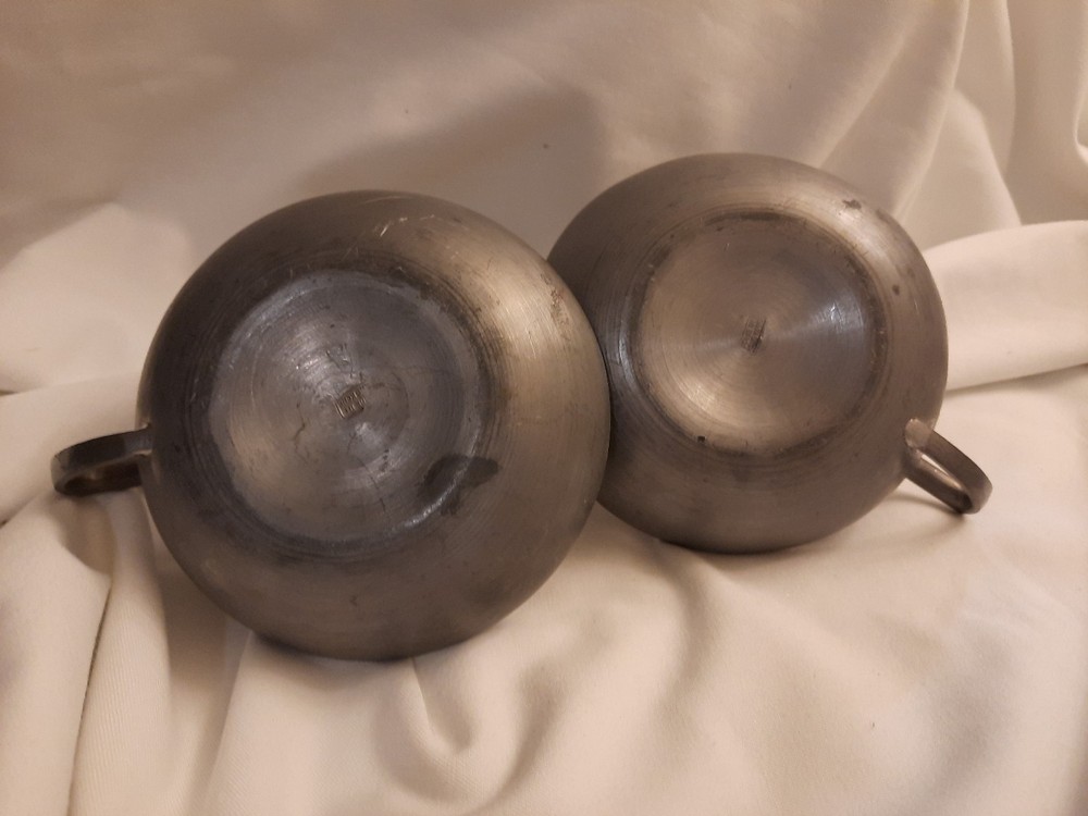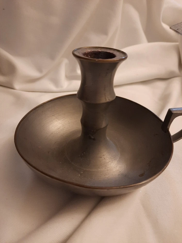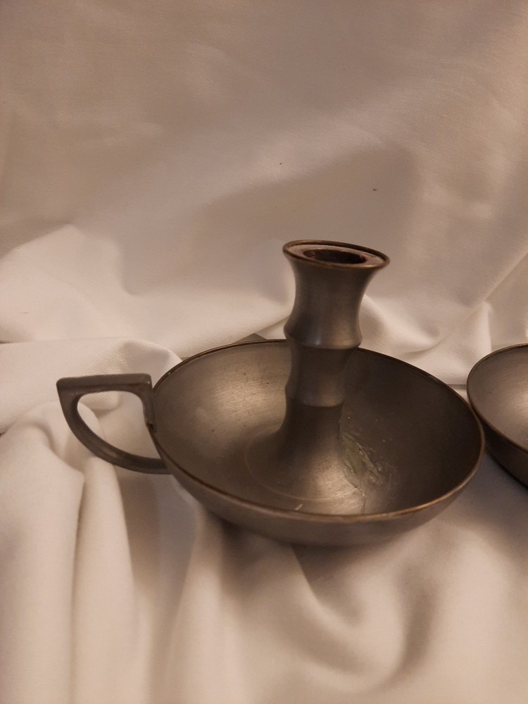 These vintage pewter taper candle holders are modeled after American Colonial chambersticks from the 18th or 19th century. Made in Hong Kong , they feature a gray color with a brushed finish and an all-over pattern. Suitable for all occasions, these small candle holders are perfect for adding a touch of Colonial style to any home decor. With handles for easy carrying, these candle holders are a charming and nostalgic addition to any collection.
