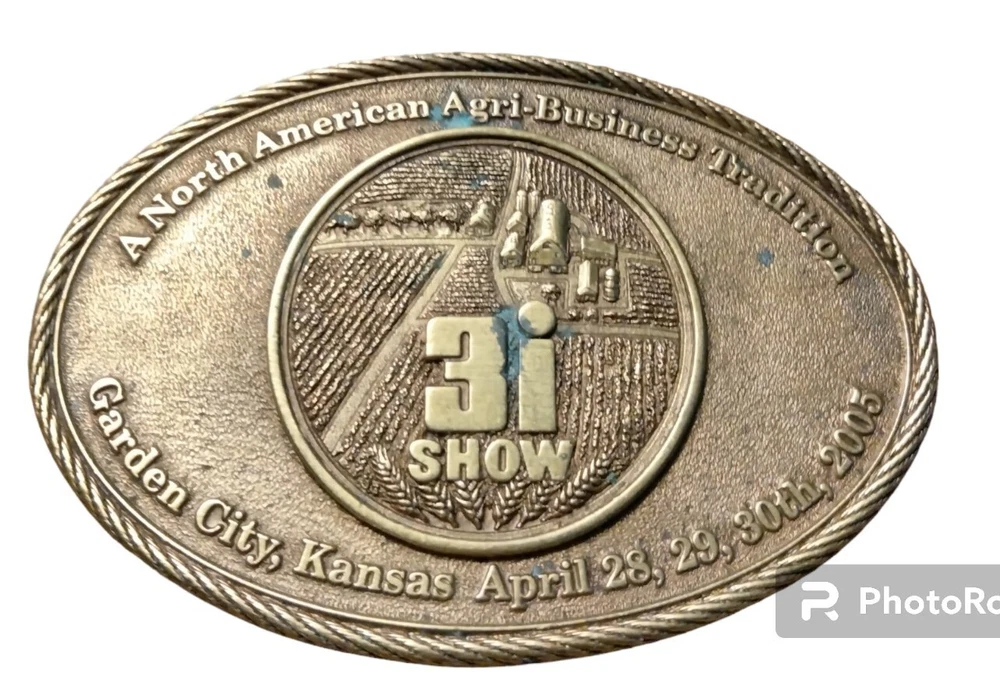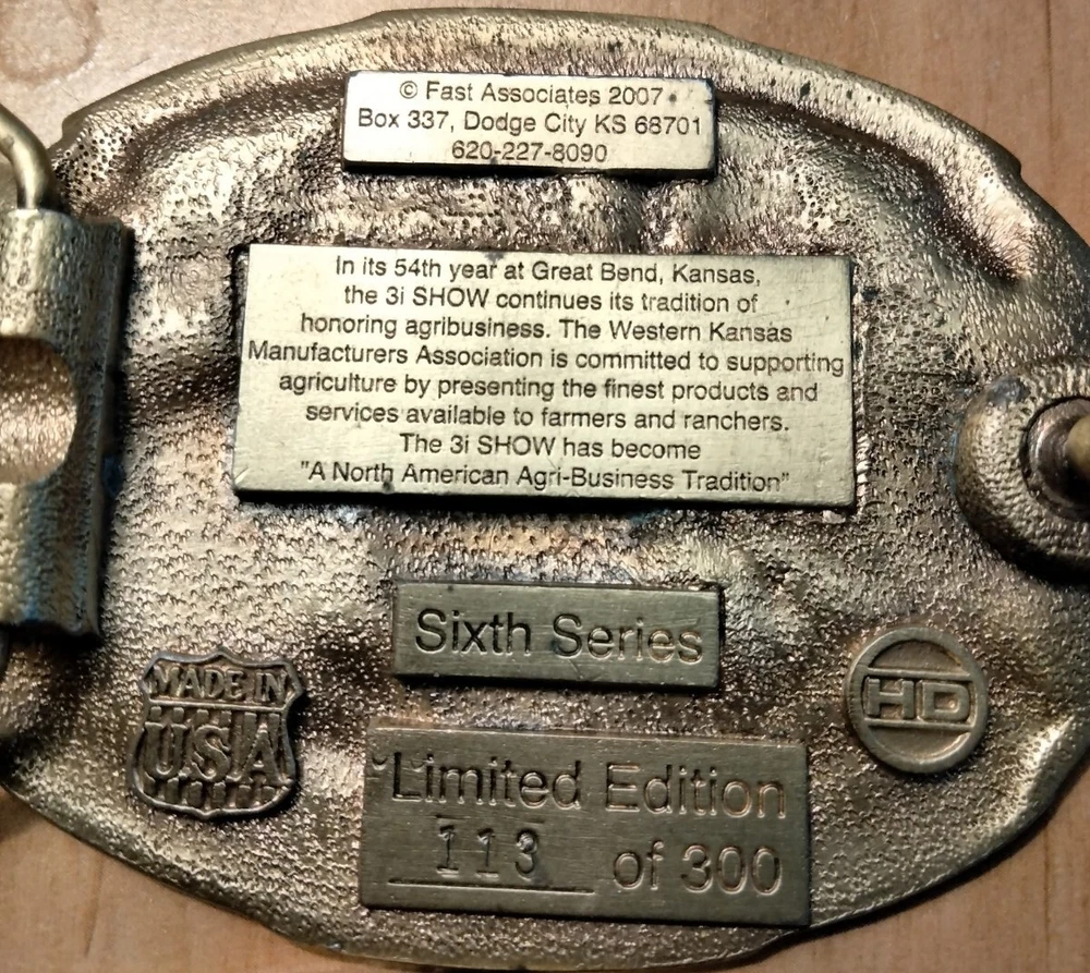 This vintage belt buckle set features two pieces with a North American Agri-Business Tradition theme. One has Garden City Kansas 2005 on it and is Ltd Edition 113 of 300 Sixth series. The other one is Great Bend Kansas 2008 6th in the series Ltd edition #113 of 300. Made by Siskiyou in the United States, The set is perfect for anyone who is a fans of farming and agriculture. Both belt buckles are being sold as one lot. The buckles have scratches and need cleaning.