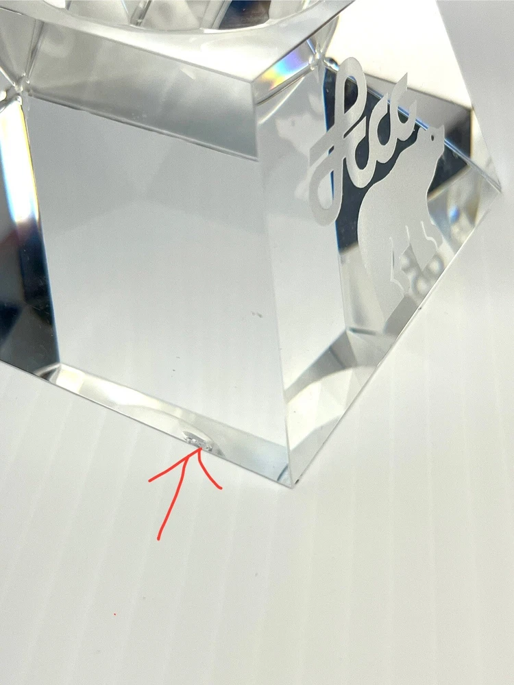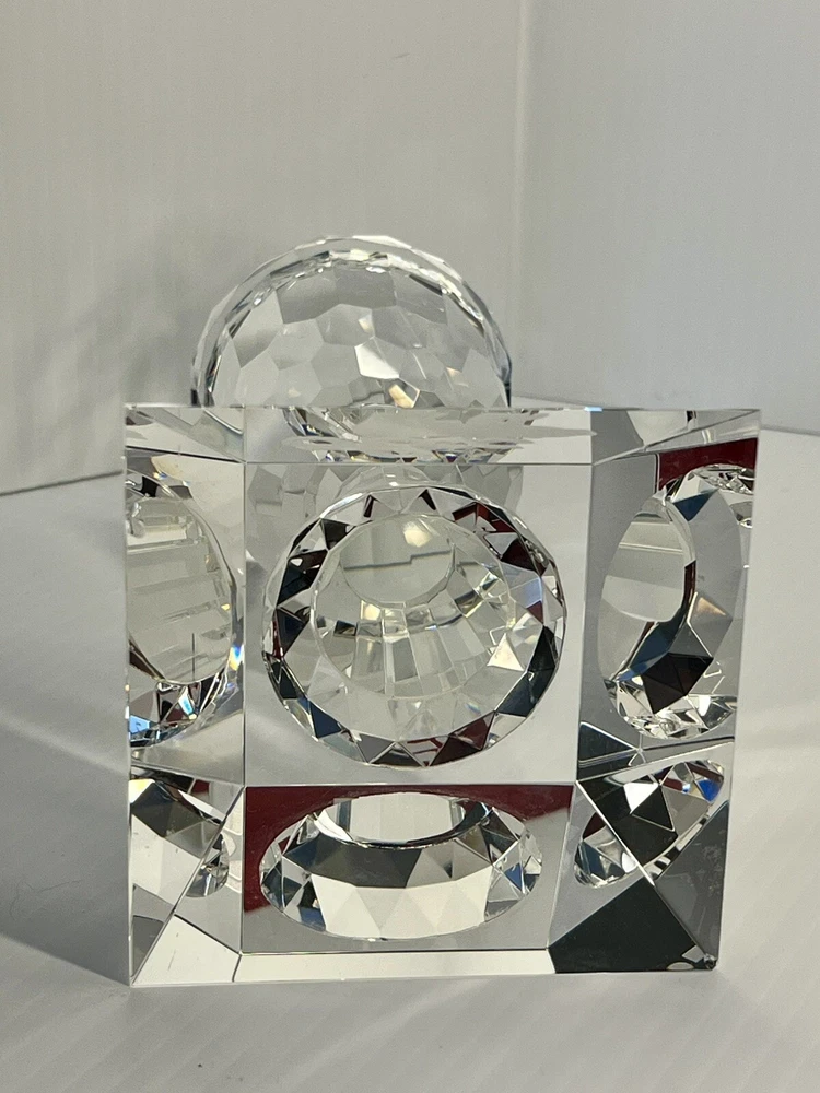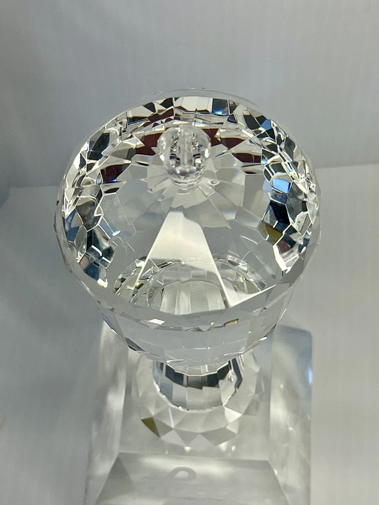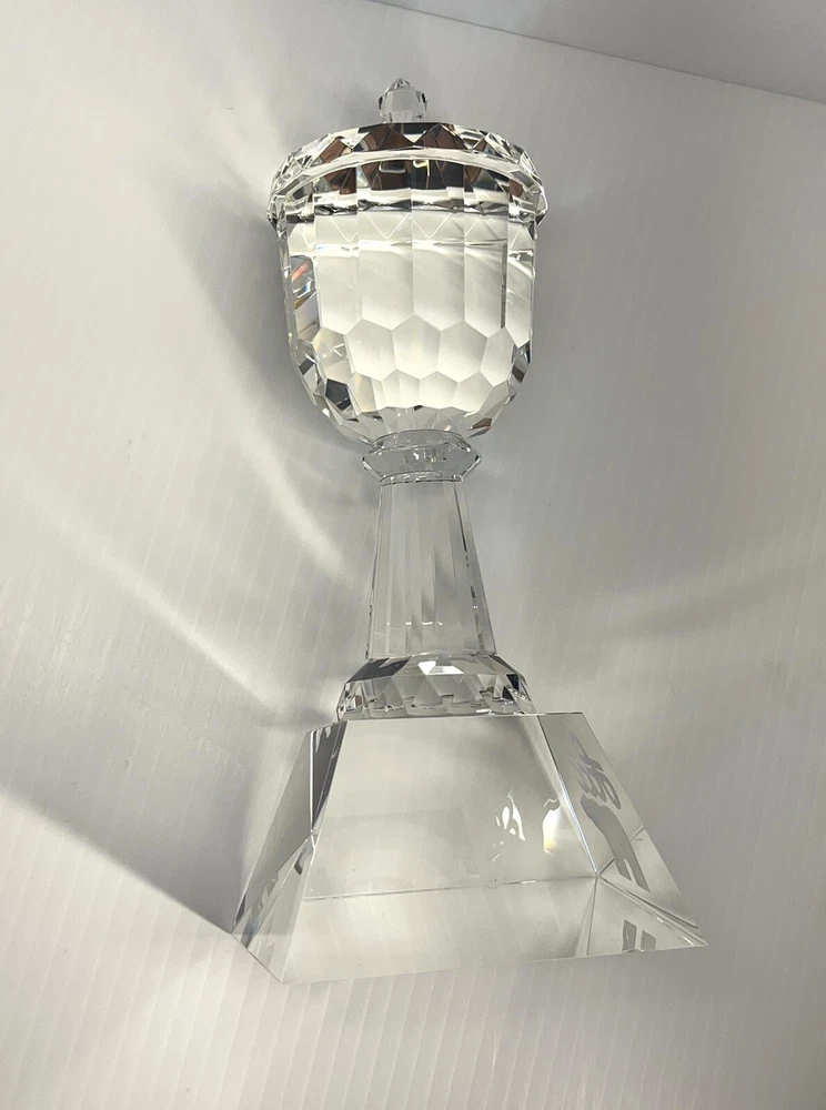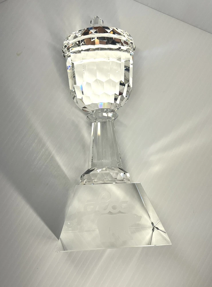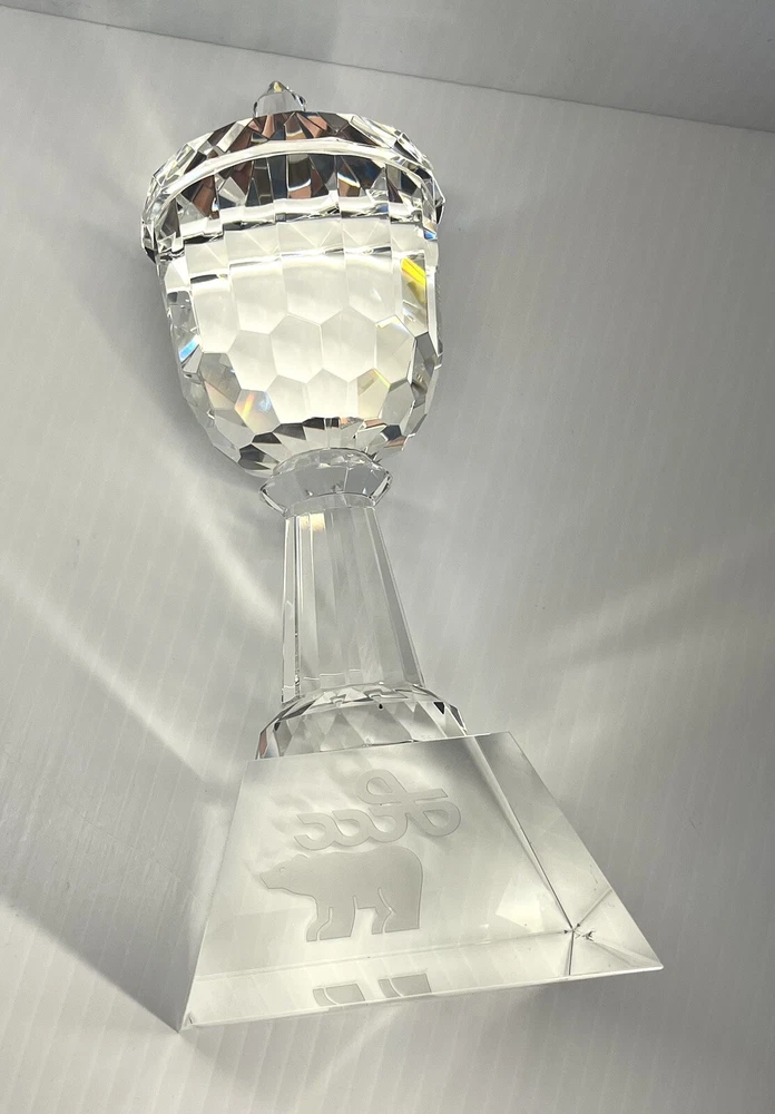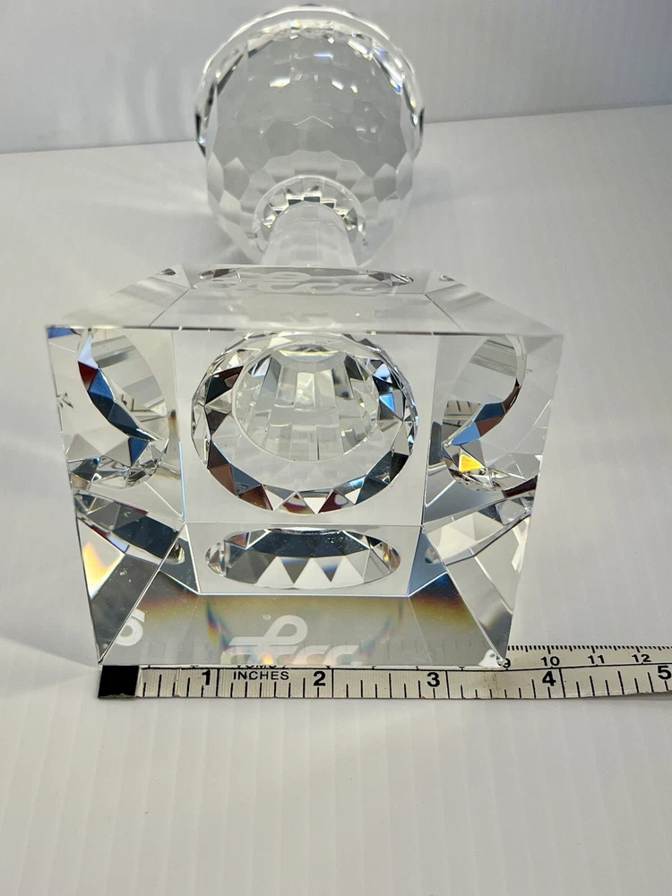Vintage 24% lead Cut Crystal Iridescent pillar style trophy cup award paperweight Weight 2lbs 1oz - 9 inches tall - 4x4” base Etching in the base is a Bear/Polar Bear figure and the text “LCCC” referencing *Lorain County Community College* (located in Ohio) NOTE* Has two (2) very tiny chips / one is on edge of base. The second is the very tip of the finial * see photos Late 90s~ early 2Ks By Anson - No back stamp - No Box Vintage Estate display Thank you