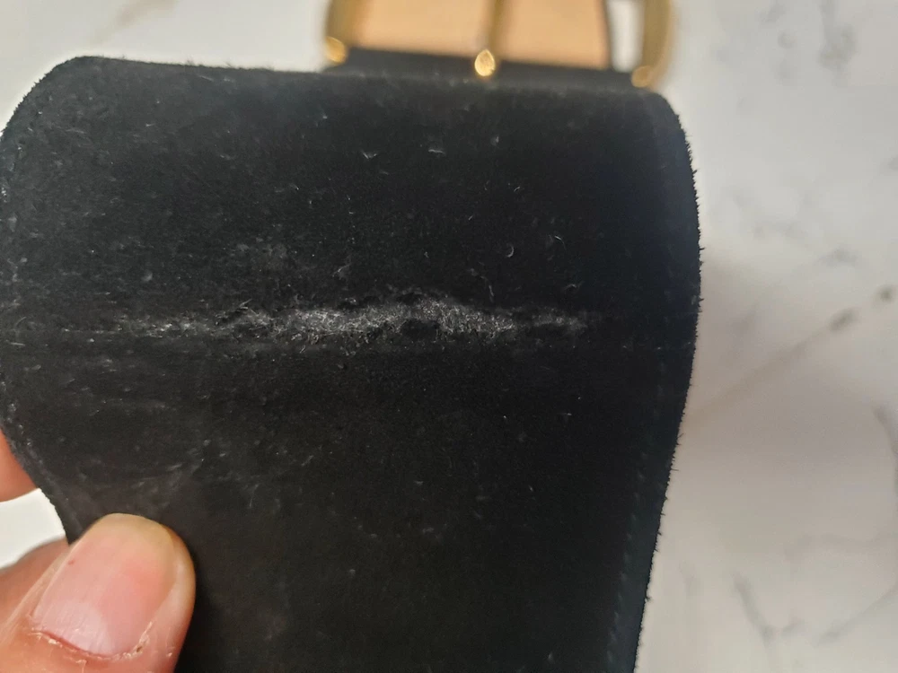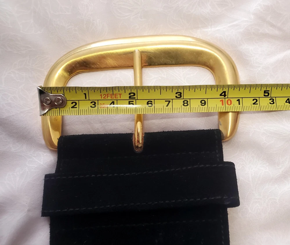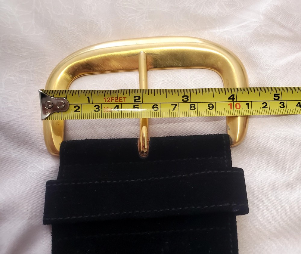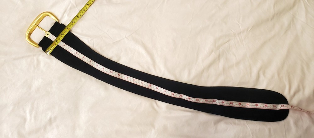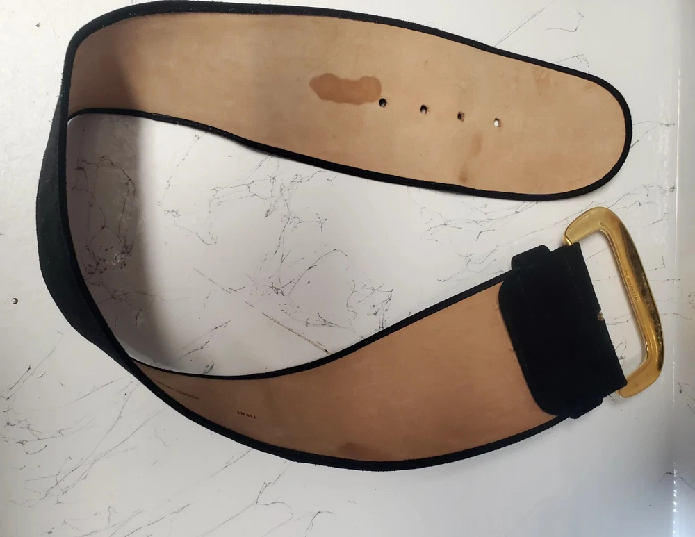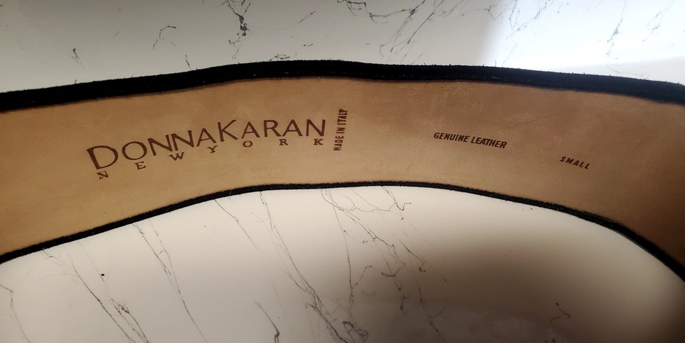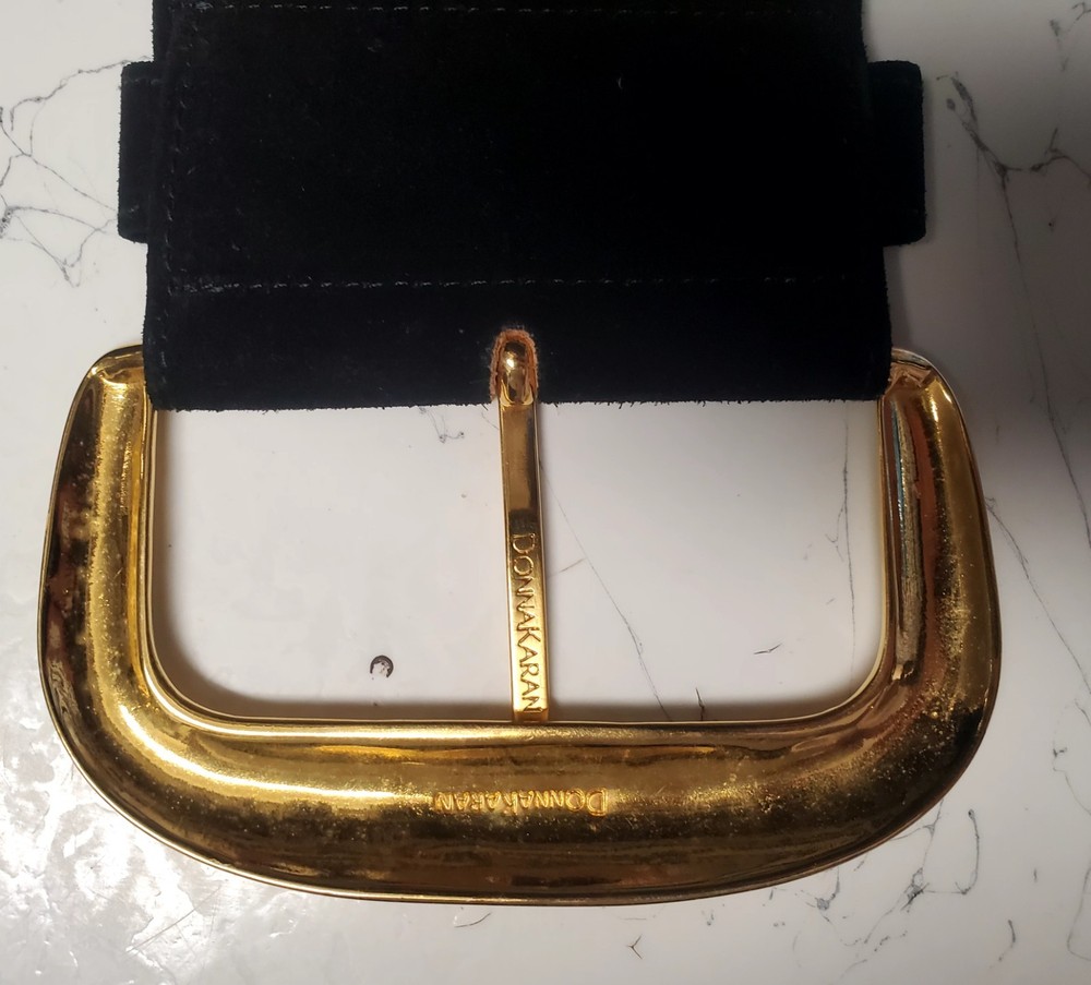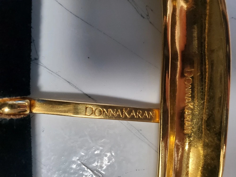Designer Salvage: Vintage 1980s Donna Karan New York Wide Waist Belt This listing is for a rare, authentic Donna Karan New York belt from the late 80s, offered as a premium refurbishment project or for its iconic hardware . The standout feature is the oversized, heavy gold-tone buckle , a signature of Karan’s early "Power Dressing" era. While the interior is stamped "Made in Italy" Genuine Leather , the outer black velvet/suede-style finish has aged and requires attention. Condition for Refurbishment: • Outer Layer: There is a visible crack through the outer velvet/suede material that requires repair or replacement. • Interior Leather: Features a large water/oil-type stain on the tan leather lining. • Hardware: The gold-tone buckle is in good vintage condition with a beautiful weight and finish. Measurements: • Total Length: Approximately 32 inches . • Width: Up to 4" Wide-style silhouette typical of the 1980s. Perfect for a designer archivist, a leatherworker looking for authentic hardware, or a vintage lover ready to restore a piece of fashion history.