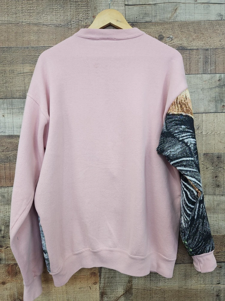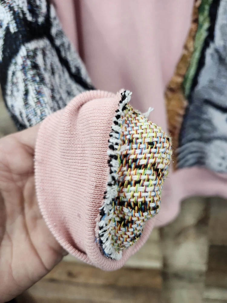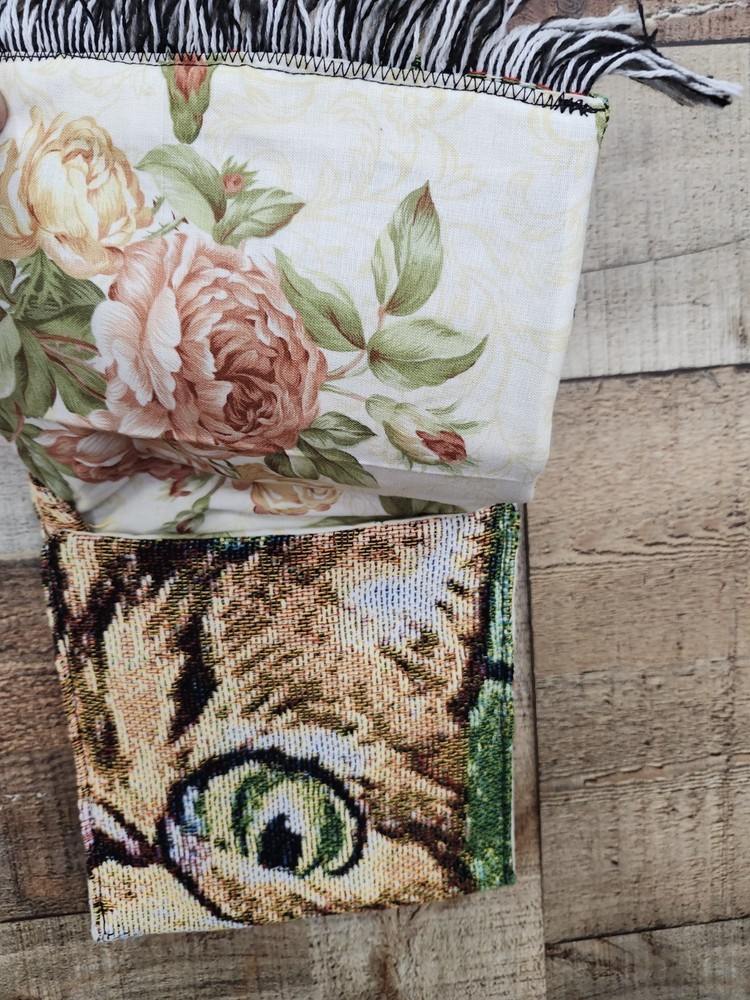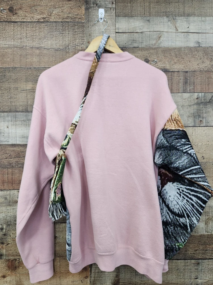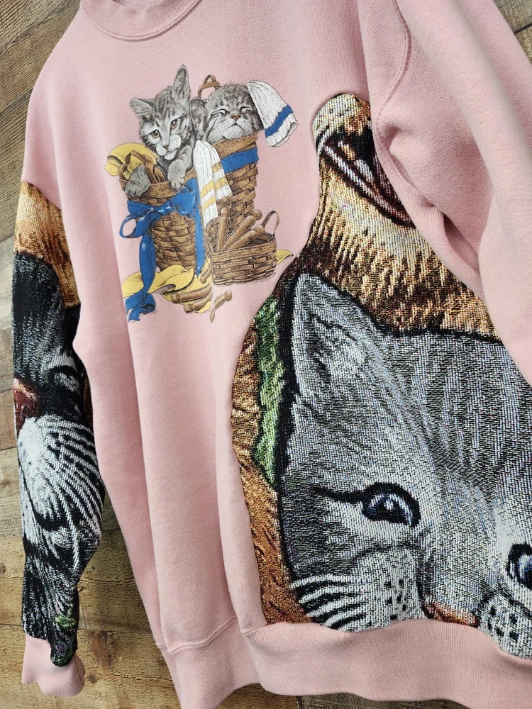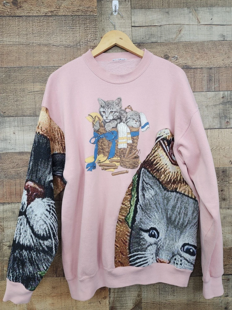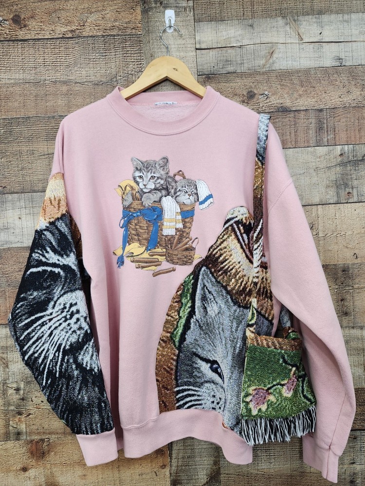 This vintage 90s custom reworked upcycled tapestry kitten sweatshirt with a purse in size XL is a unique and stylish piece for women.ONE OF A KIND! Made from knit cotton fabric, this pullover sweatshirt features a crew neck, raglan sleeves, and a graphic print of a kitten. The sweatshirt is adorned with crochet, fringe, and embroidered accents, giving it a hipster, festival-inspired look. Perfect for casual outings, activewear, or even a party, this sweatshirt is a one-of-a-kind addition to any wardrobe. Made in the United States by JERZEES, this sweatshirt is a must-have for those who appreciate retro fashion and classic style. I SHIP IMMEDIATELY 🚢 💖