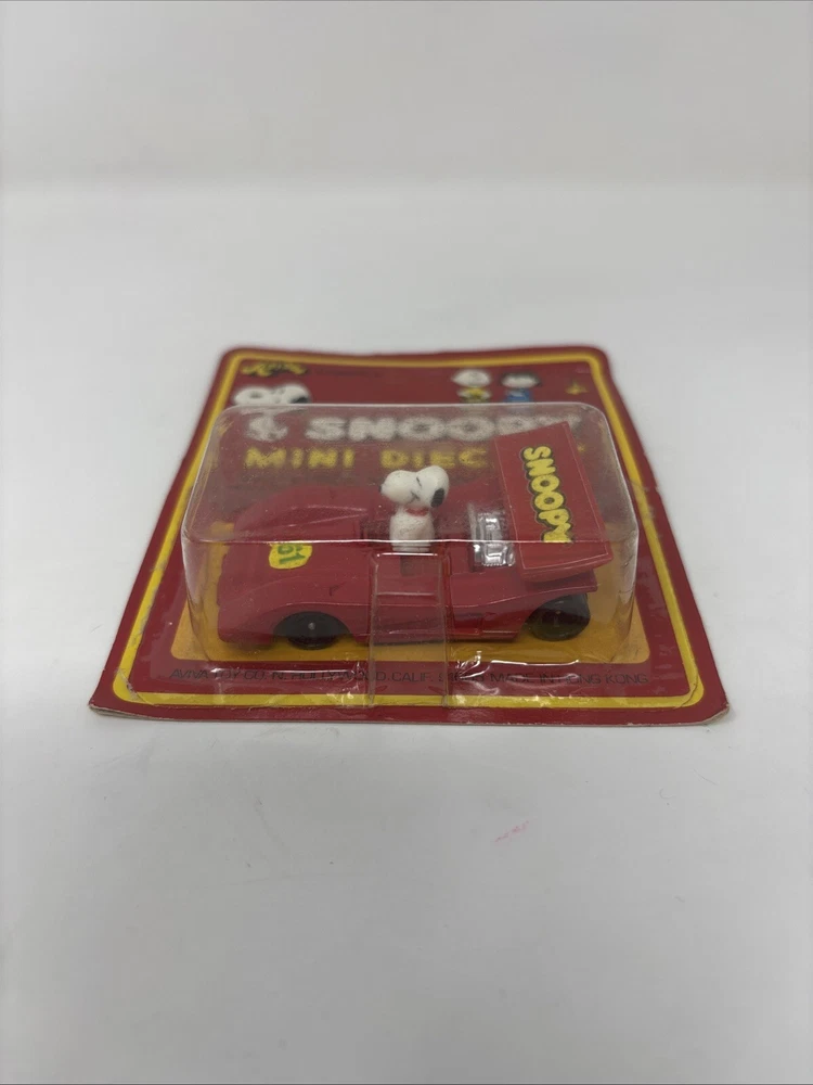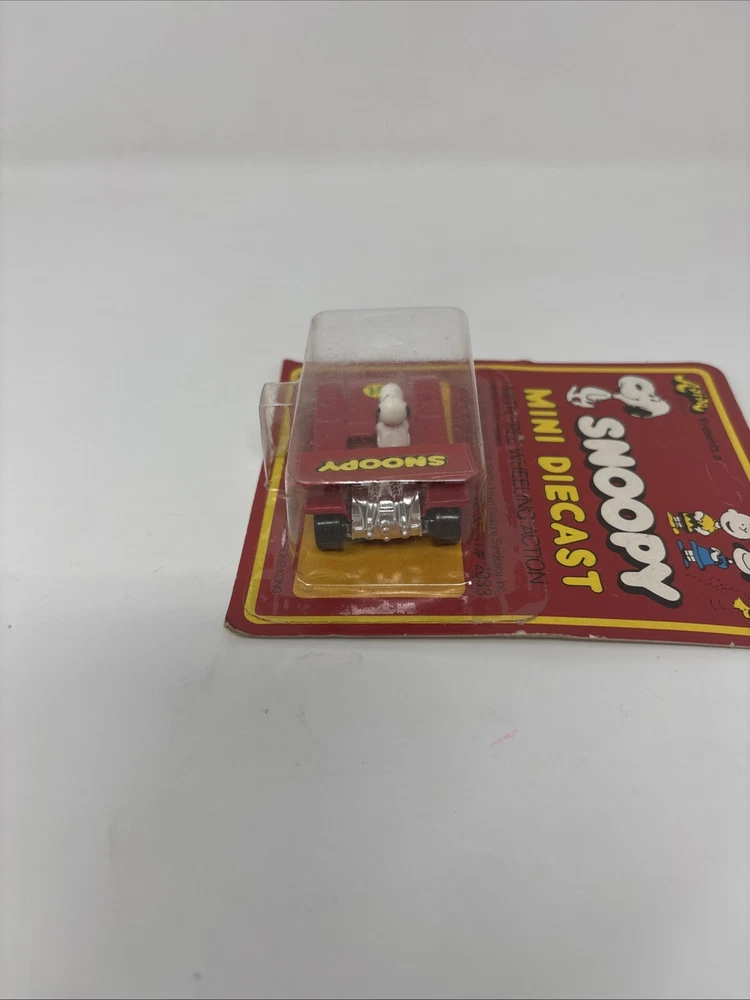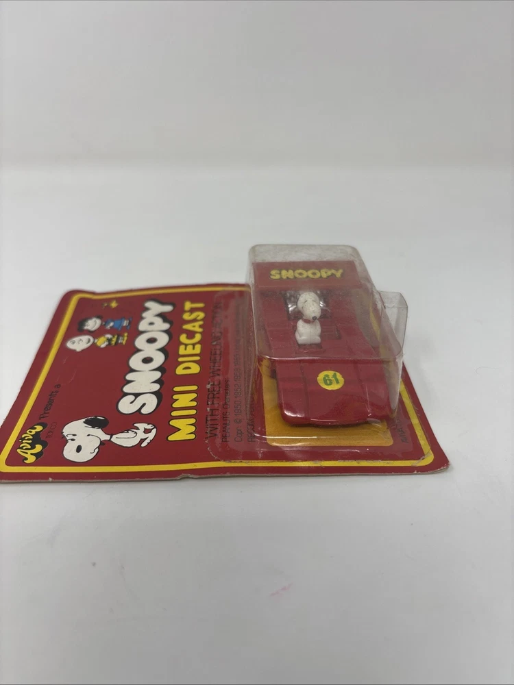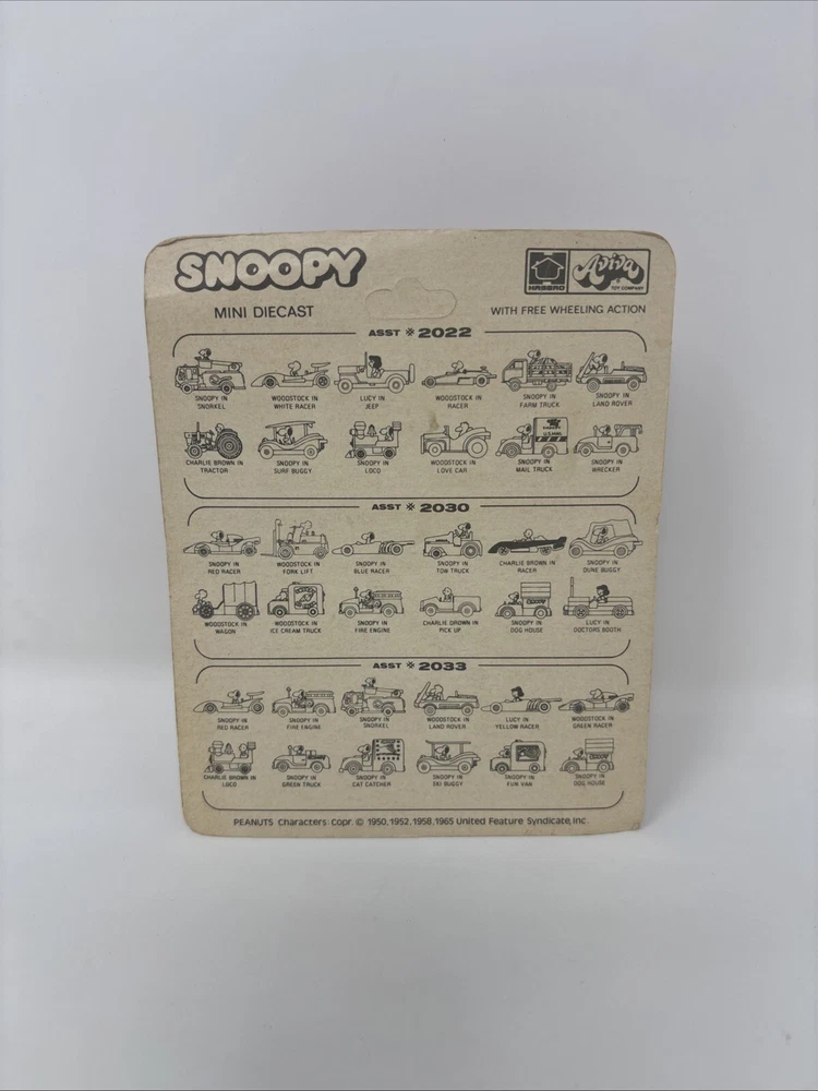 This vintage AVIVA Snoopy Mini Diecast from 1965 features Snoopy in a red race car. Made in Hong Kong, the diecast vehicle is multi-colored and approximately 1/64 scale, measuring 2.65 inches long. Suitable for all genders, this collectible piece is part of the SNOOPY Mini Diecast series.