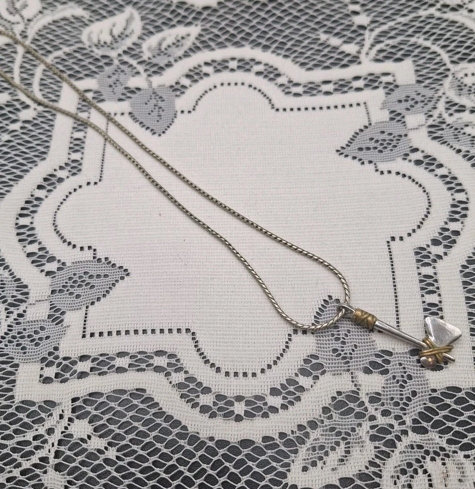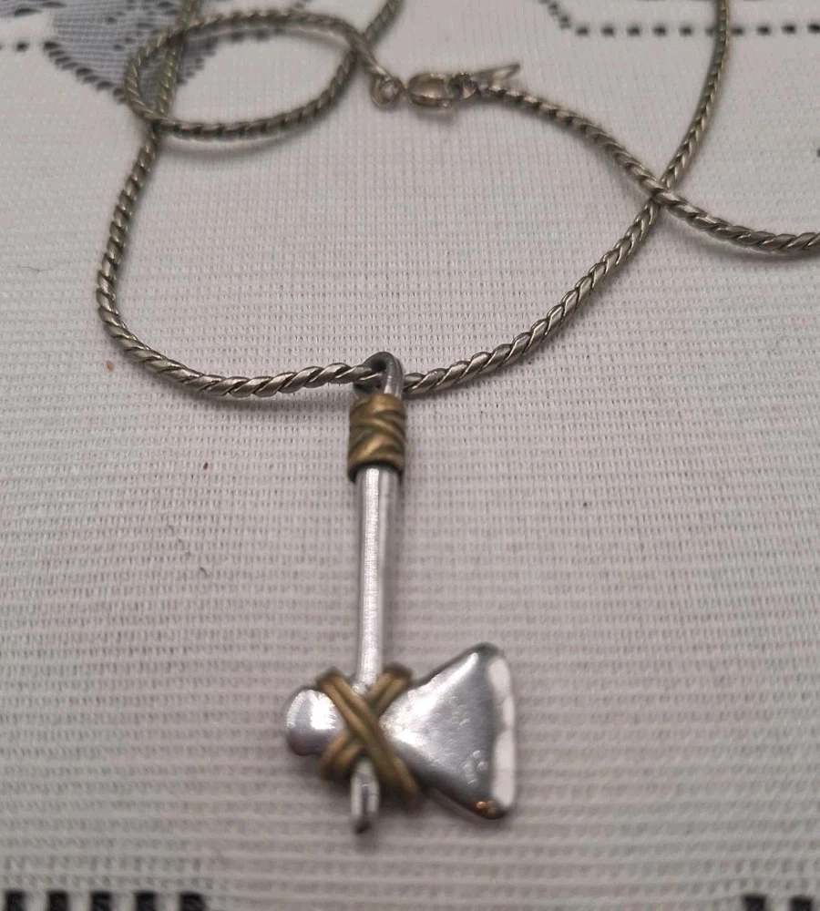 This vintage Viking or Native American Tomahawk-Axe Necklace is a unique and stylish piece made of sterling silver. The pendant features an axe or tomahawk hatchet design, adding a touch of ethnic and regional flair to any outfit. The necklace is signed as "No," and it is perfect for special occasions such as Christmas, graduation, weddings, anniversaries, and birthdays. Made with a silver toned chain, this pendant charm necklace is a beautiful and meaningful addition to any jewelry collection.