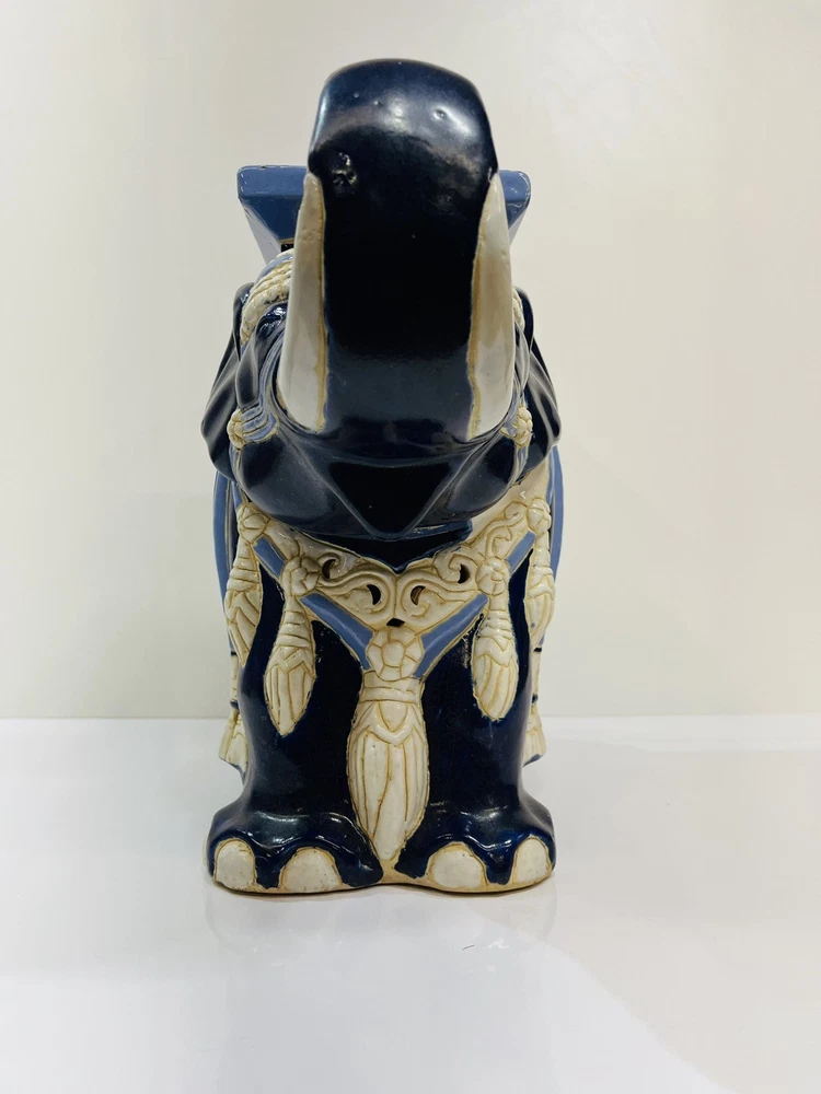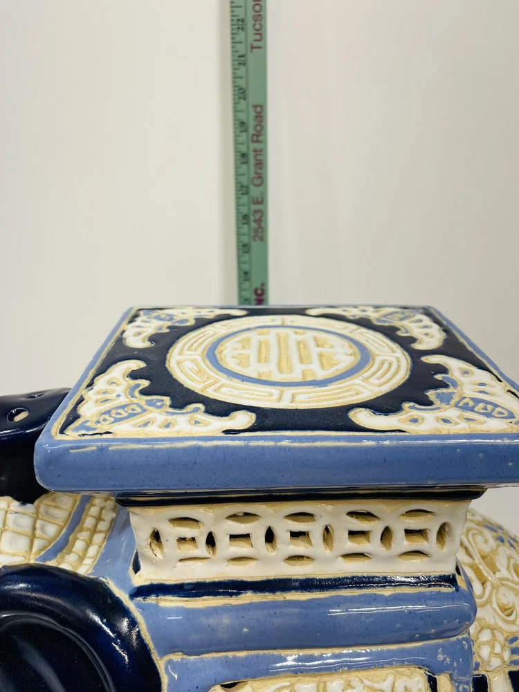 Vtg Blue Glazed Ceramic Elephant | Chinese Garden Stool | Pedestal | Side table. Measuring 20 inches long by 15 inches high and about 9 inches wide. It weighs just under 15 pounds.. it does show some signs of age such as crazing And some small imperfections in the glaze. There is a chip in the glaze on the tusk and a small one on the snout, as well as one on the dark blue line in the center of the elephant all three imperfections are shown in the last photos. Having just shipped one , It will be double boxed insured and signature confirmation added to insure safe delivery..