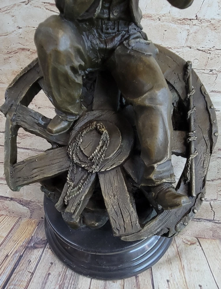 Vtg Bronze Copper Equestrian Cowboy Horse Tobacco Smoking Pipe Holder Statue Vtg Bronze Copper Equestrian Cowboy Horse Tobacco Smoking Pipe Holder Statue Condition: This sculpture is in perfect condition Bronze Dimensions with Marble Base: Height 17" X Width 10" Marble Dimensions: Diameter 9" Height without base:14" Weight:31 LBS Inventory:24YRD115712042 Capture the essence of the Wild West with our exquisite bronze sculpture titled "Lonely Cowboy." Handcrafted with precision and skill, this remarkable artwork portrays a cowboy sitting and daydreaming as he leisurely lights his pipe. The attention to detail in this piece, marked with the artist's name Fisher, brings the cowboy's character to life, evoking a sense of solitude and reflection. Molded using the ancient lost-wax casting method, the sculpture exudes authenticity and artistry, preserving the fine nuances of the cowboy's posture and expression. Enhanced with a brown patina finish, the artwork adds depth and richness, ensuring its lasting beauty and preservation for generations to come. Mounted gracefully on a sleek black marble base, this handcrafted bronze sculpture bears the signature of the artist Fisher, a symbol of its genuine artistry and craftsmanship. Whether displayed in a western-themed collection or as a centerpiece in your home, "Lonely Cowboy" is a timeless tribute to the spirit of the frontier and the enduring legacy of the Wild West. A captivating addition for collectors and enthusiasts alike, celebrating the mystique and allure of the cowboy way of life. Shipping Terms : Most of our items are shipped via USPS (United States Postal Service) mail or UPS. Most orders are shipped within 24-48 hours of purchase. Please be aware that not all items are available for USPS shipping due to size and weight. We do ship to Hawaii, Alaska, Canada, Puerto Rico, APO/AE, and U.S. Virgin Islands, however, an additional charge may be required. Please contact us before making any purchases in these areas. For Non-USA customers, you may be responsible for all duty, tax, brokerage fees that may be due upon delivery (shipping costs cover freight charges only). We also ship internationally. Please refer to the "Shipping and Handling" chart for the rates for each area. Payment : We accept just about any form of payment. PayPal, Master Card, Visa or American Express credit cards. Money orders, cashiers checks, and even personal or business checks. For governmental institutions, we will also accept a purchase order. Please understand that for personal or business checks we have to wait for the check to clear (usually 7 days) before shipping. Condition : New Detailed Hand Crafted Hot Cast Bronze Satisfaction Guaranteed. This is Stock Photo, Slight Color Variation!! Listing and template services provided by inkFrog