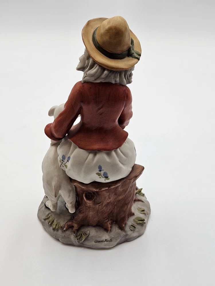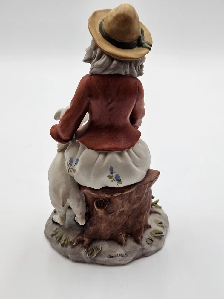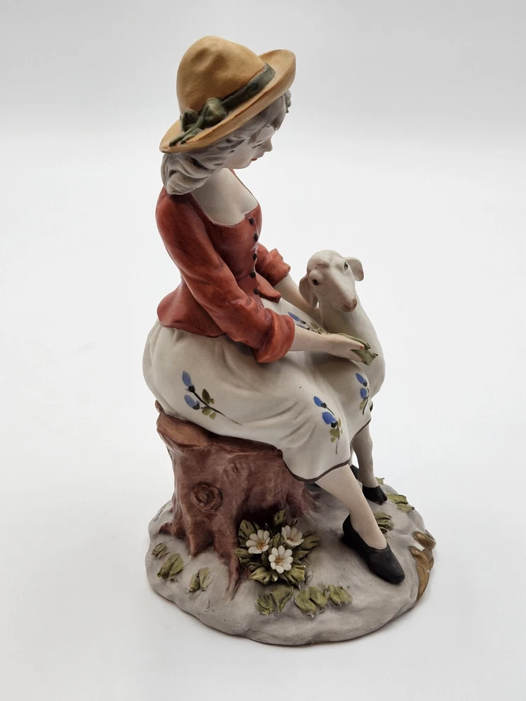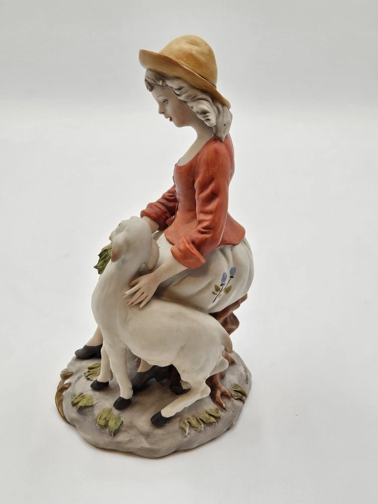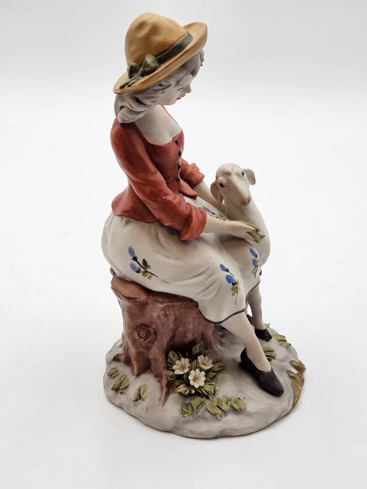 Vtg Capidomonte Woman With Lamb Figurine Signed Gianni Merlo, Hat Flowera, 7.75"
