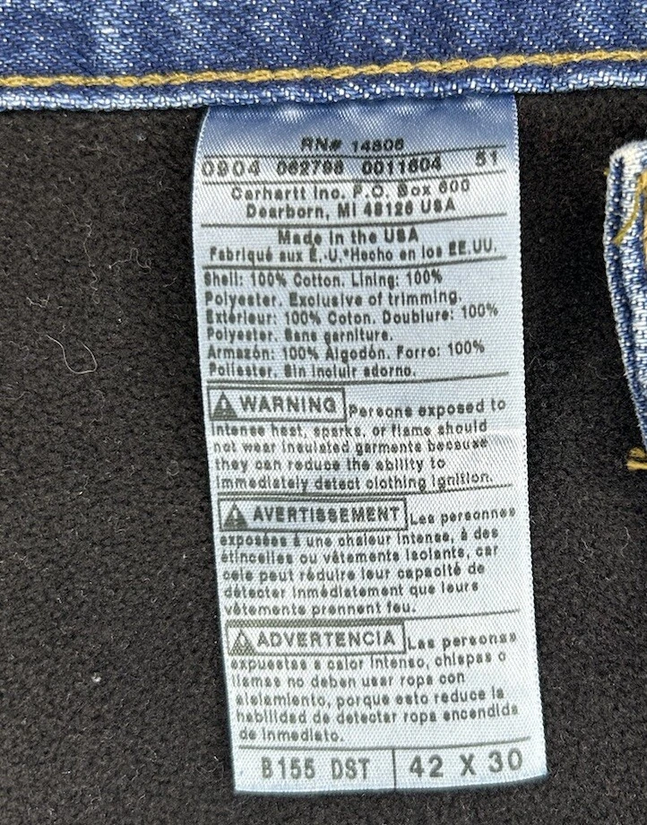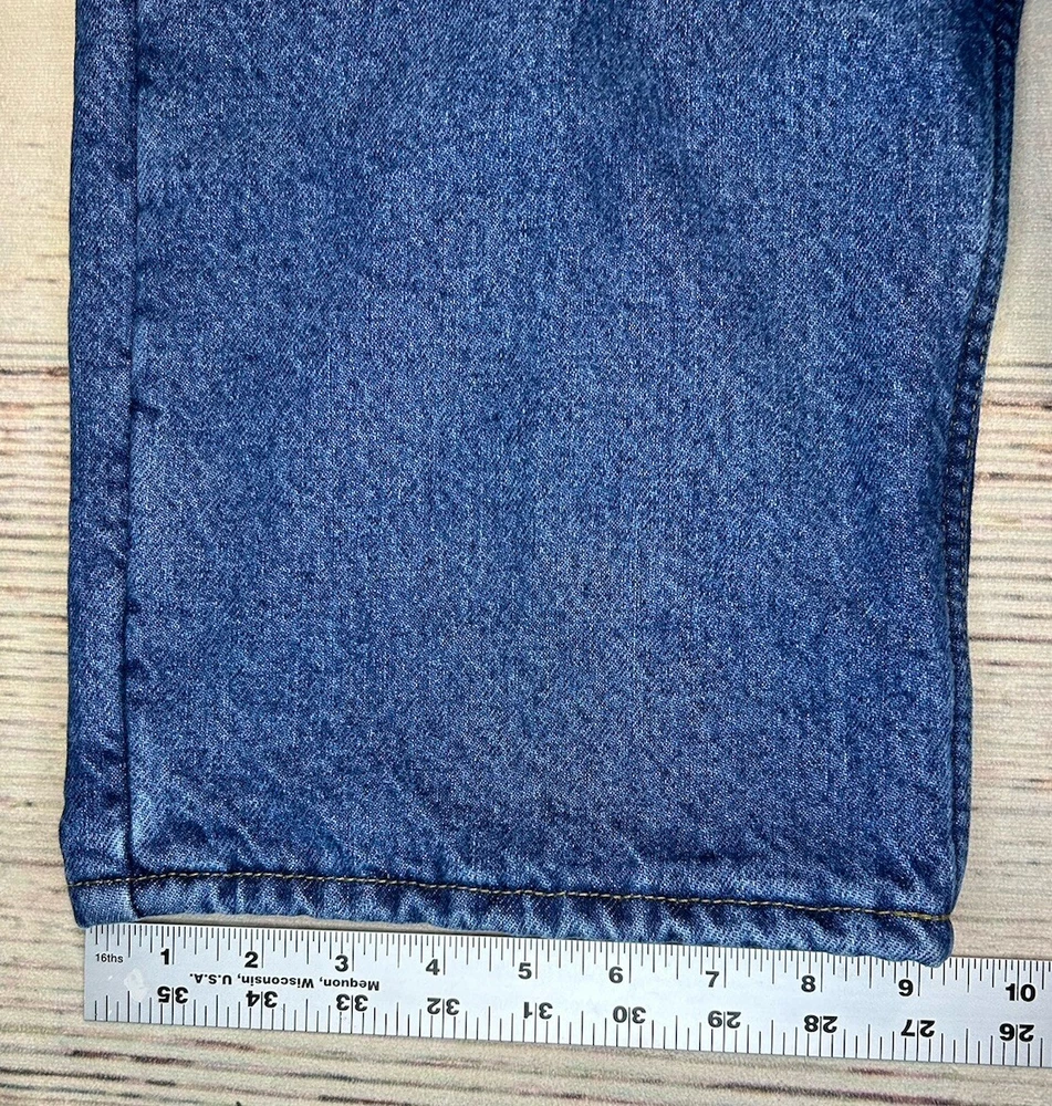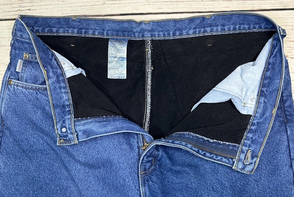 This pair of Carhartt jeans is a vintage gem for men who appreciate high-quality and classic outdoor wear. The jeans are made in the USA, with a denim fabric type and a medium wash that gives them a unique and timeless look. They feature a 5-pocket design with a zip and button closure, and a high rise of greater than 12 inches for added comfort. The jeans are lined with fleece and have a breathable fabric wash, making them perfect for winter, fall, and spring seasons. They are easy to care for and machine washable, ensuring that they will last for years to come. The Carhartt brand is known for its durable and functional clothing, making these jeans ideal for outdoor activities, hiking, or even workwear. See pictures for condition and measurements for size.