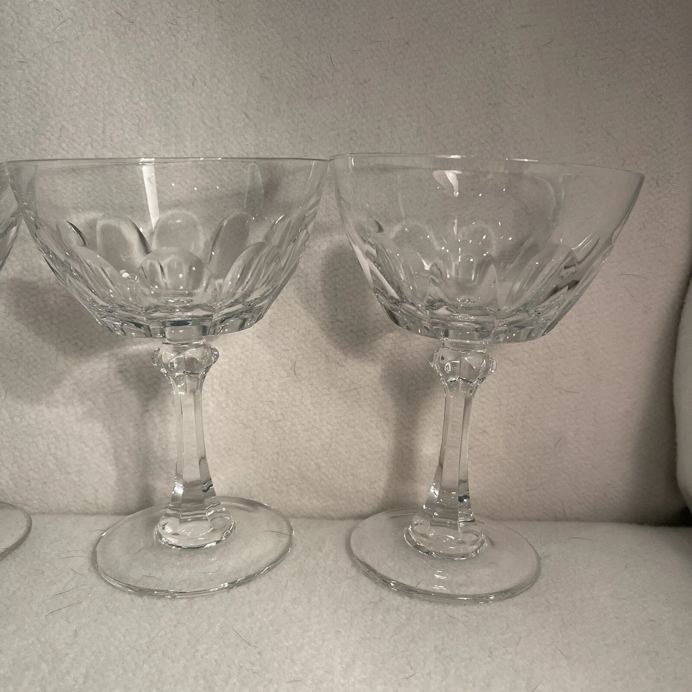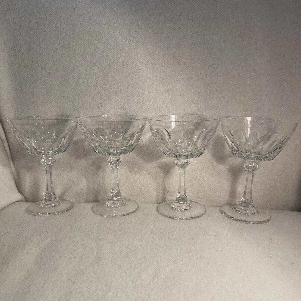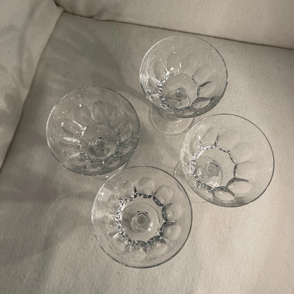 This set includes four vintage clear crystal champagne or sherbet glasses with a large thumbprint pattern. The round glasses are 4 inches in diameter and 5.5 inches in height, weighing a total of 1.13 lbs. They feature a mid-century modern style and are decorative in design, suitable for all occasions. The brand is Crystal Clear, and they are original pieces made of crystal, adding a touch of elegance to any tabletop setting. Excellent condition. No chips or cracks.