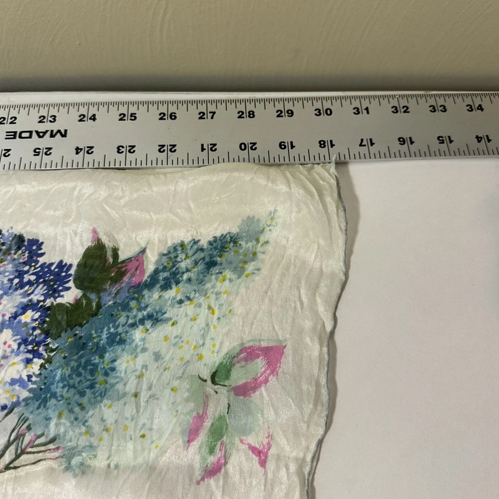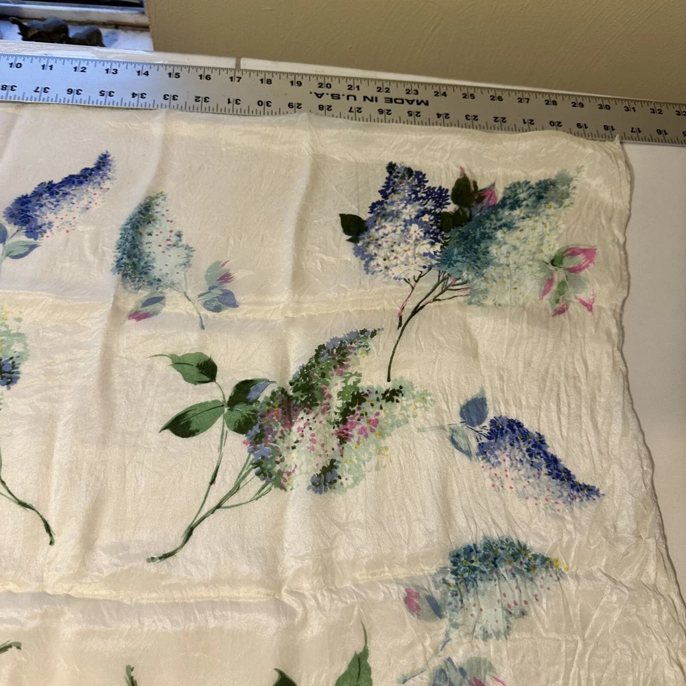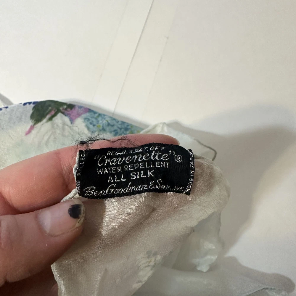This floral silk scarf by Be.Goodman & Sons adds elegance to any outfit. Its light texture and water-repellent feature provide both style and practical use. Good condition. • Water repellent design • Square shape • Delicate floral pattern • Cravenette label • Lightweight feel Approximately 28" X 28"