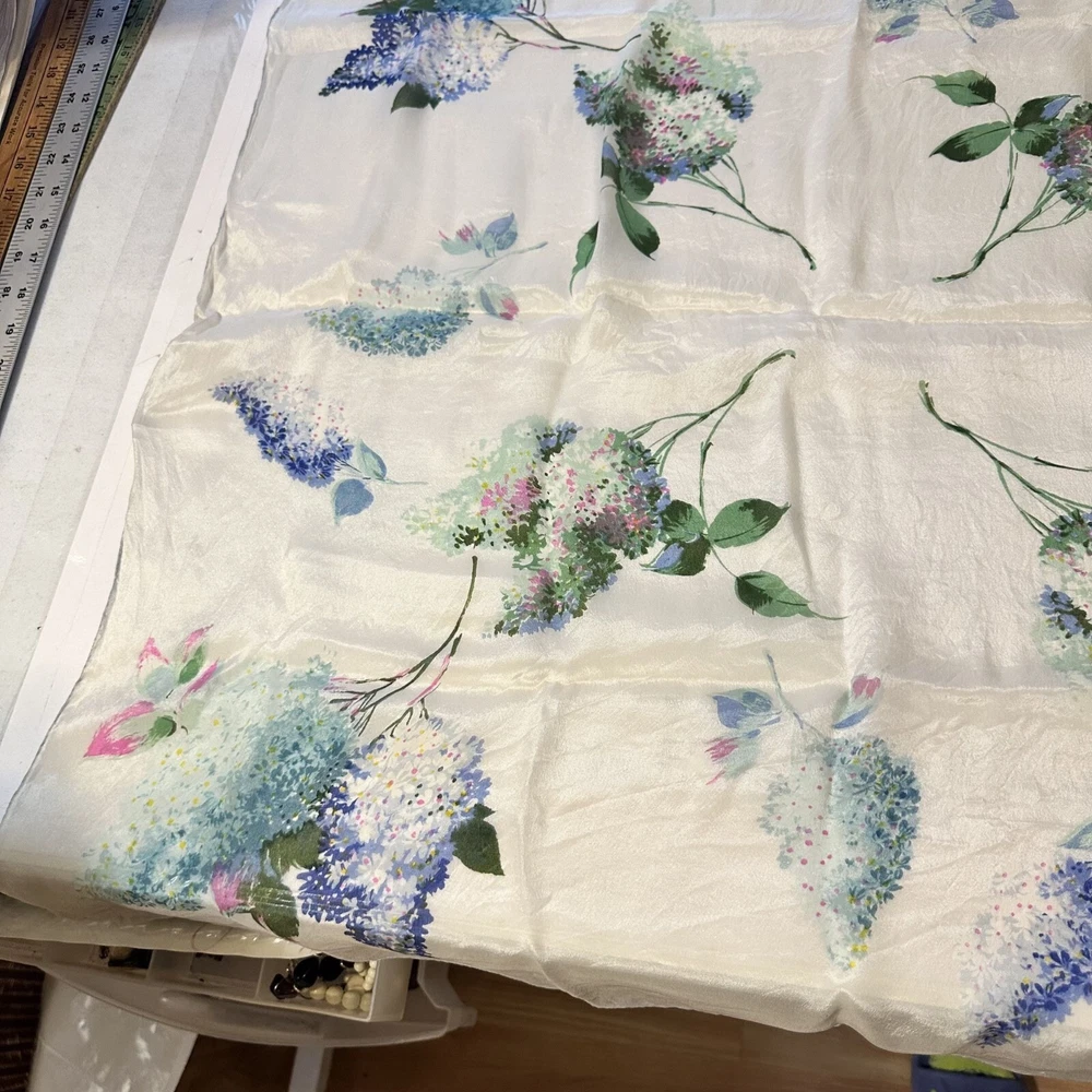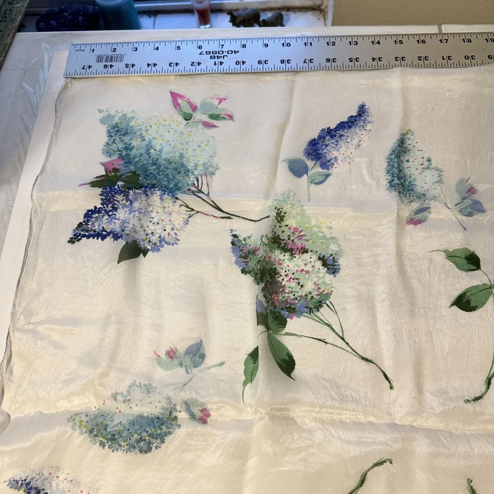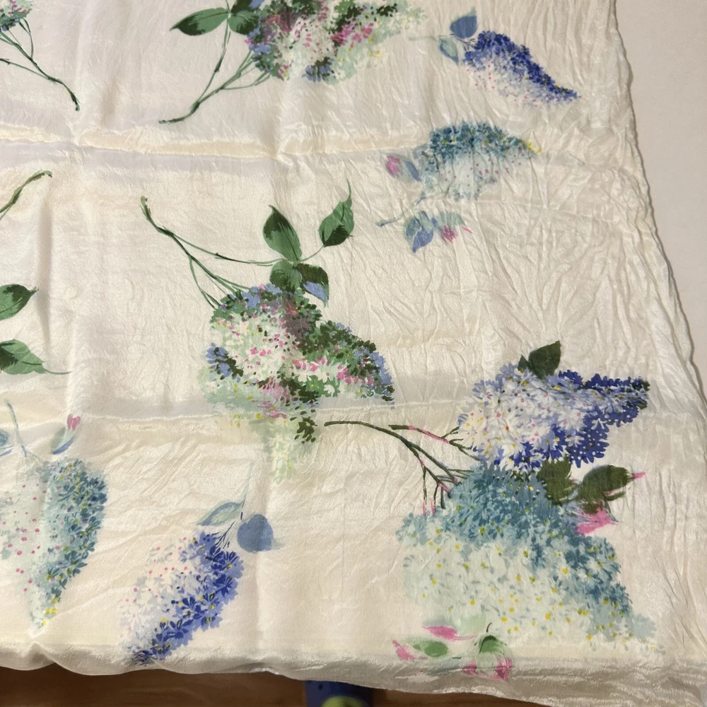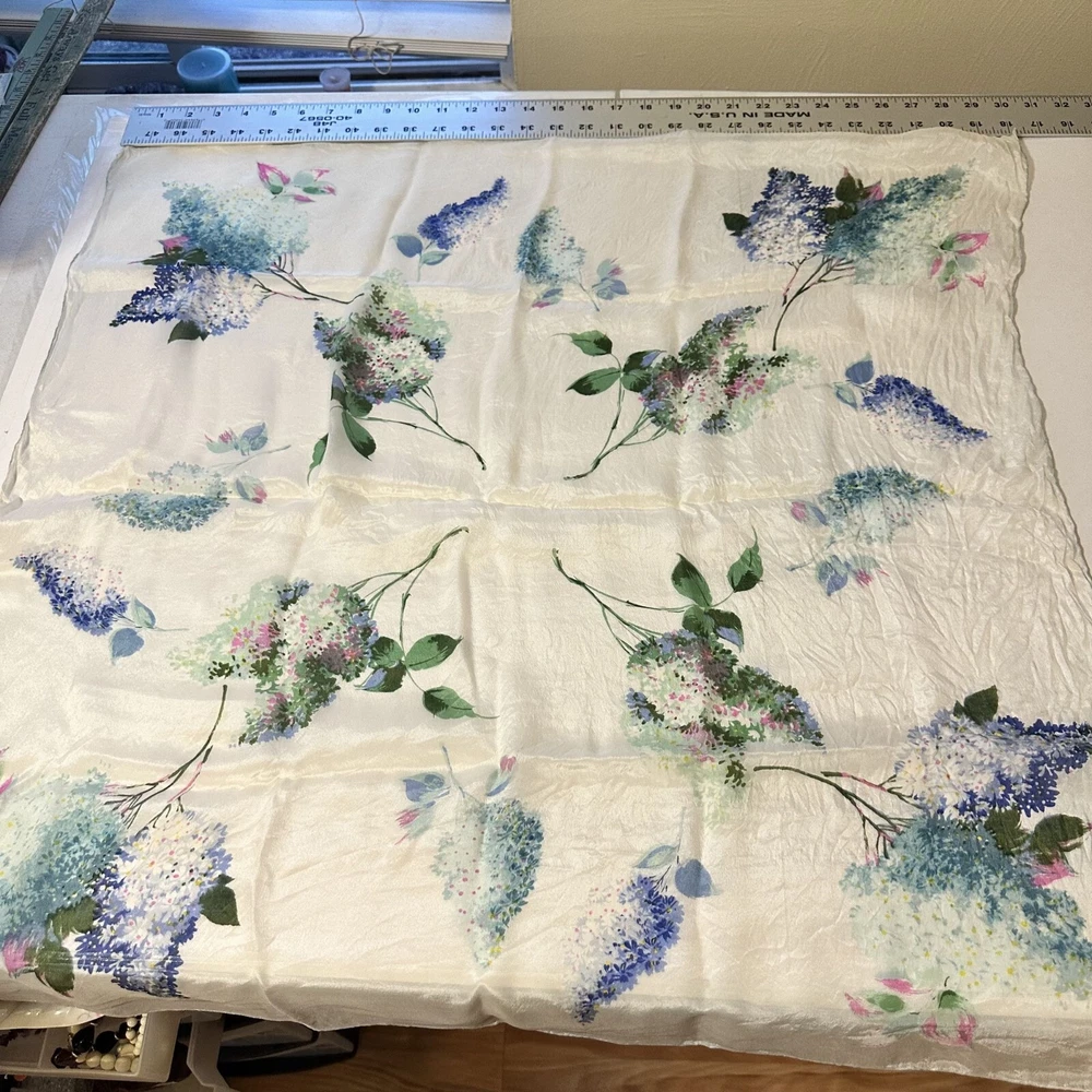 This floral silk scarf by Be.Goodman & Sons adds elegance to any outfit. Its light texture and water-repellent feature provide both style and practical use. Good condition. • Water repellent design • Square shape • Delicate floral pattern • Cravenette label • Lightweight feel Approximately 28" X 28"