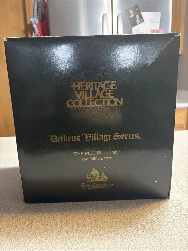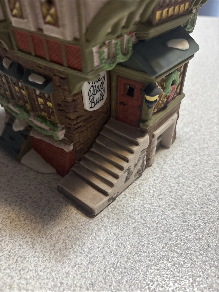 The Vtg. Dept 56 Dickens Village Series The Pied Bull Inn #57517 is a medium-sized ceramic and porcelain Christmas village piece from the late 20th century. Hand-painted in Victorian style, this illuminated and retired piece from 1993 features intricate details and is part of the Dickens Village collection by Department 56. The asymmetrical shape and multicolor design make it a charming addition to any room during the holiday season, showcasing the traditional English villages depicted by Charles Dickens. This collectible piece comes boxed and is a perfect ornament for adults who appreciate nostalgic seasonal decor. Missing light