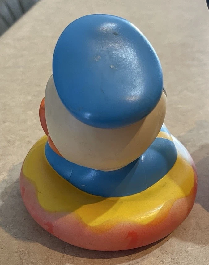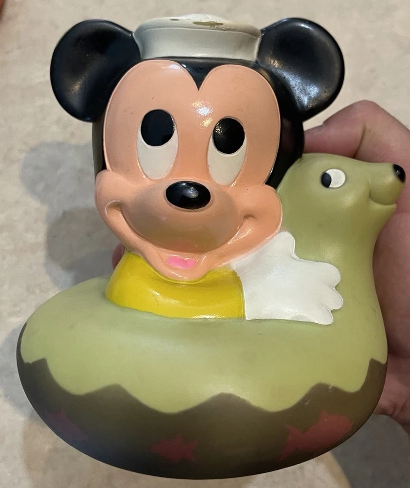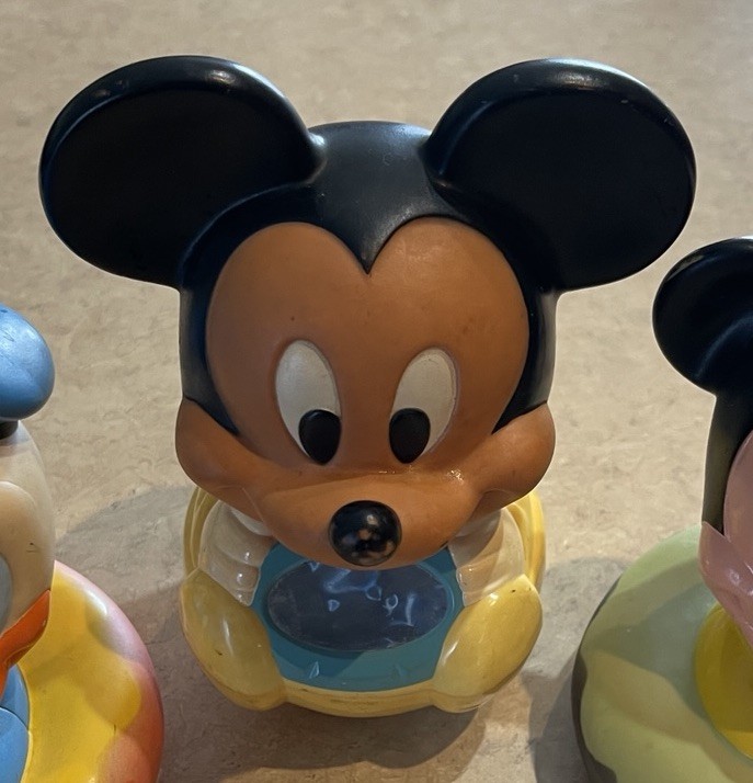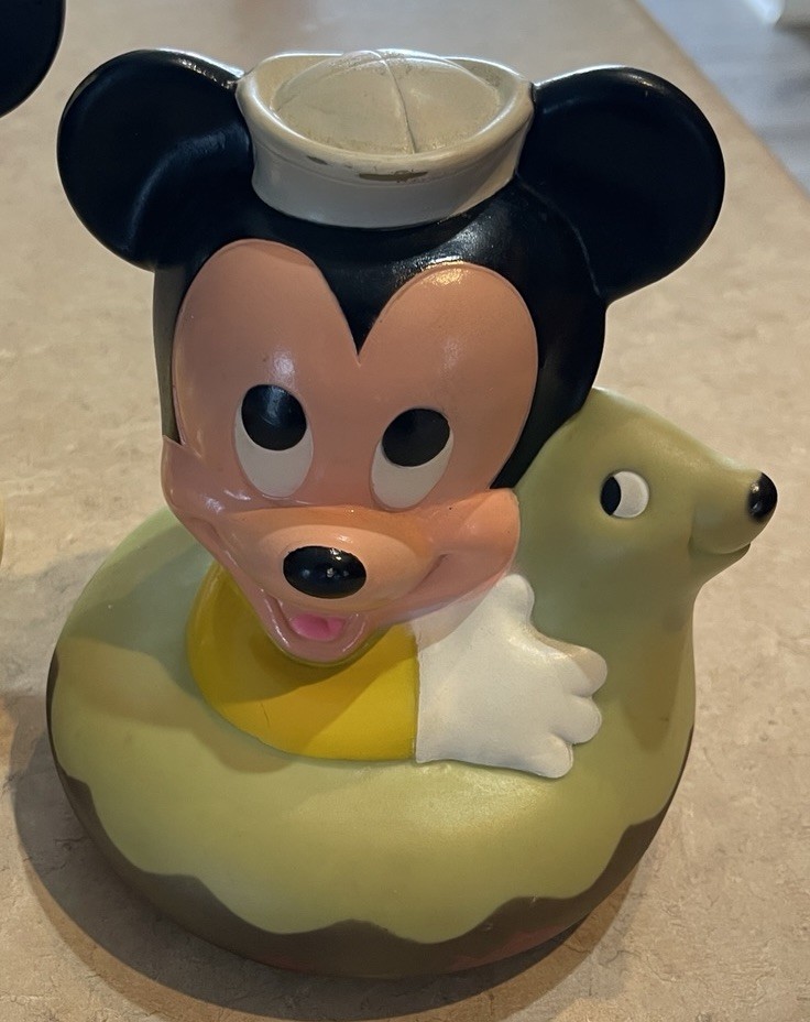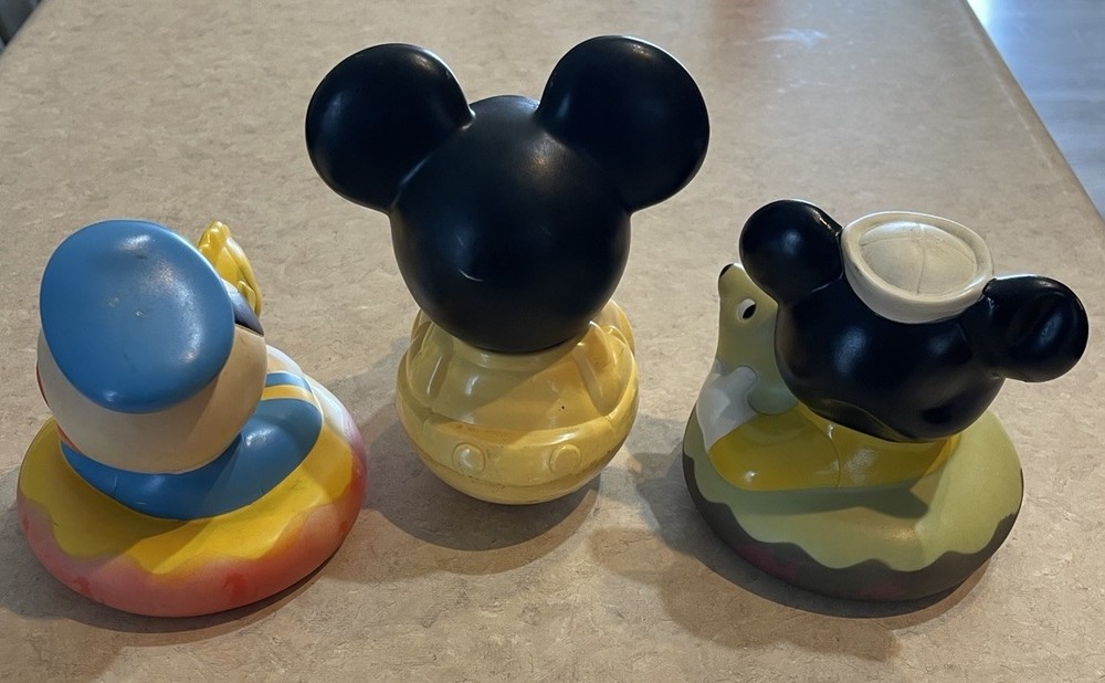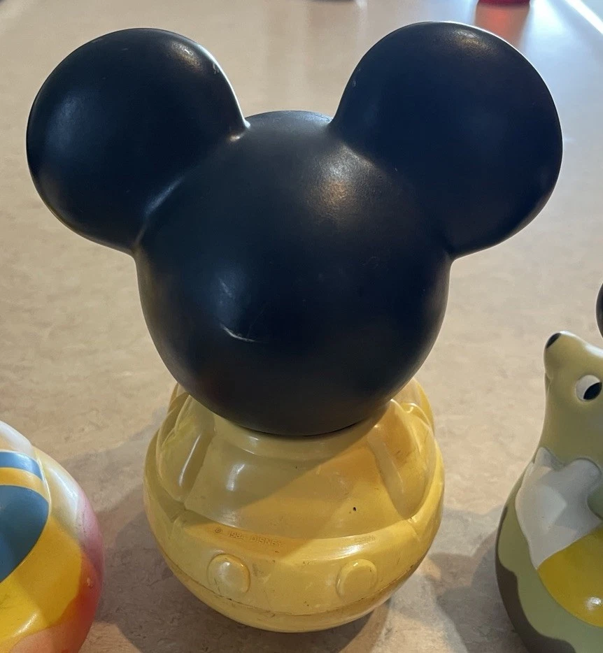 This product is a vintage 1984 Disney 7" Mickey Mouse Roly Poly toy, featuring characters from the Disney franchise. Made in Malaysia, this collectible item includes three bath toys of Mickey Mouse and Donald Duck. Perfect for Disney collectors or fans of classic Disney characters, this nostalgic set is sure to bring smiles to both children and adults alike. These three toys are in preowned used condition, and show some heavy signs of wear. Please see ALL photos for a better idea on condition, any measurements, or details to the toys.