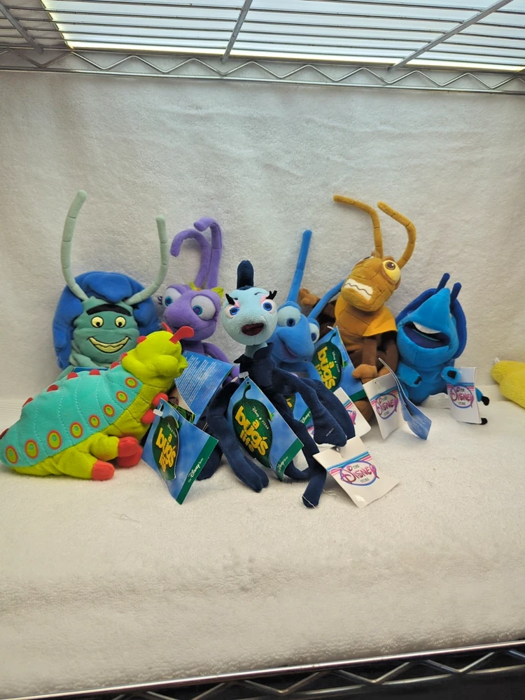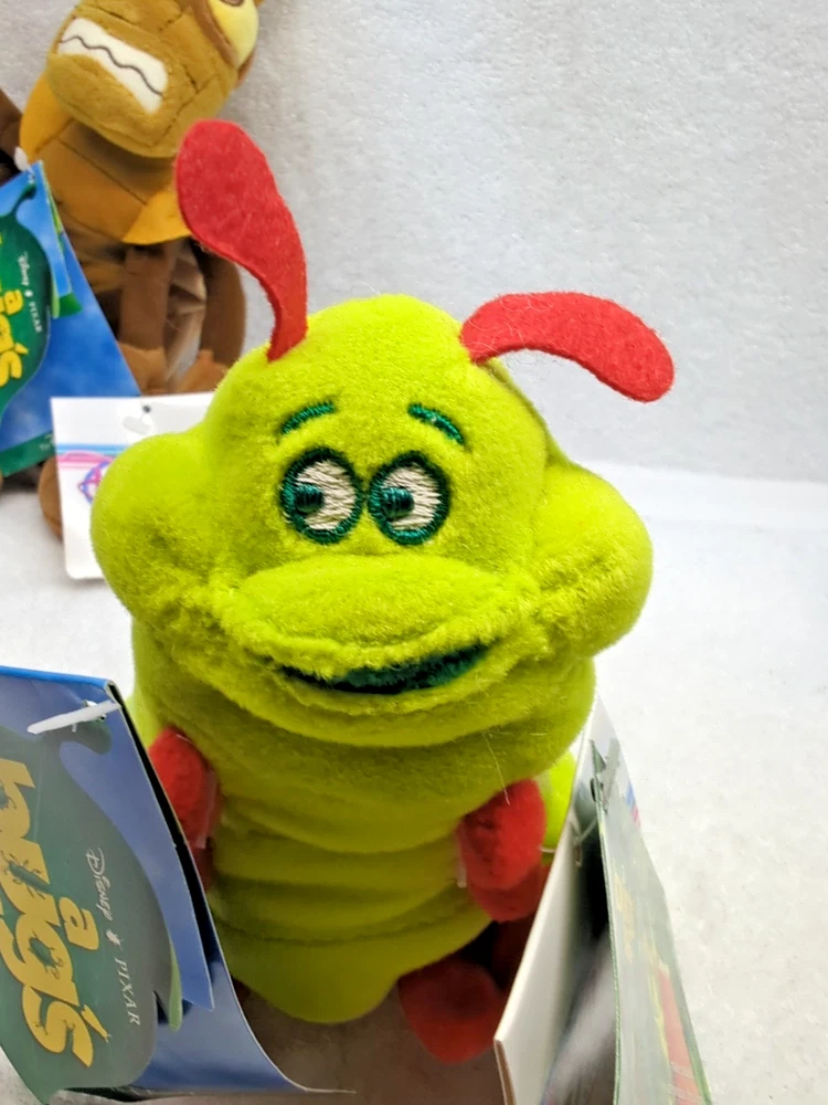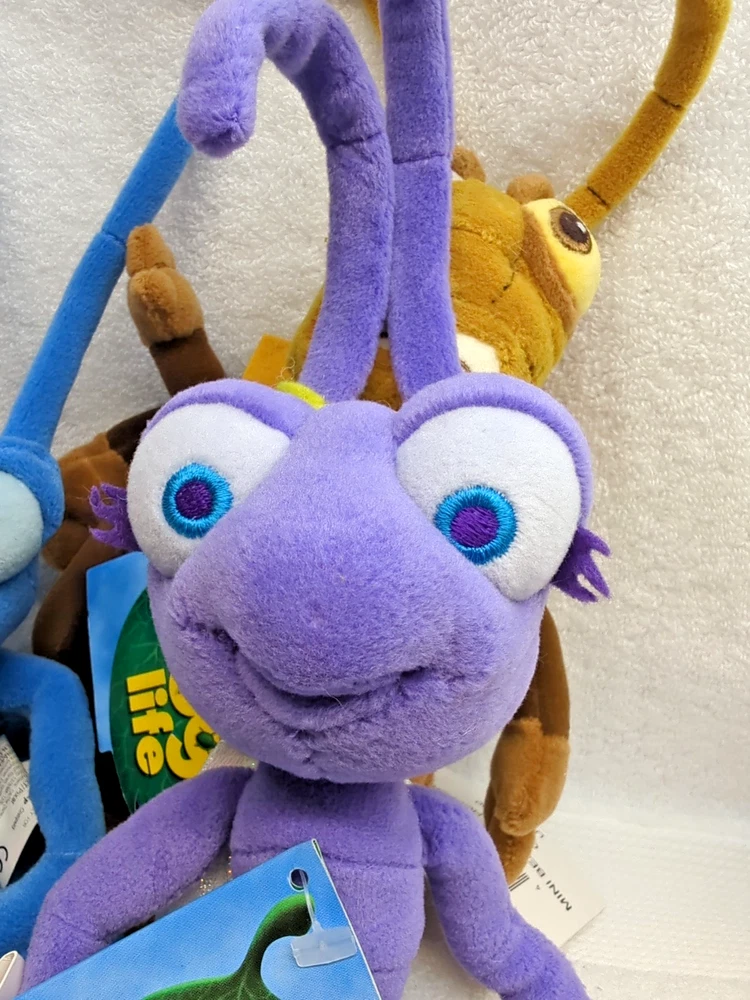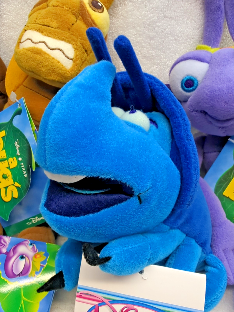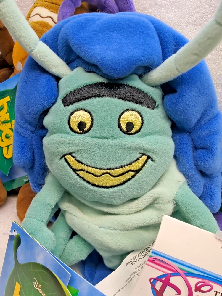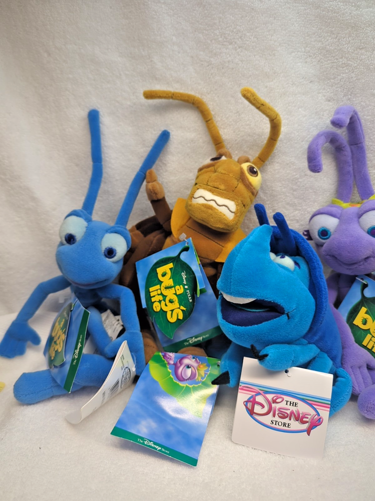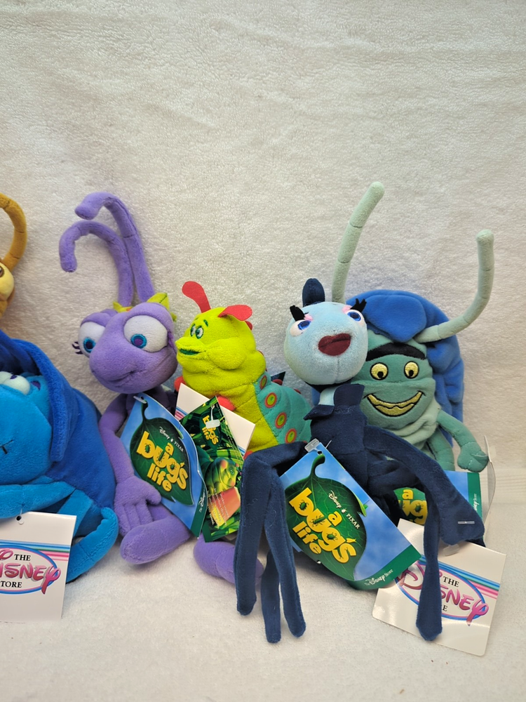 This product is a set of seven vintage Disney Store exclusive plushies from the movie "A Bug's Life." These plush toys feature characters from the film and are brand new with tags attached. The set is described as "fantastic" and is a collector's item for fans of the Disney franchise. Perfect for fans of the movie or Disney collectibles in general, these plushies are sure to bring joy to any collection. NOTE the sound Heimlich does no longer make sound.