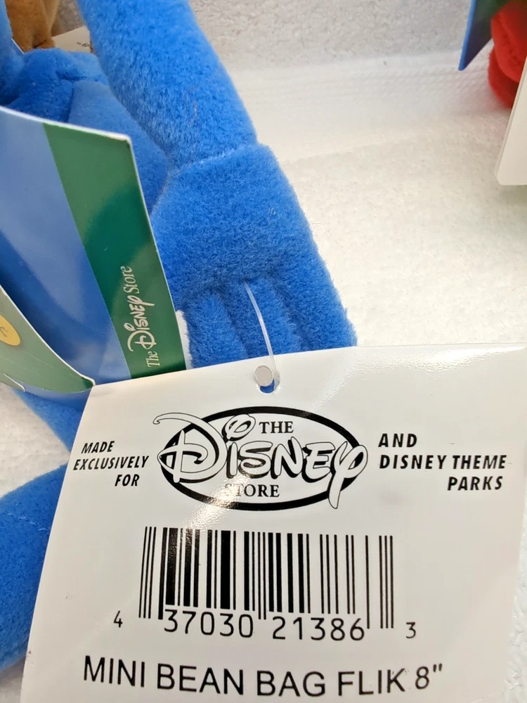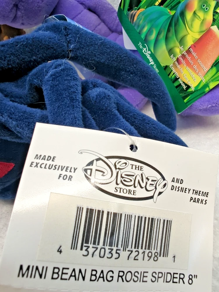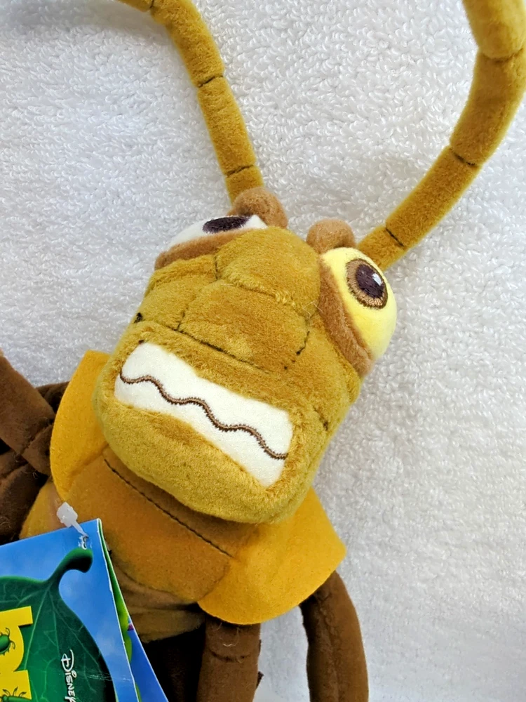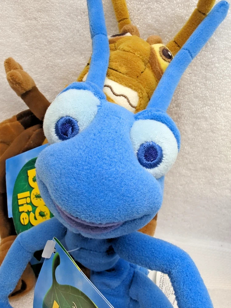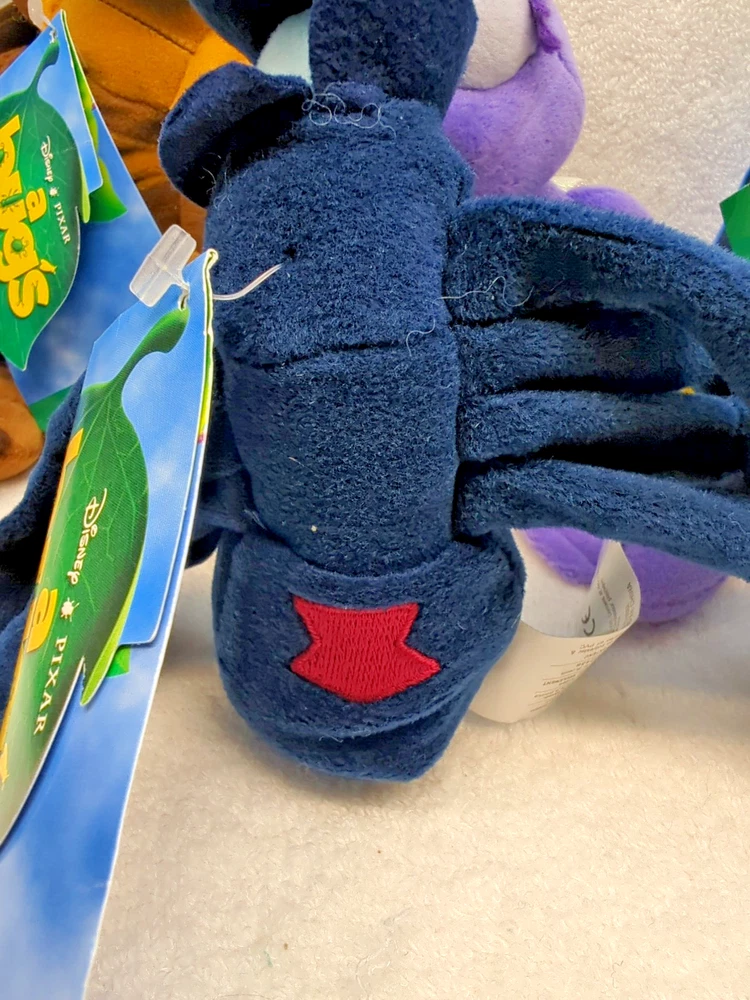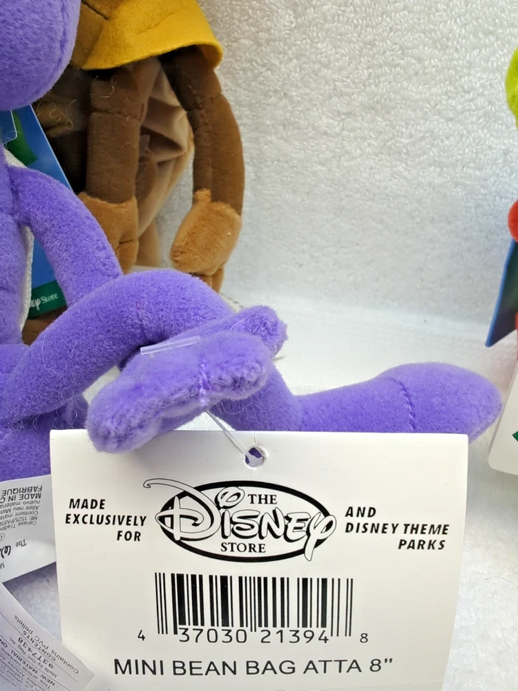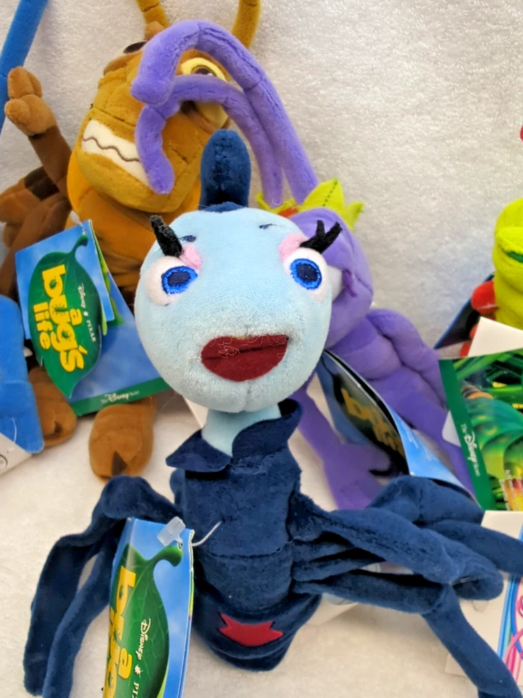 This product is a set of seven vintage Disney Store exclusive plushies from the movie "A Bug's Life." These plush toys feature characters from the film and are brand new with tags attached. The set is described as "fantastic" and is a collector's item for fans of the Disney franchise. Perfect for fans of the movie or Disney collectibles in general, these plushies are sure to bring joy to any collection. NOTE the sound Heimlich does no longer make sound.