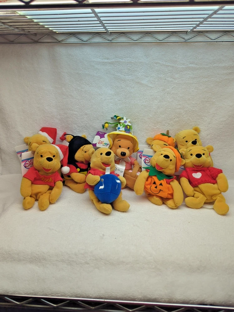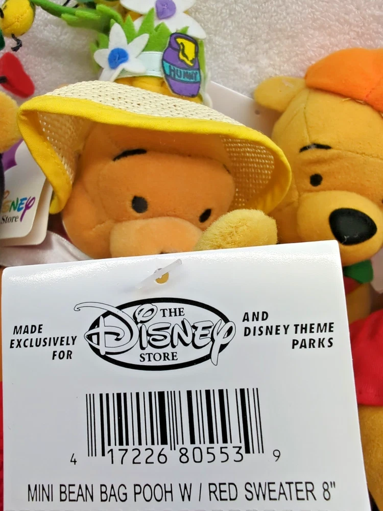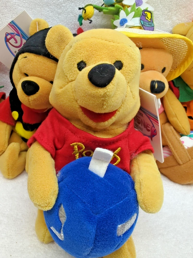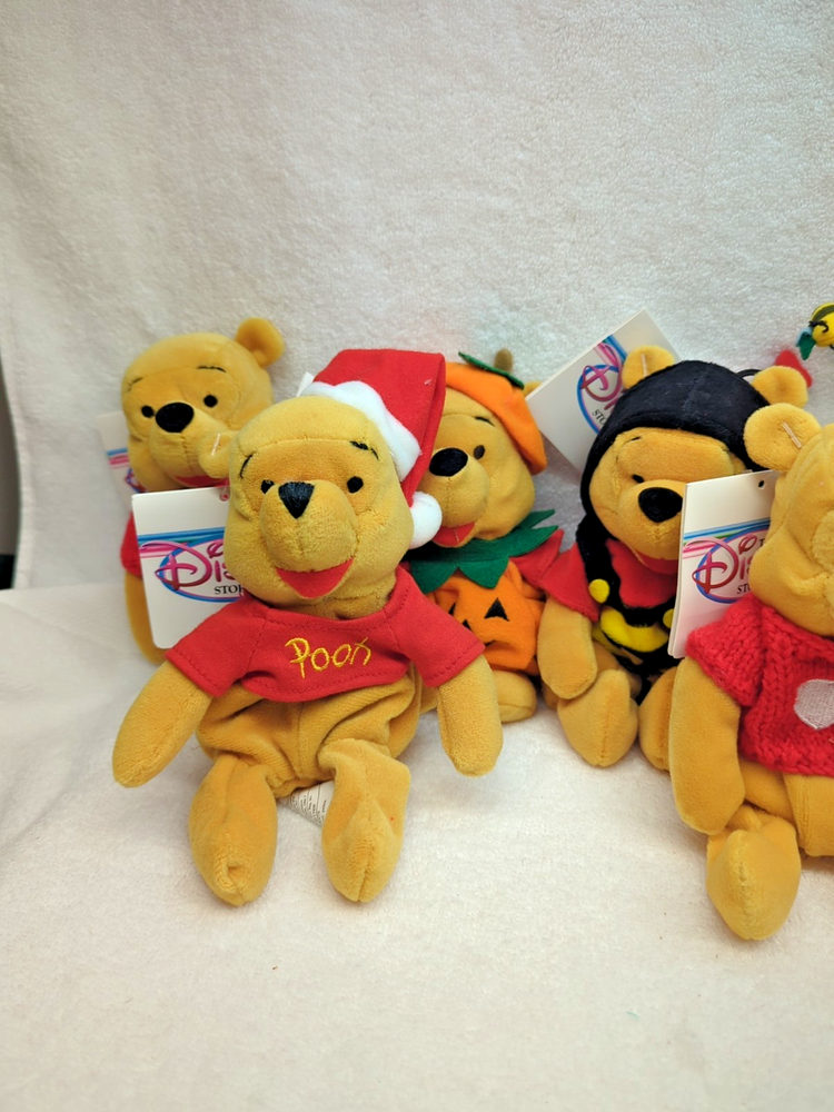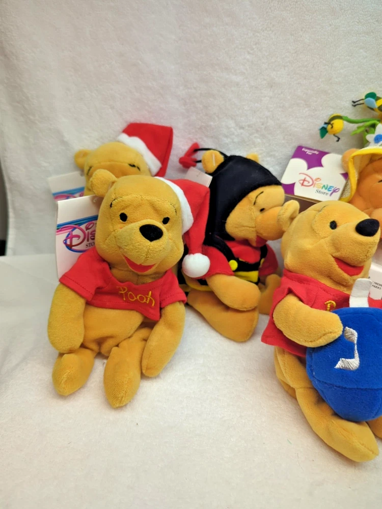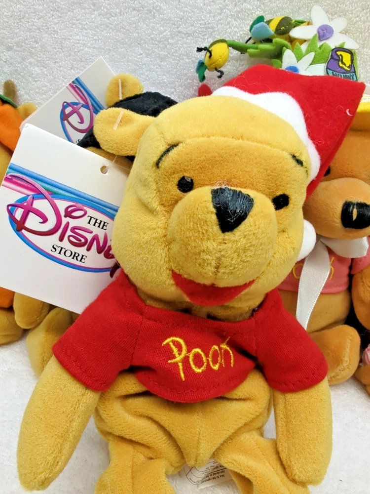 This lot of 9 brand new vintage Disney Store exclusive Winnie the Pooh plush toys are a charming addition to any Disney collection. Each plushie features a different character or scene from the beloved Winnie the Pooh franchise, making them a cute and nostalgic addition to any Disney fan's display. With their original tags still intact, these plush toys are sure to delight collectors and fans alike with their adorable designs and high-quality construction.