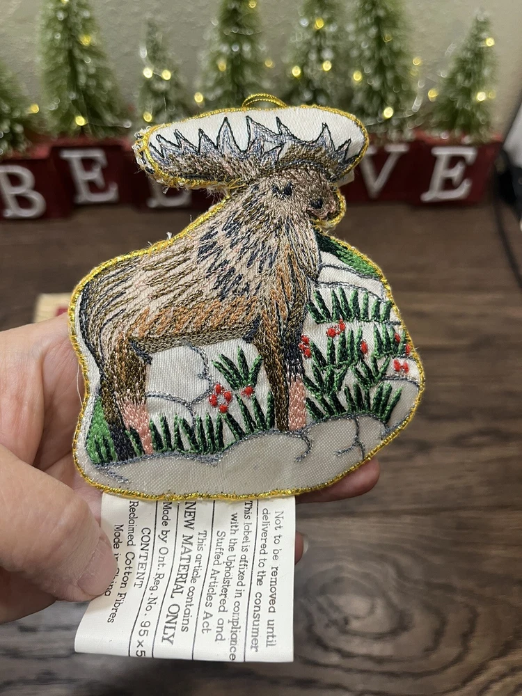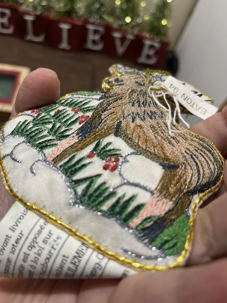 This vintage EATON embroidered reindeer Christmas ornament from 1994 is a must-have for any collector. The intricate details on the boxing-themed ornament make it a unique addition to your collection. The ornament measures 4.25 inches and comes in its original box. The set includes one ornament and is an original, licensed reproduction. The reindeer's shape and the embroidered features make it a perfect addition to your holiday and seasonal ornament collection. This collectible item is a great way to add a touch of vintage charm to your decor. Preowned in good condition other than a few loose strings along the edge and also some light discoloration of the white satin base. Could be from handling, but there’s also a spot where the glue has soaked through the material. Basically in great condition for its age. Please see close-up pictures for details.
